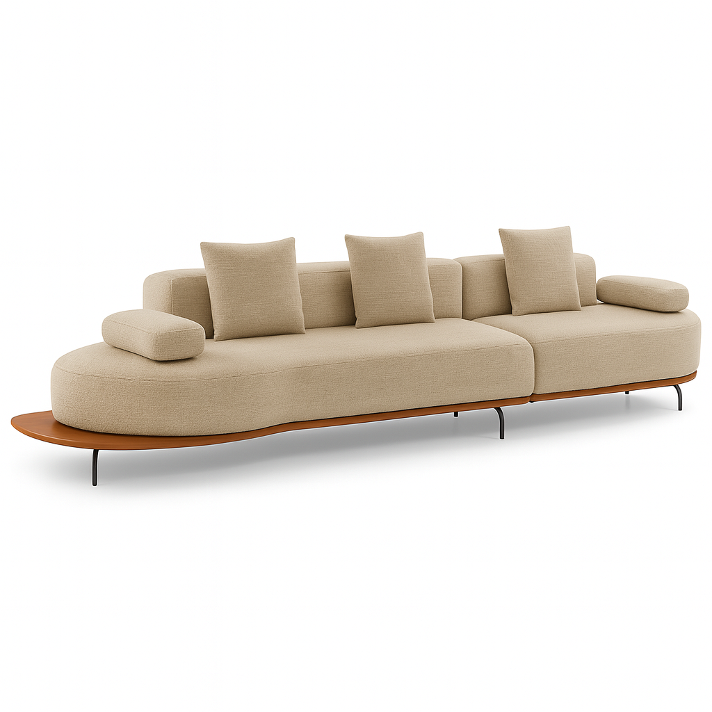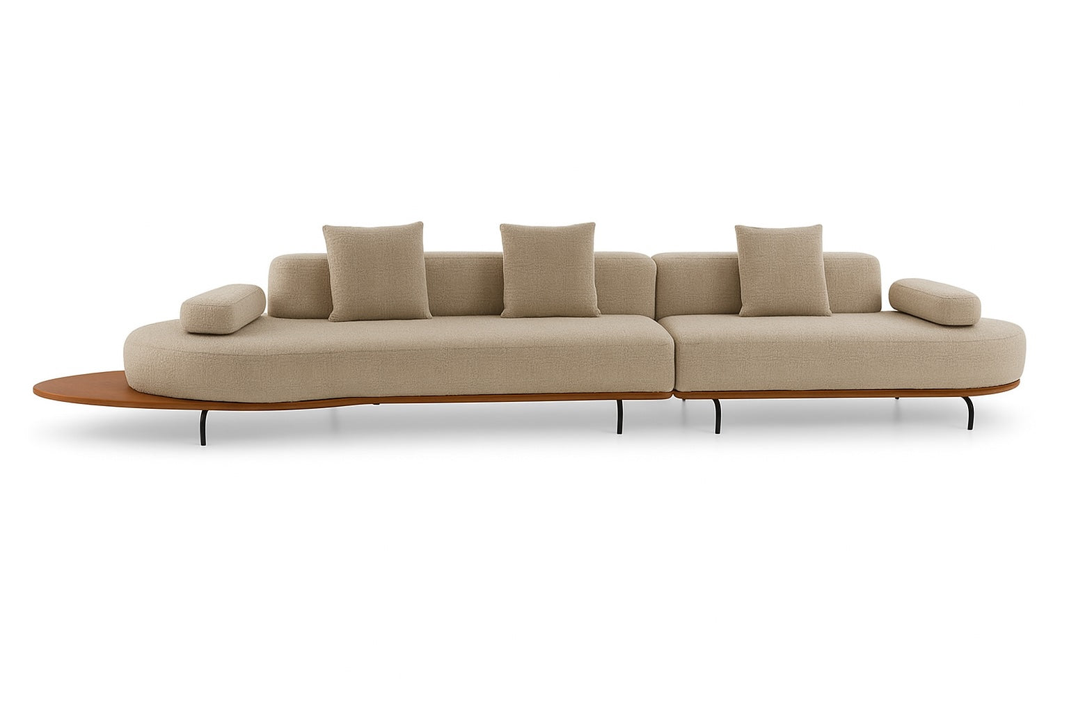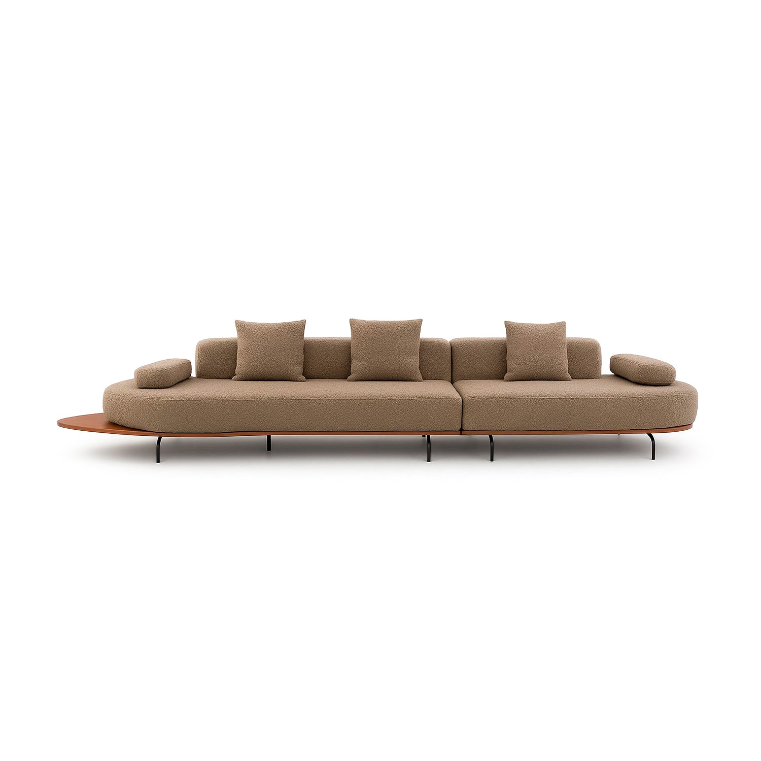 Se compone de dos módulos: uno de 1,30 m con apoyabrazos, y otro de 2,35 m con apoyabrazos y una mesa integrada en el extremo izquierdo, que aporta funcionalidad y equilibrio visual al conjunto. Esta disposición modular permite adaptarlo con naturalidad a distintos espacios, manteniendo siempre una estética limpia y armónica.