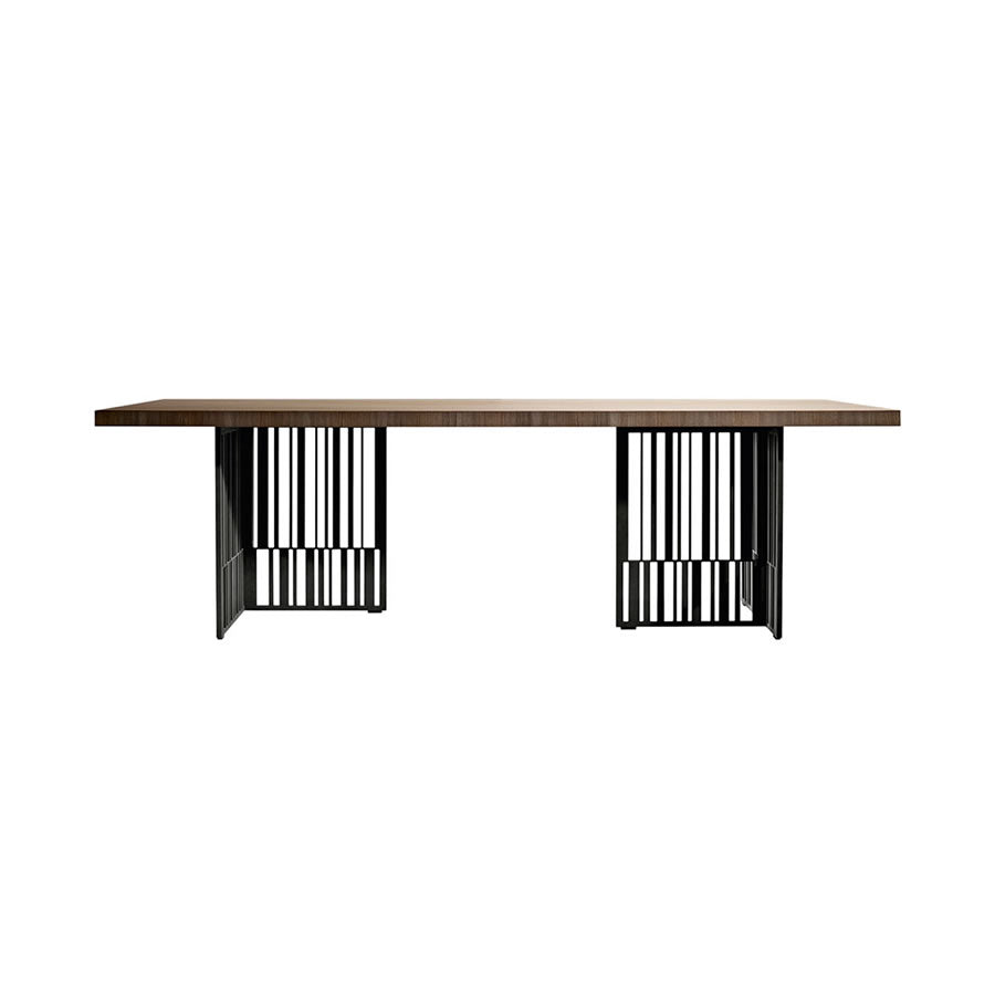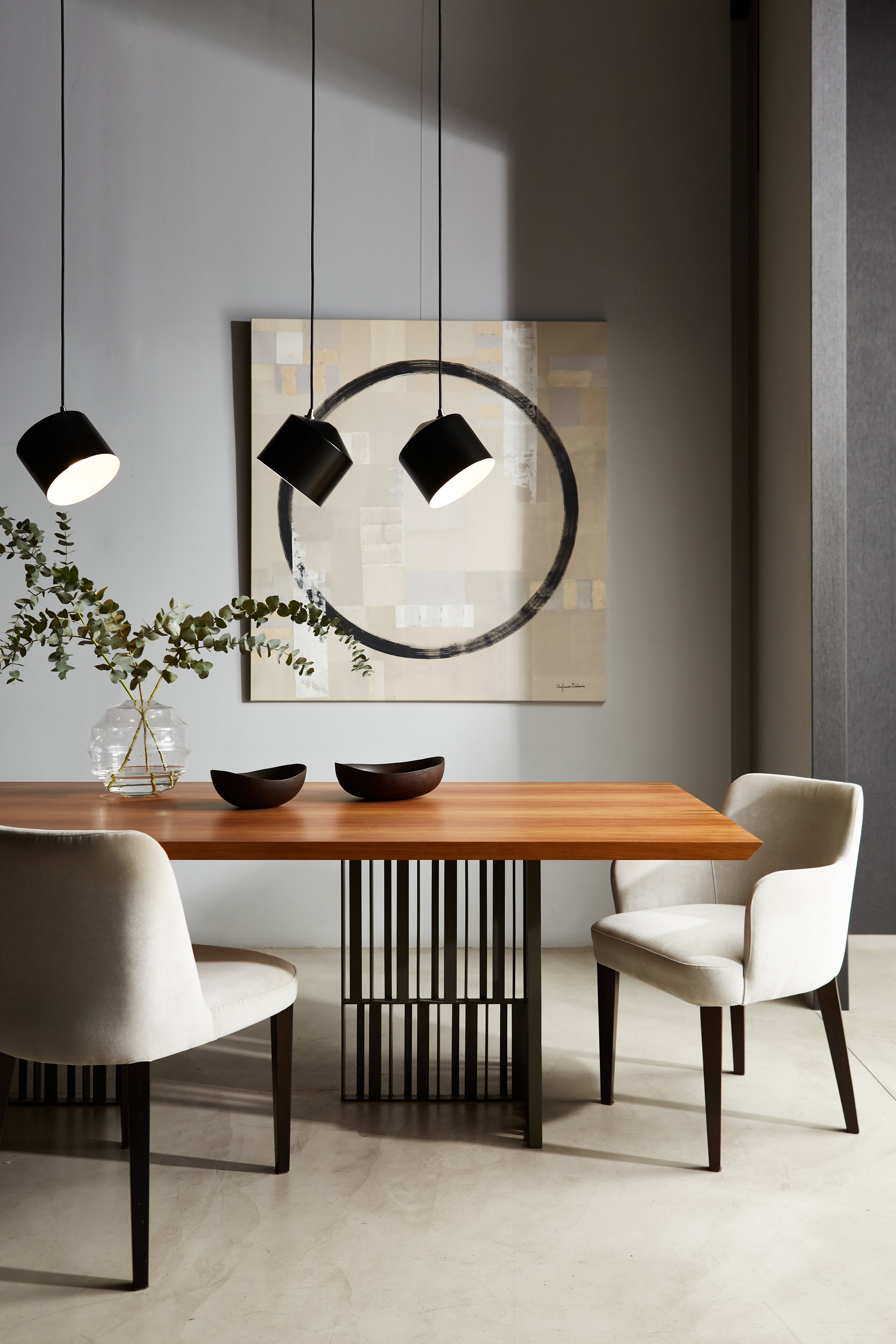 La mesa de comedor Alberti tiene una tapa de madera enchapada en guindo, lustrada al poliuretano mate, lo que le da un aspecto elegante y natural. La base de hierro negro epoxi al horno proporciona estabilidad y resistencia, asegurando que la mesa dure por mucho tiempo.
