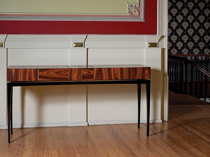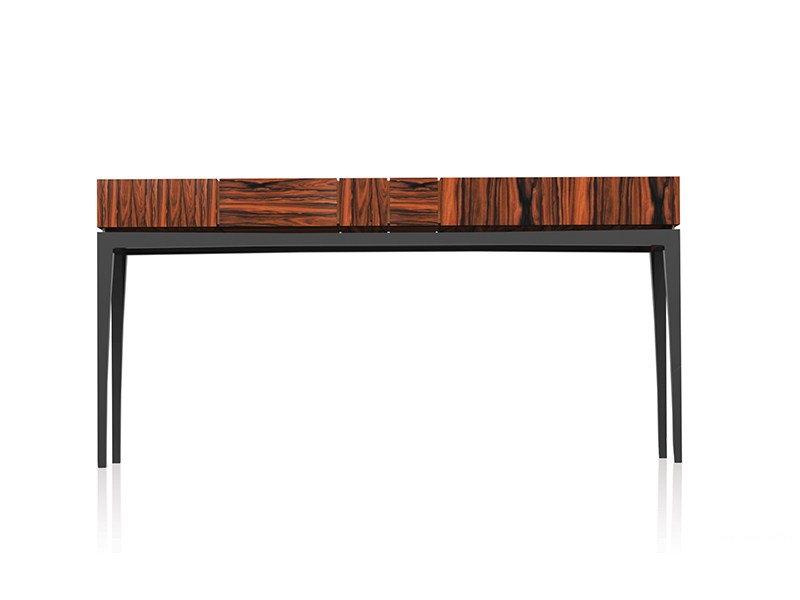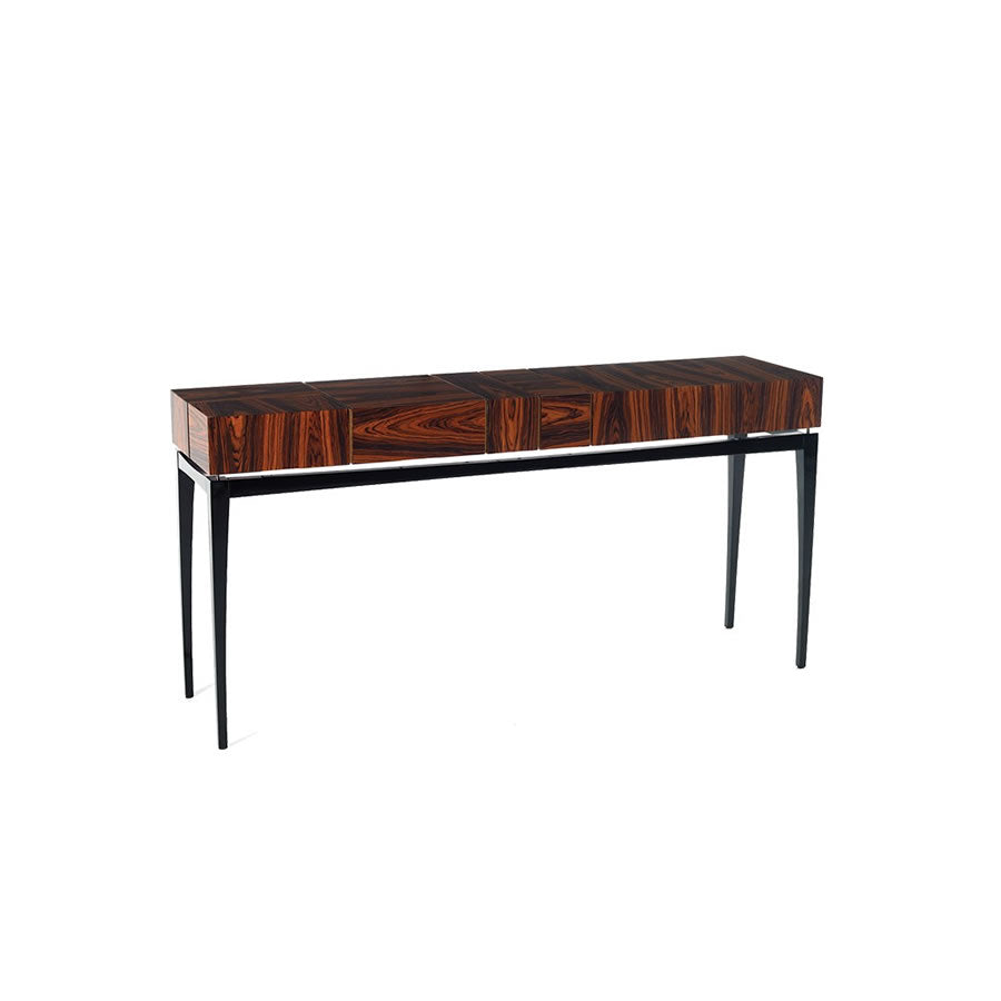 La consola Alem está fabricada con madera de ébano de Macassar, lustrada al poliuretano semi-brillo, lo que le da un aspecto elegante y sofisticado. La base es en hierro negro epoxi, que le da estabilidad y resistencia.