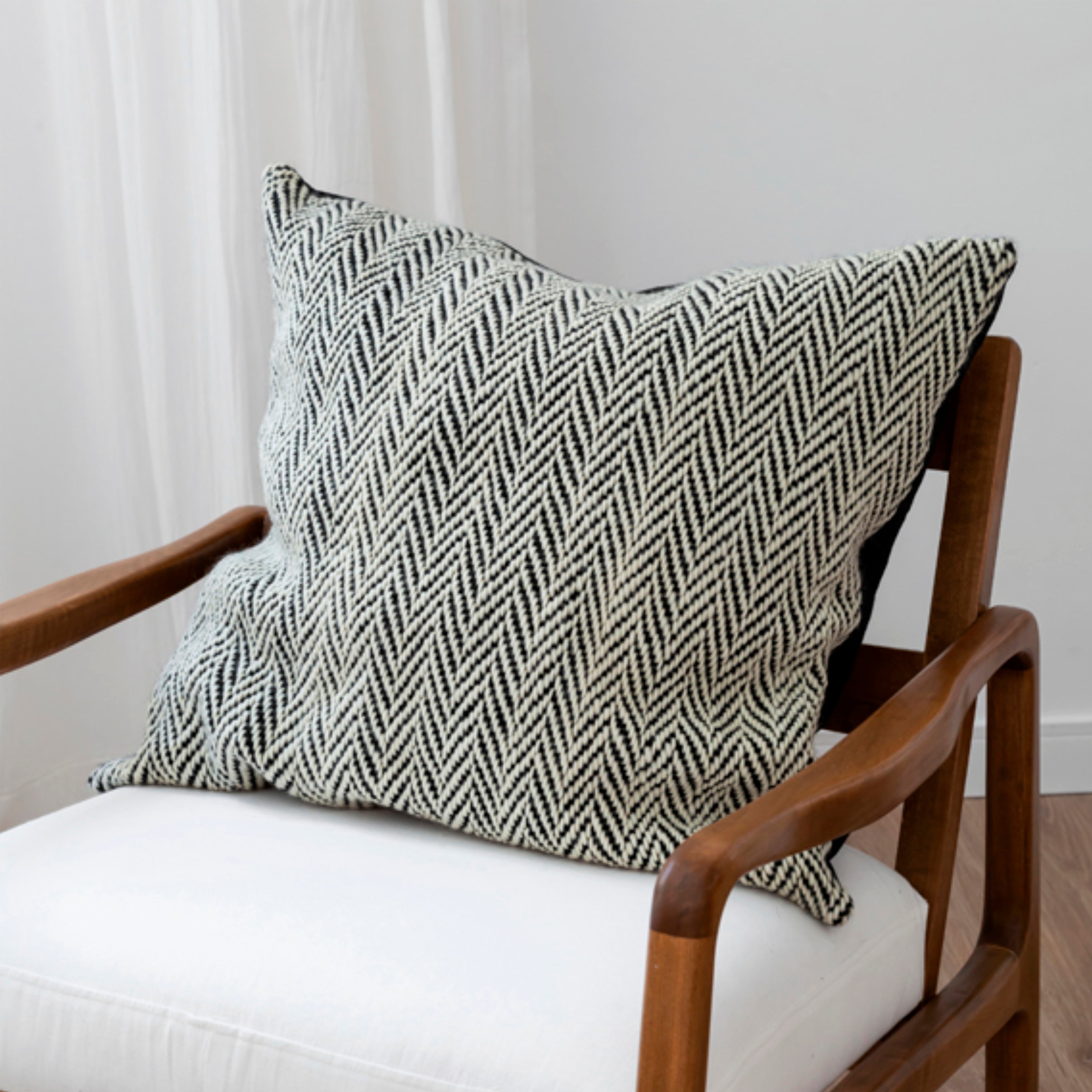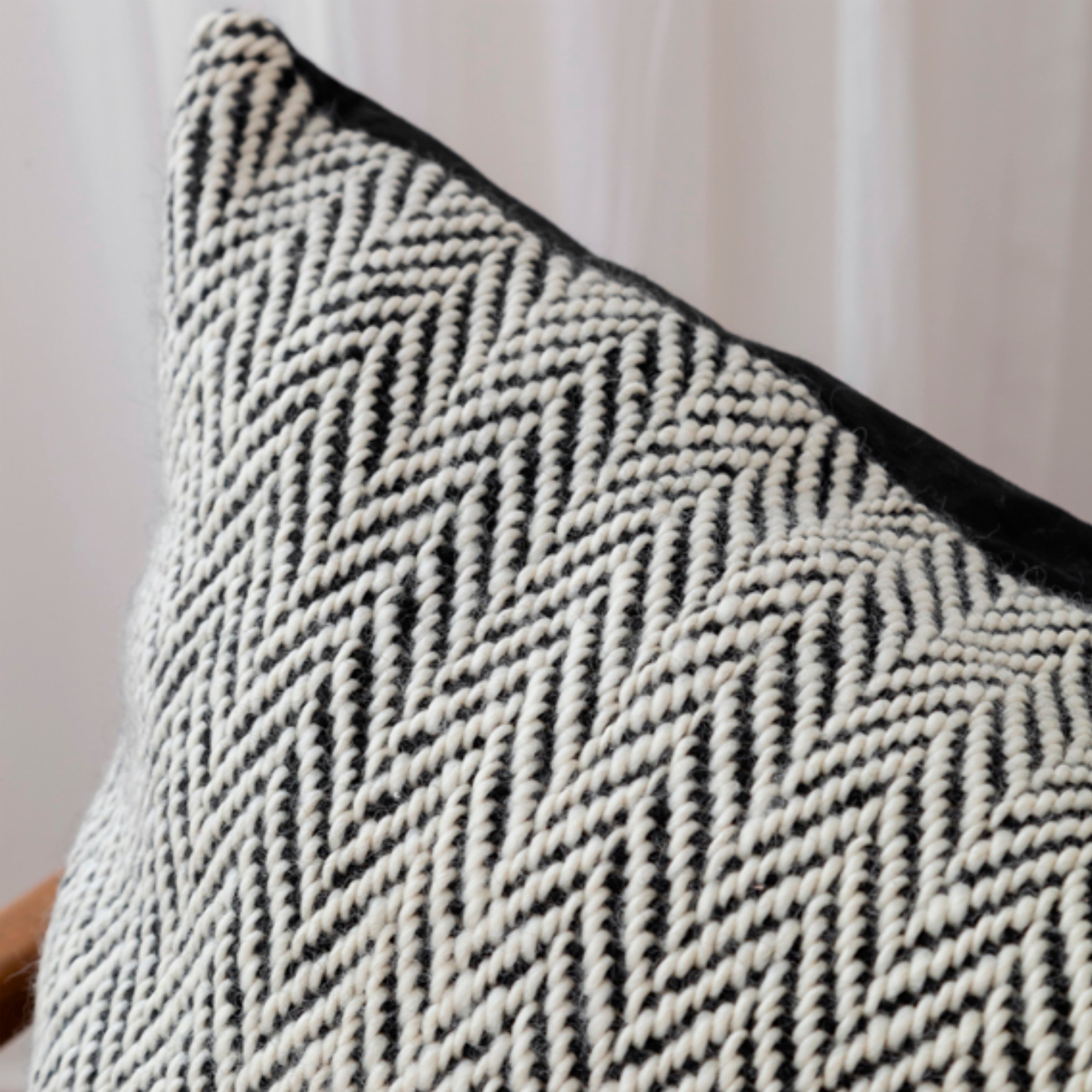 Almohadón tejido en lana merino pura, reconocida por su suavidad, calidez y textura delicada. Su diseño artesanal aporta un toque acogedor y elegante, ideal para realzar cualquier espacio con estilo y confort. La contratapa está confeccionada en tela negra de alta calidad, creando un contraste sofisticado y versátil. Cuenta con un cierre invisible, lo que permite un acabado prolijo y facilita la remoción para su limpieza. Perfecto para decorar salas de estar, dormitorios o espacios de descanso con un aire cálido y distinguido.