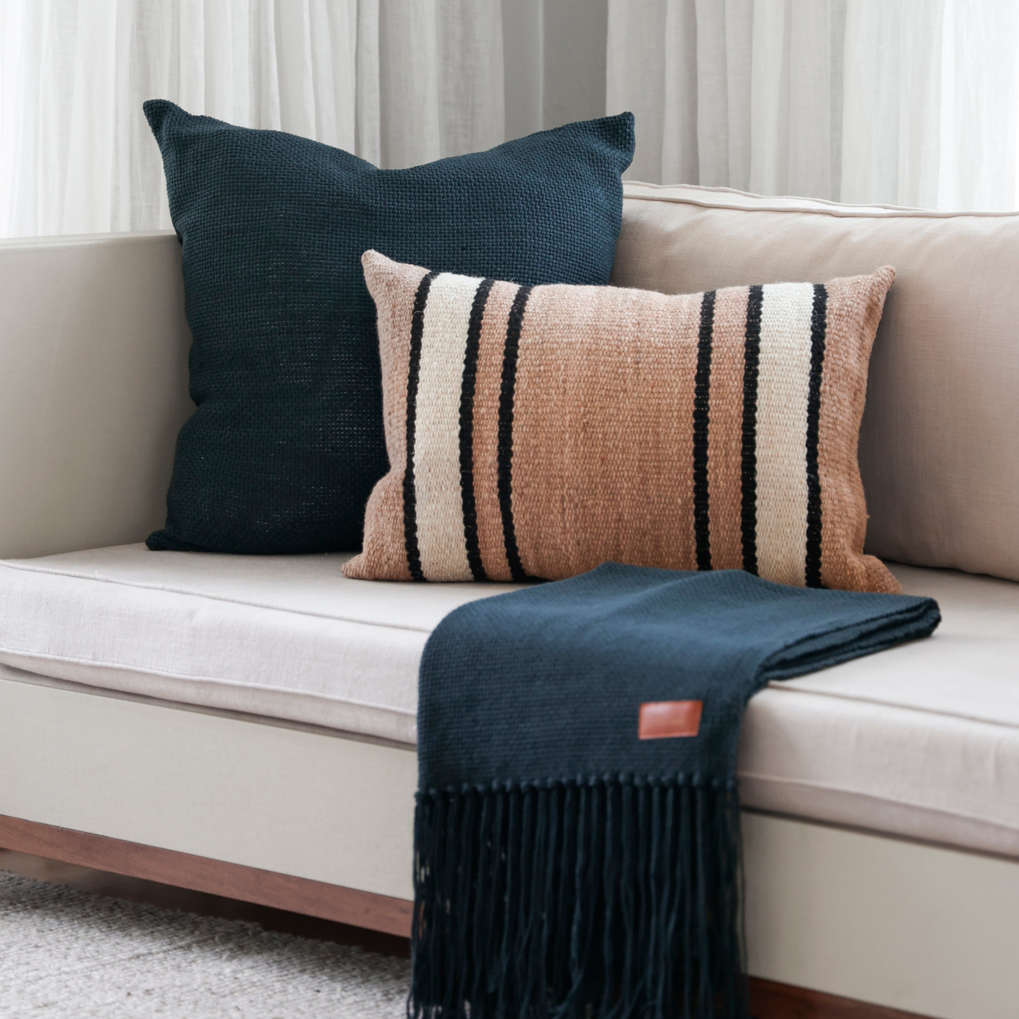 Los almohadones Filomena están confeccionados en algodón puro, destacándose por su textura suave y natural, ideal para crear espacios acogedores y elegantes.