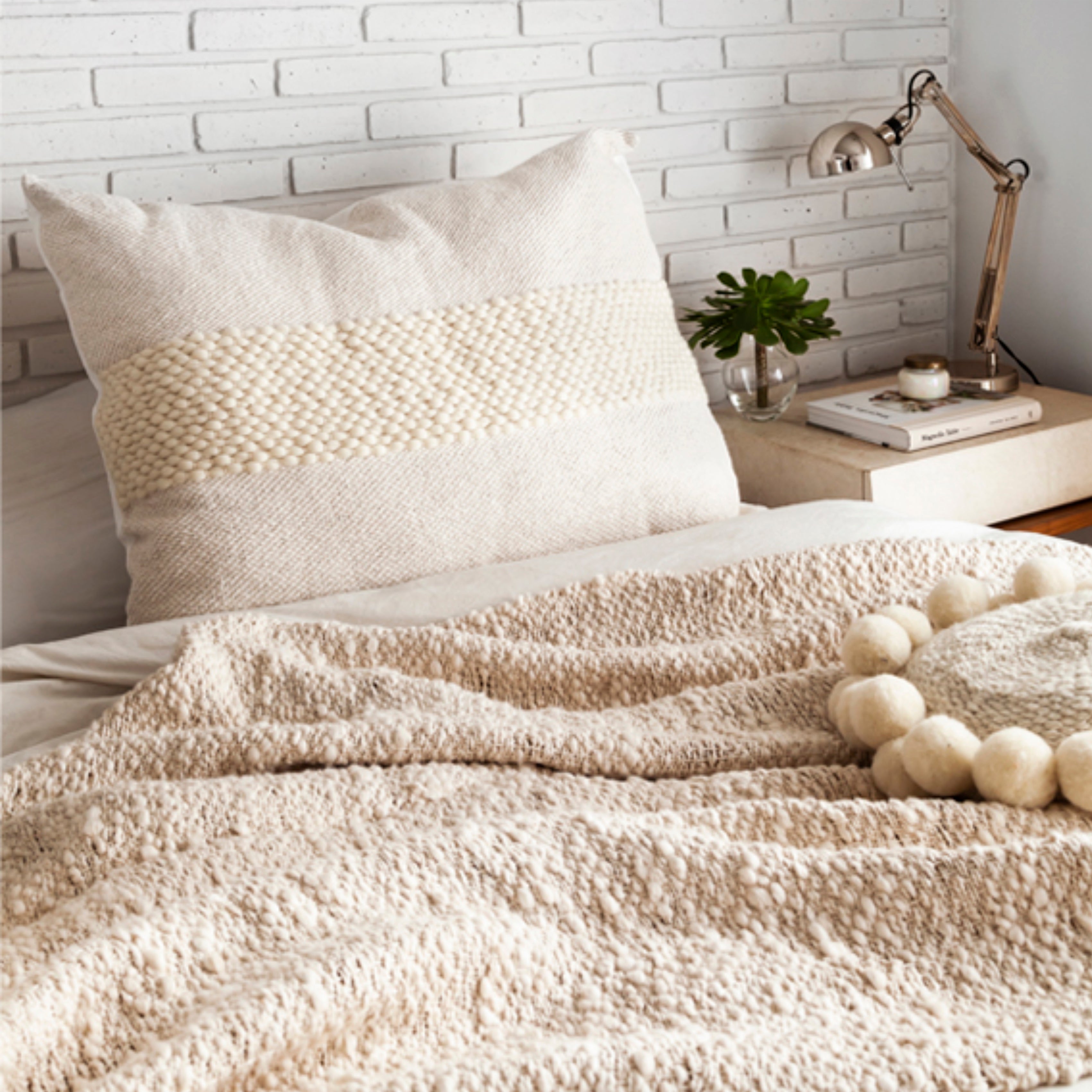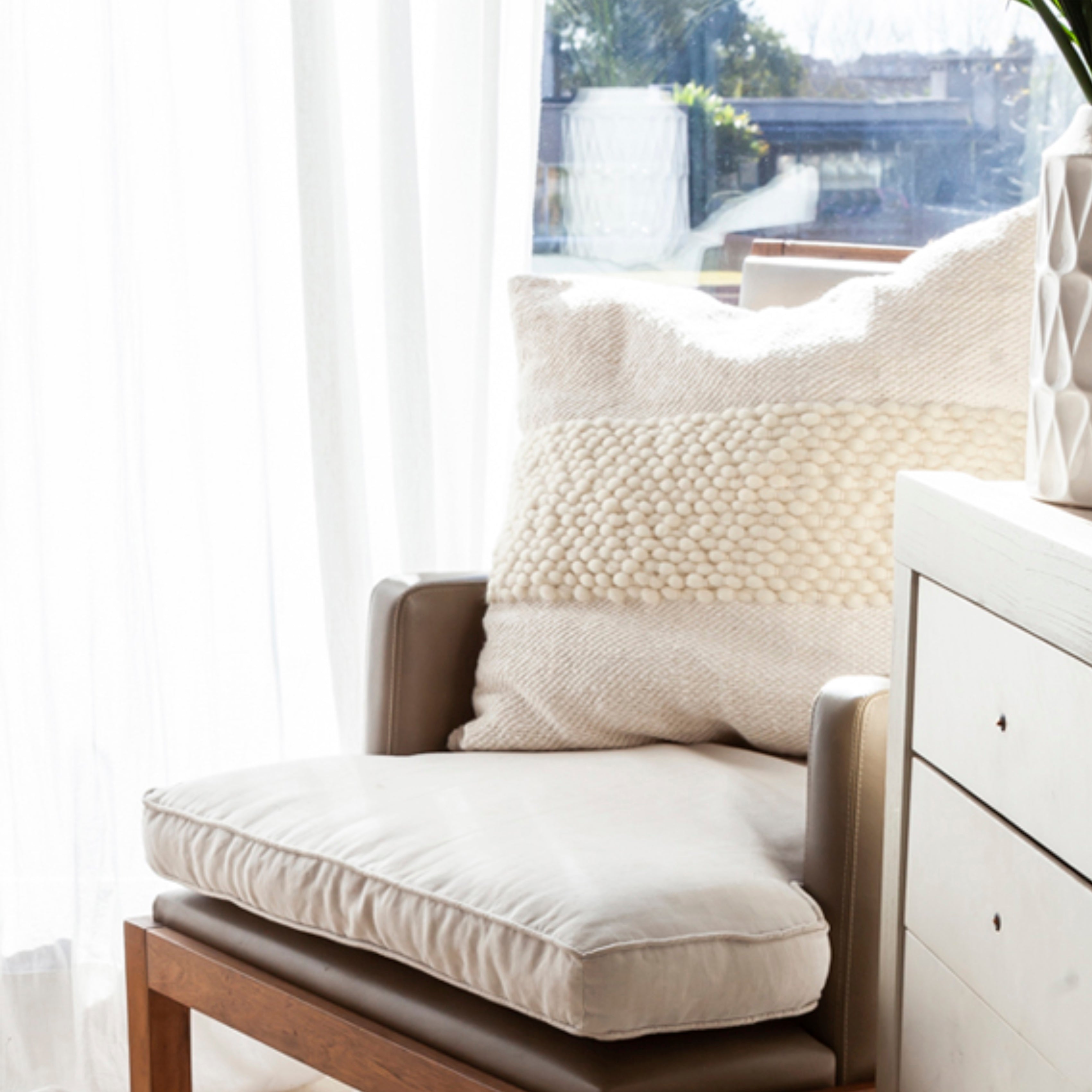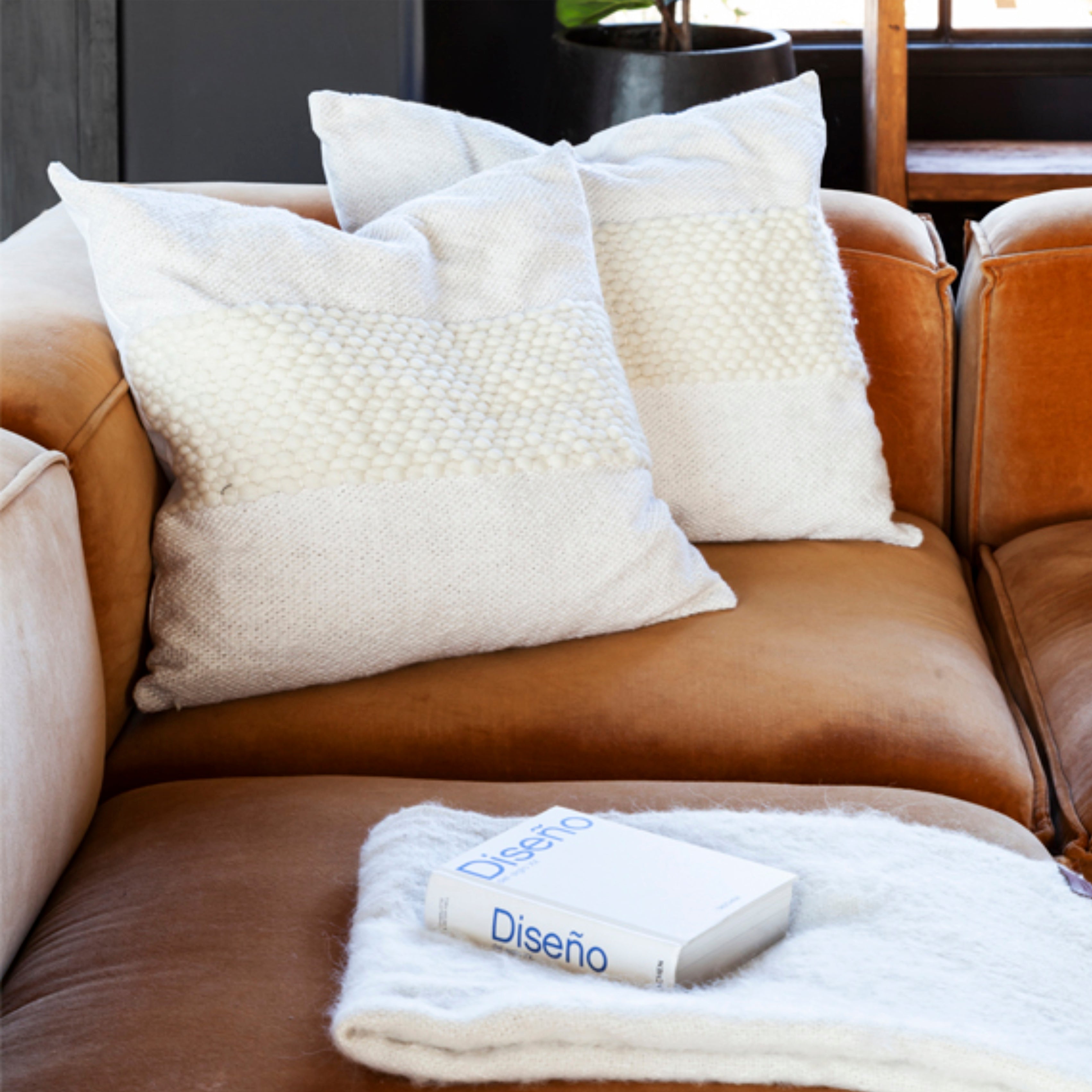 Almohadón confeccionado en algodón natural de gran suavidad, con detalles en lana merino, que aportan una textura rica y sofisticada. Ideal para agregar calidez y estilo a cualquier ambiente.