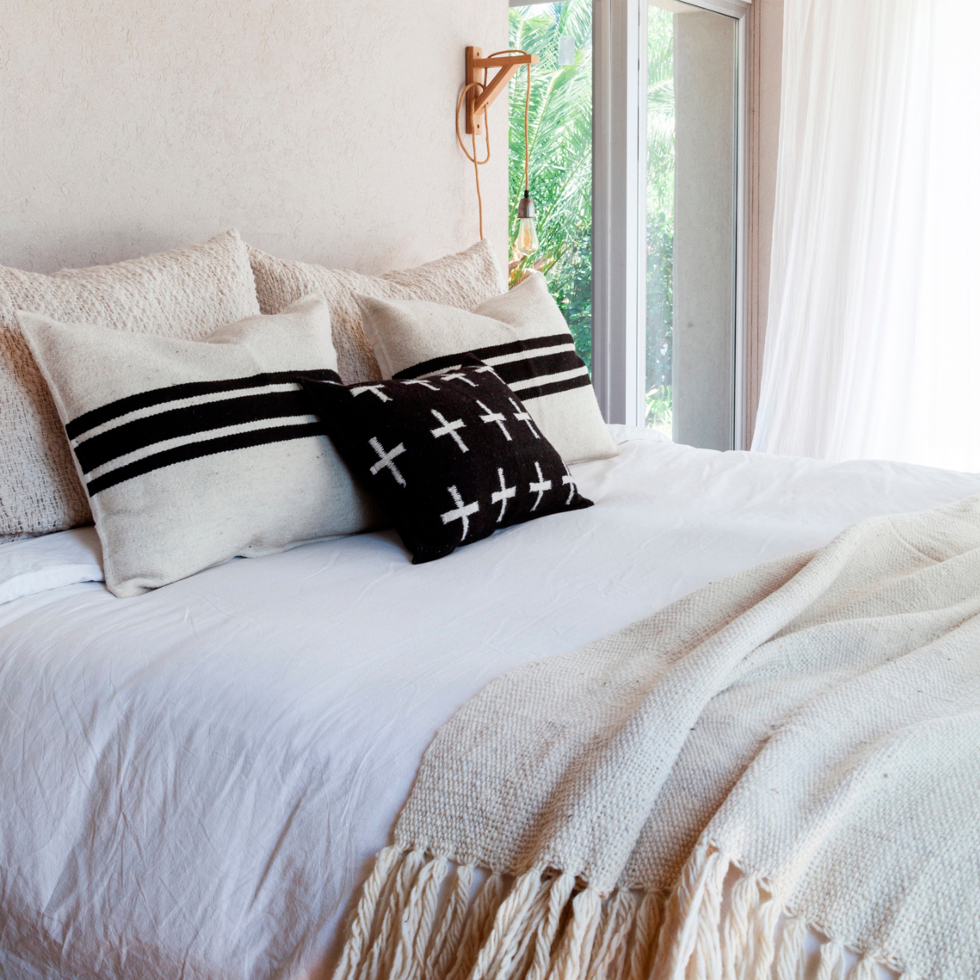 Almohadón artesanal tejido en lana natural, ofreciendo una textura cálida y acogedora. La contratapa está confeccionada en tela offwhite de alta calidad, complementando su diseño con un cierre invisible que garantiza un acabado prolijo y sofisticado.