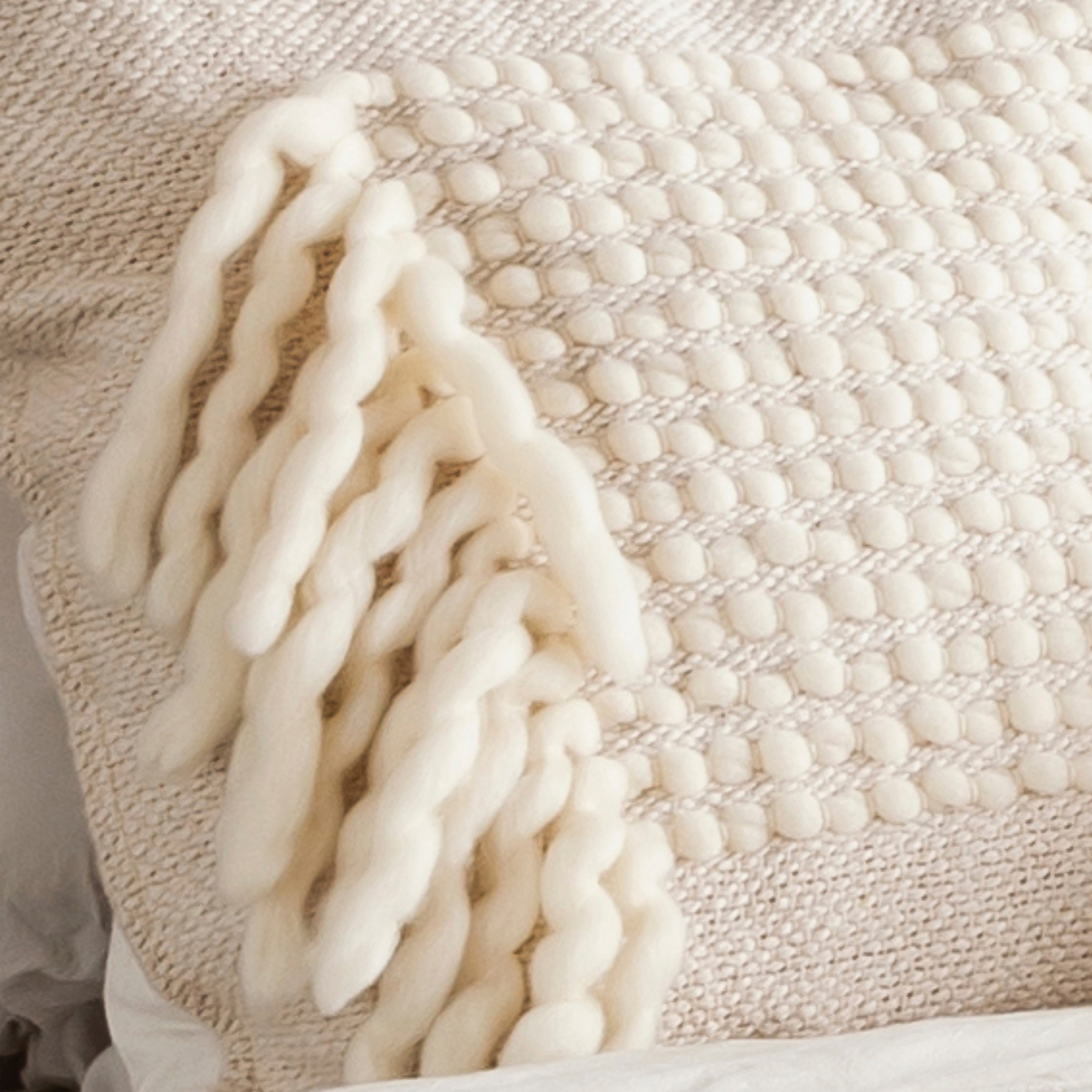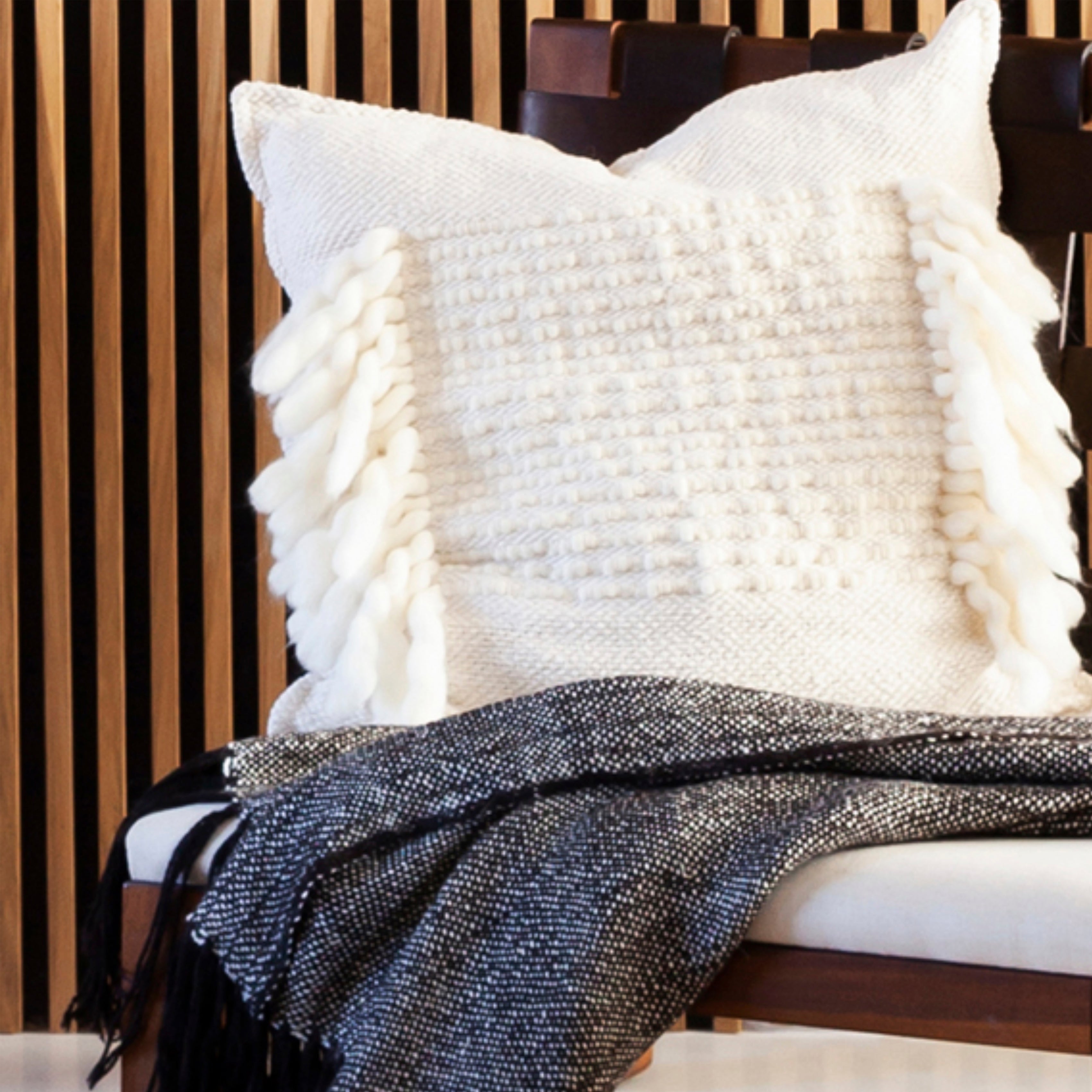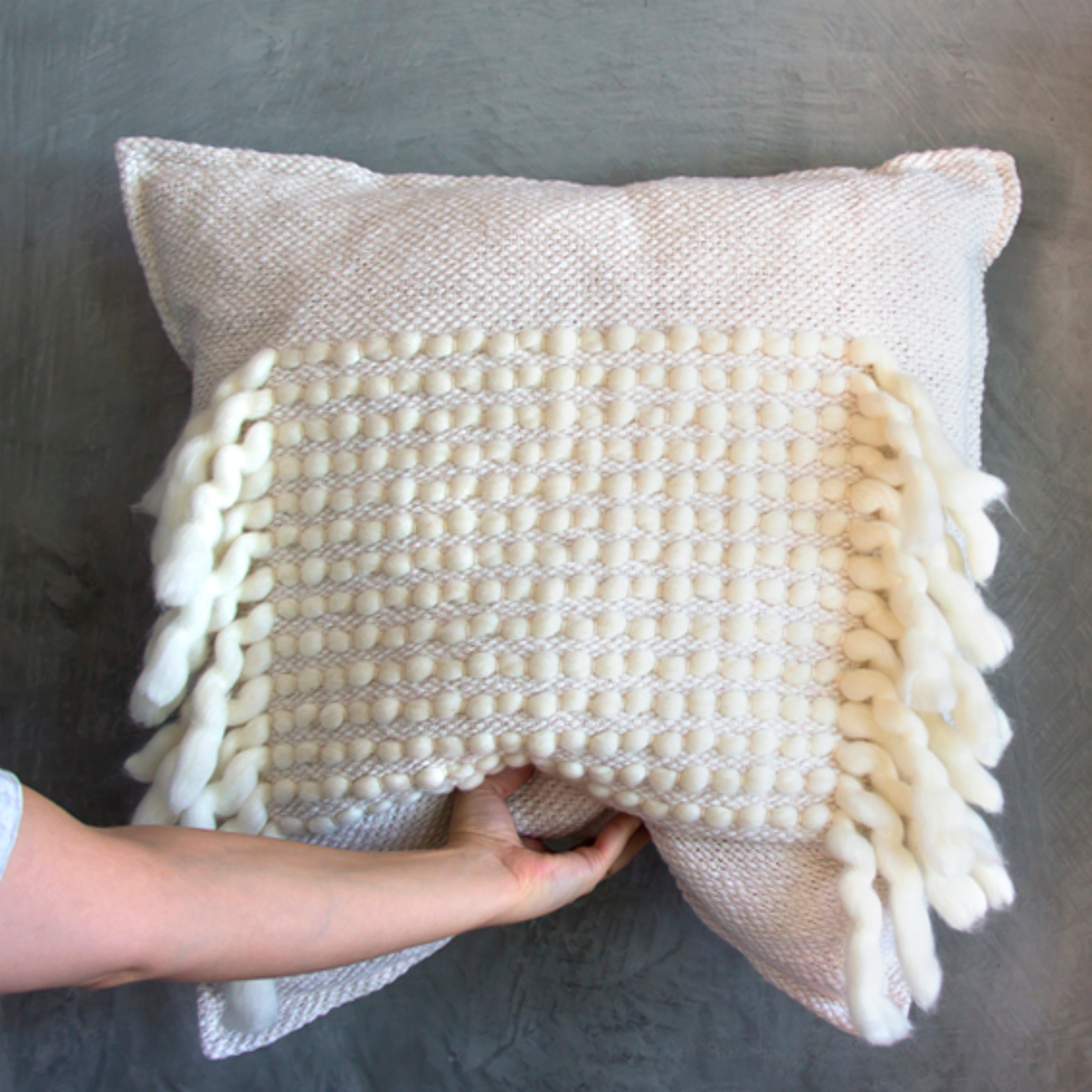 Almohadón tejido en algodón natural, combinado con detalles en lana merino que le brindan un toque de suavidad y sofisticación. Su diseño simple y elegante lo convierte en una pieza perfecta para cualquier rincón de la casa.