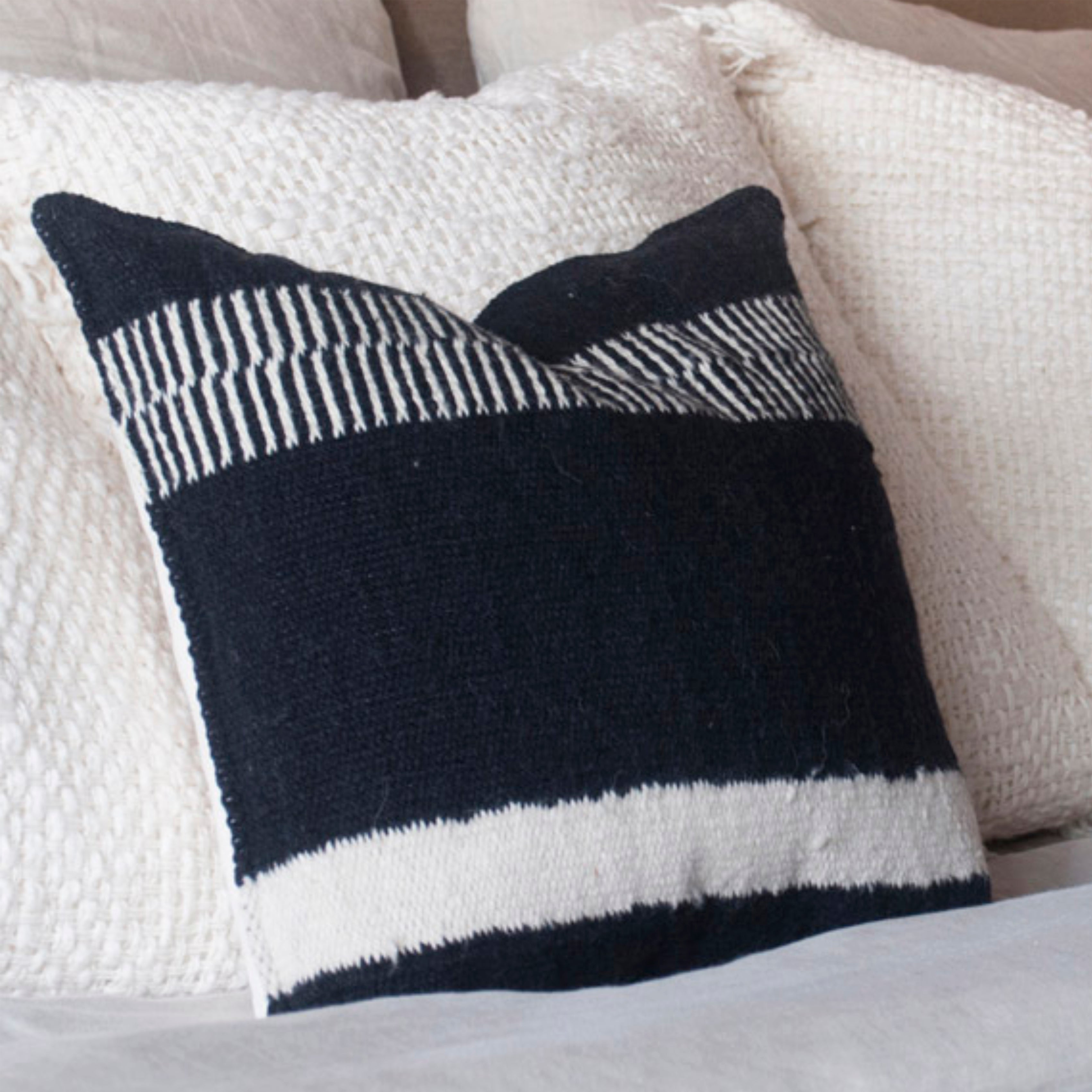 Almohadón tejido en lana natural, de textura suave y acogedora, ideal para sumar calidez y estilo a cualquier ambiente. La contratapa, en tela offwhite de alta calidad, cuenta con un cierre invisible que aporta un acabado prolijo y elegante.