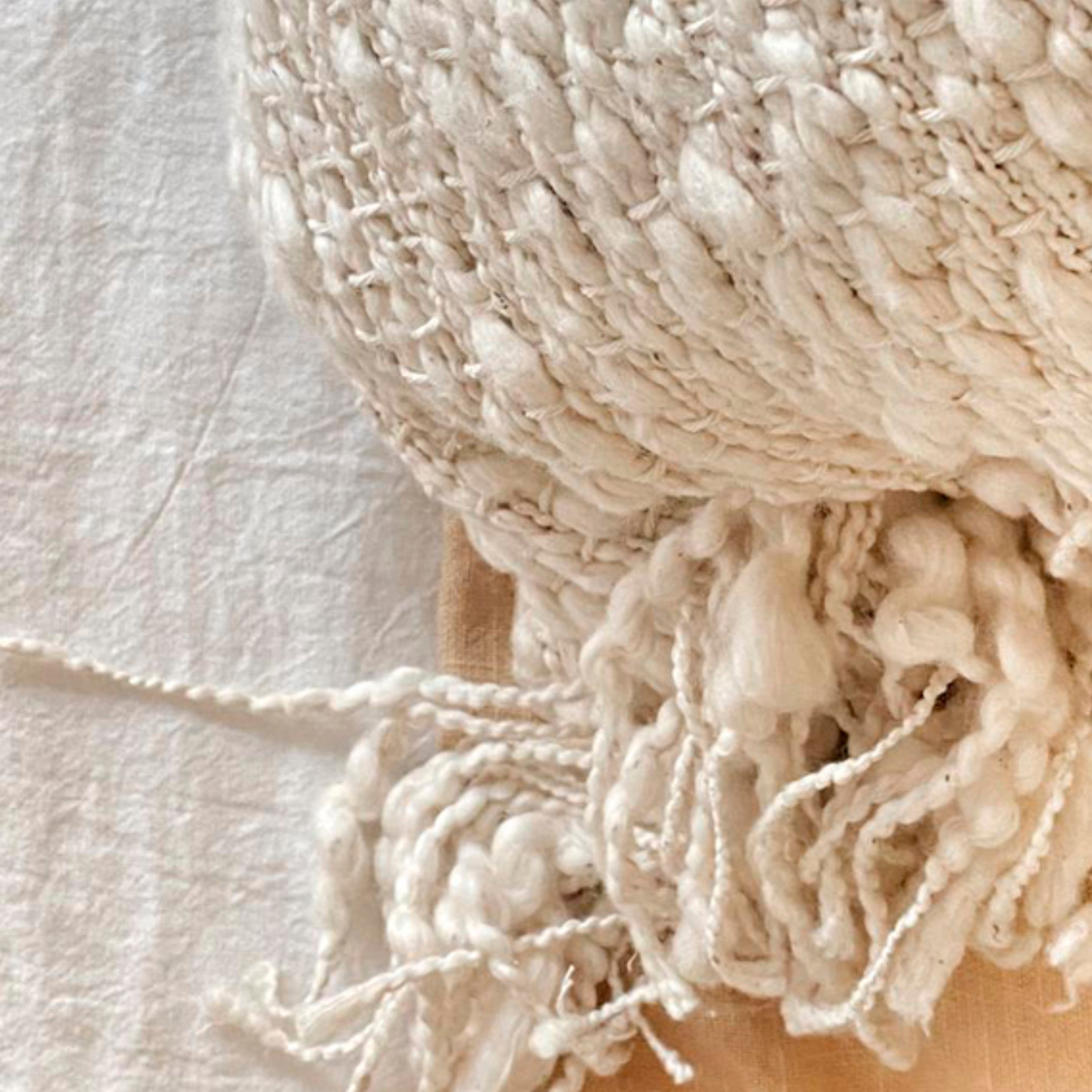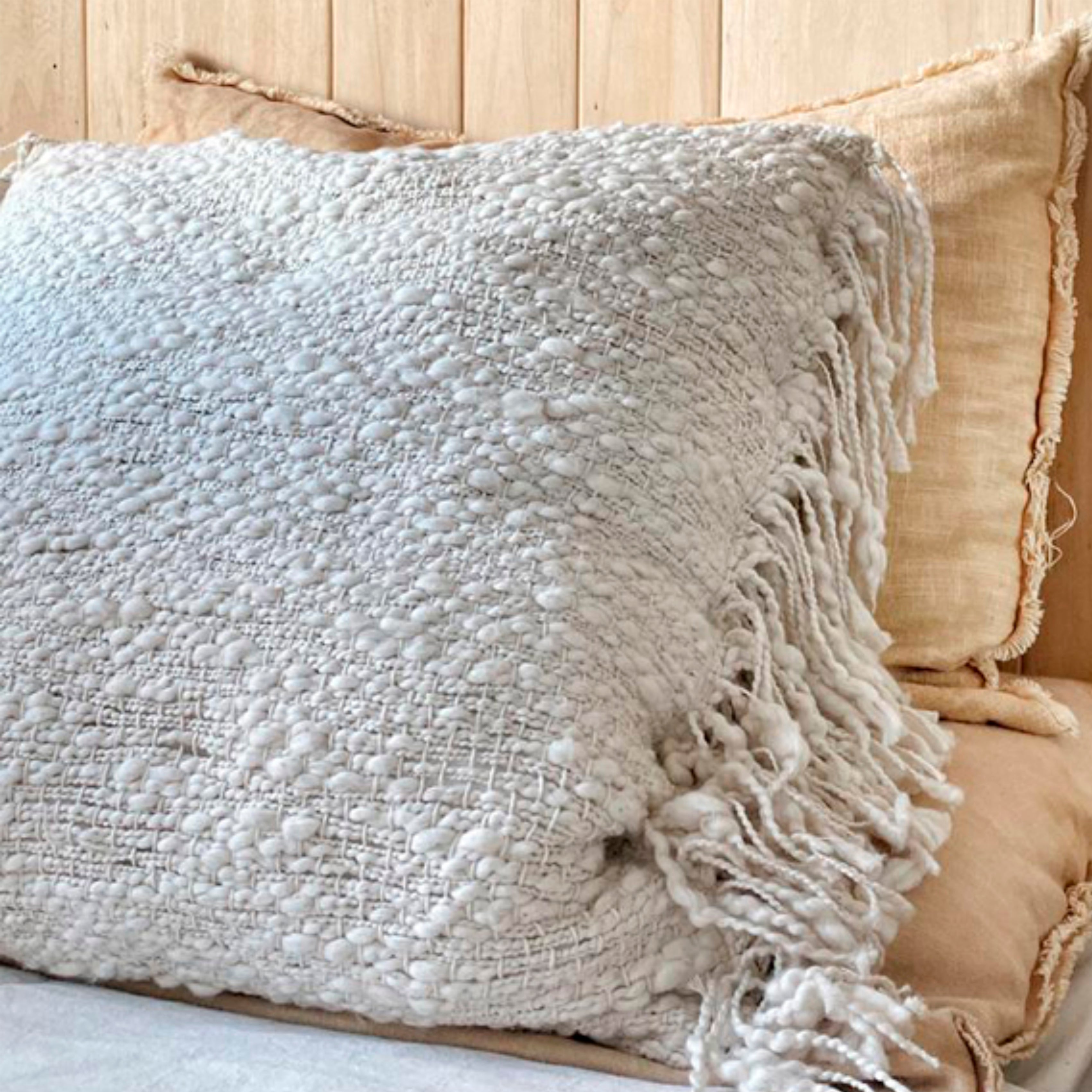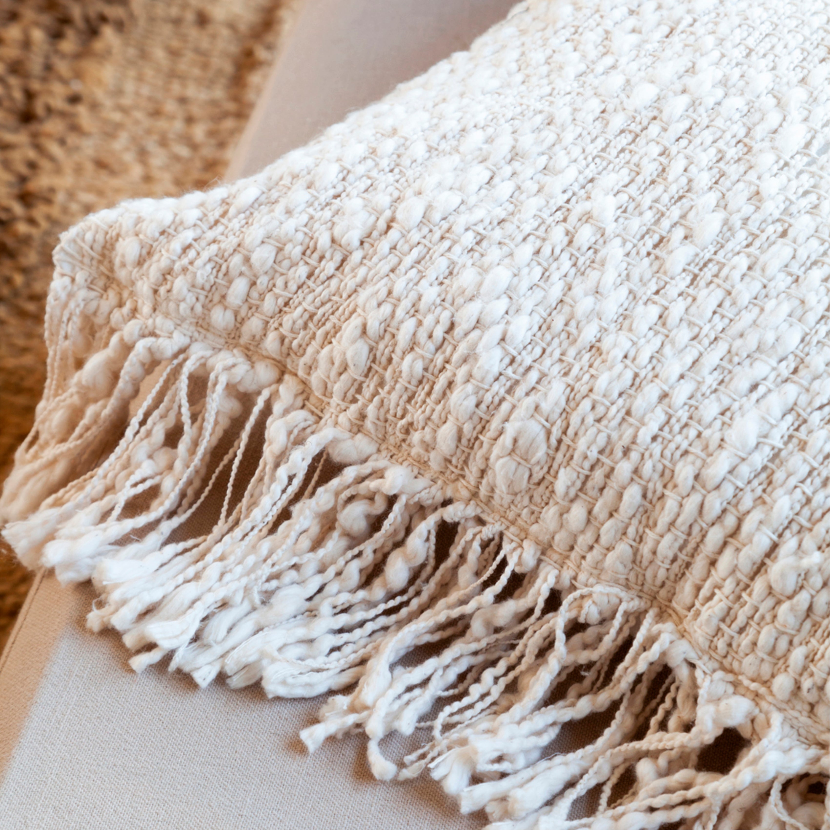 Almohadón tejido en algodón de textura extra suave, con delicados flecos aplicados que aportan un toque de estilo y movimiento.