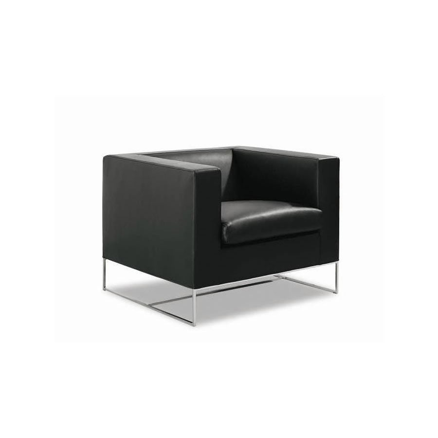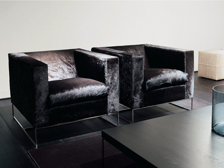 La base de la butaca está fabricada en acero satinado, con opción en hierro. En cuanto a los materiales de tapizado, son a elección del cliente, permitiendo combinar tejidos y personalizarla según su estilo y decoración.