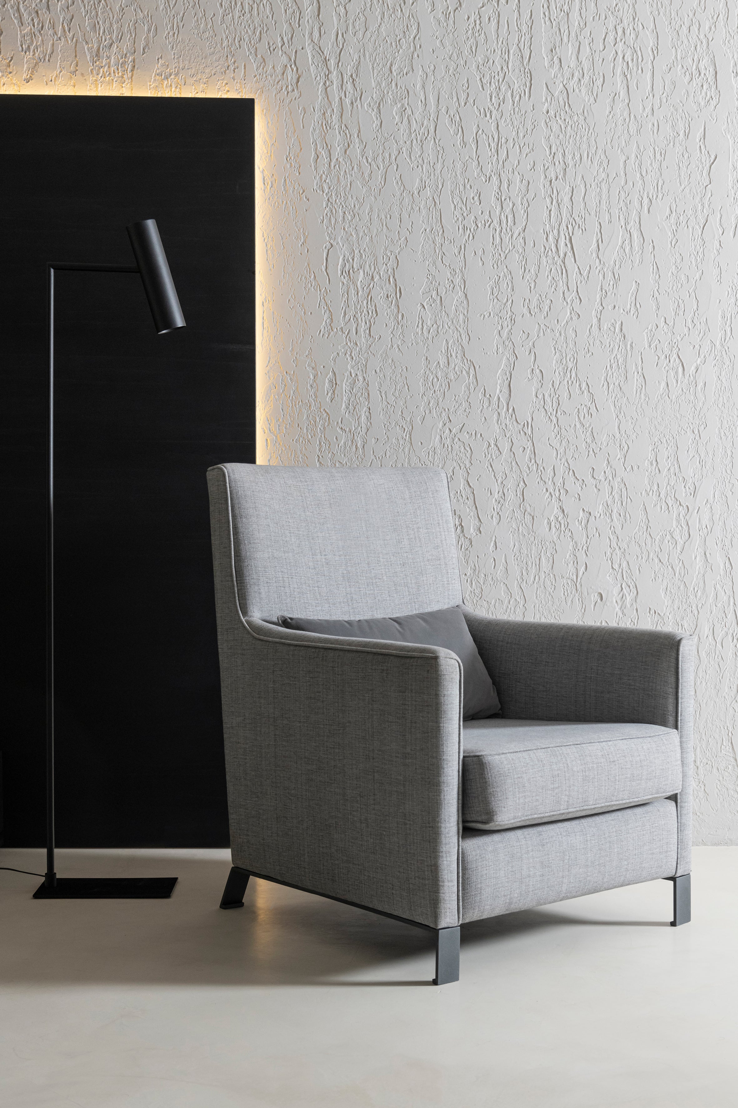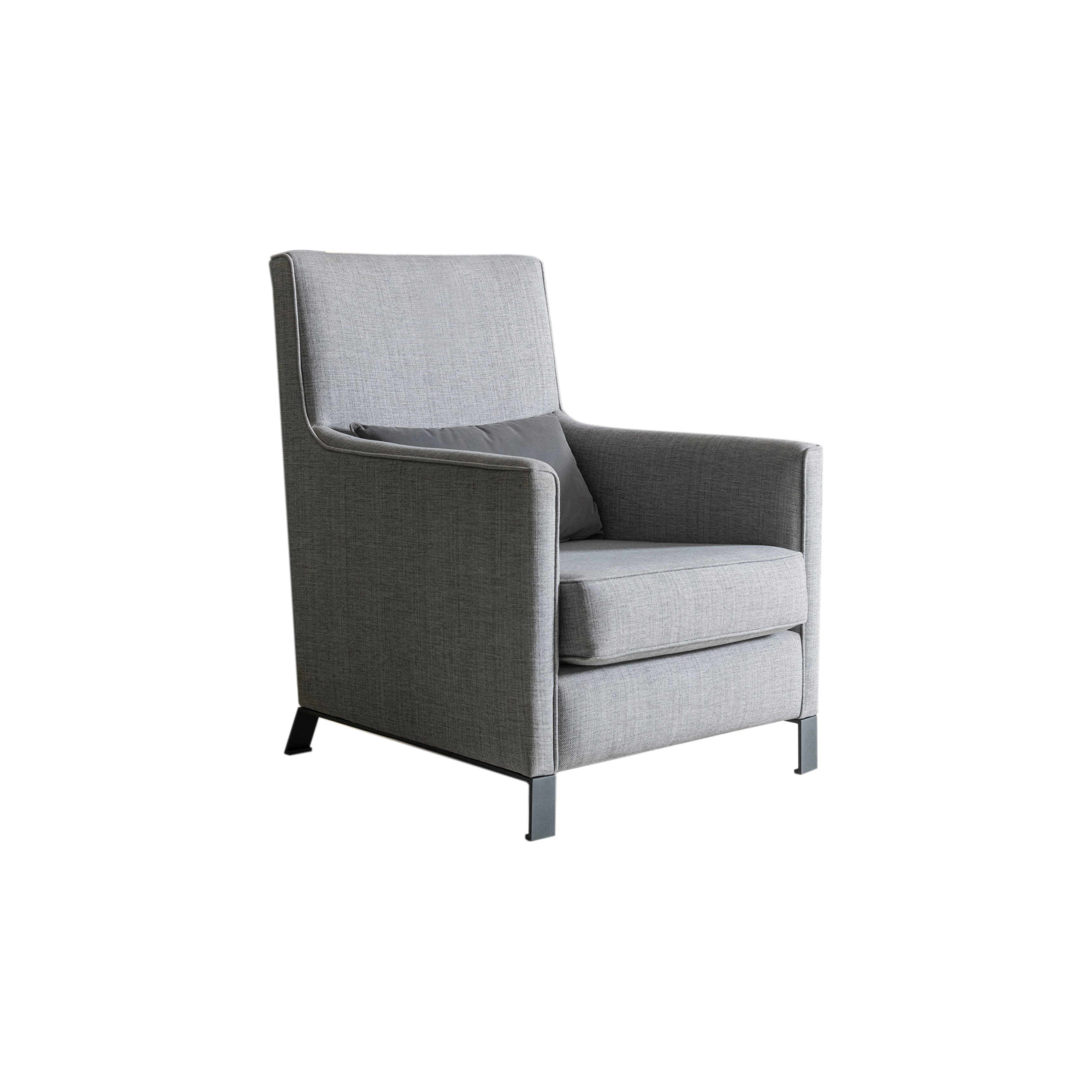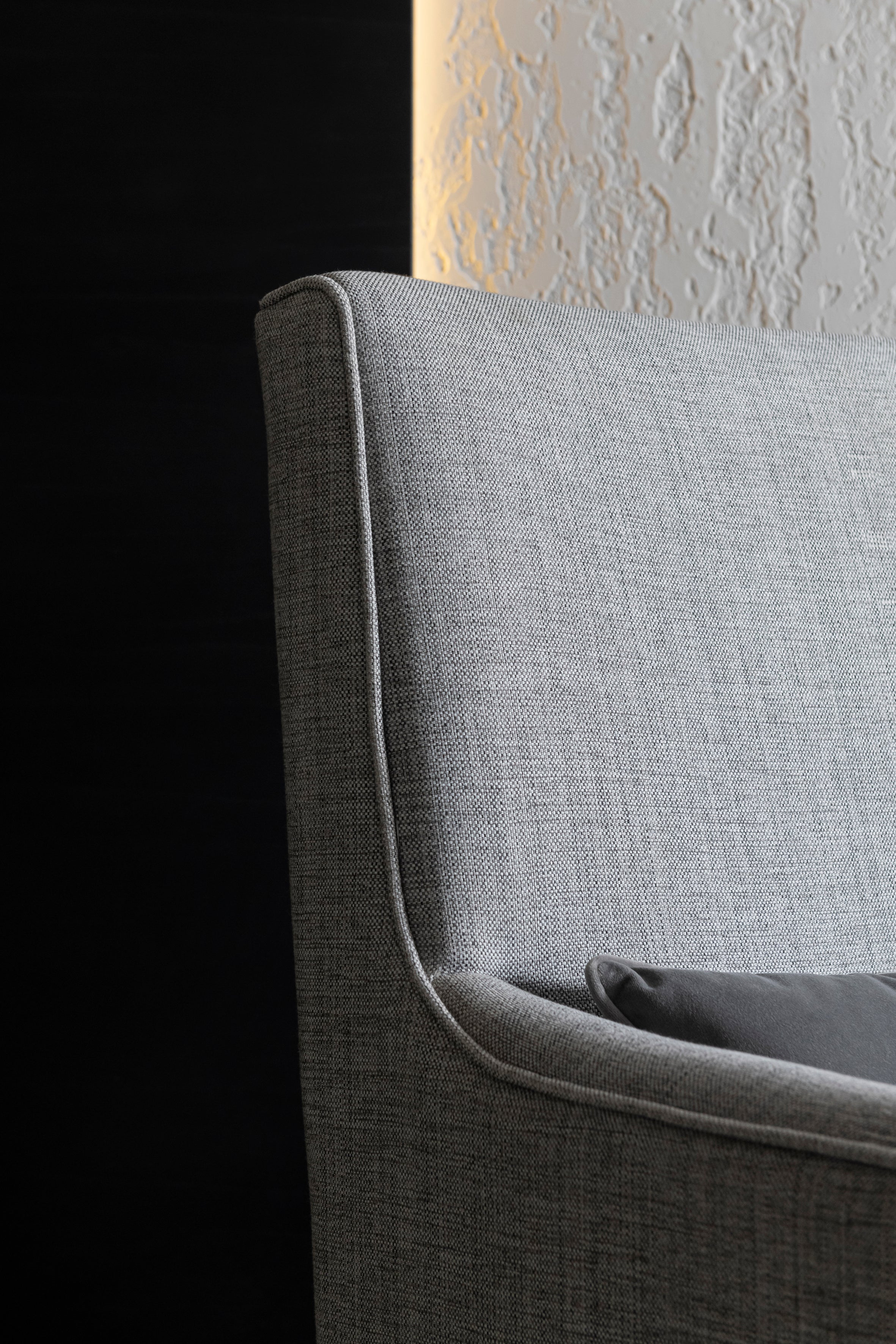 La base de la butaca está fabricada en acero satinado, con opción en hierro. En cuanto a los materiales de tapizado, son a elección del cliente, permitiendo combinar tejidos y personalizarla según su estilo y decoración.