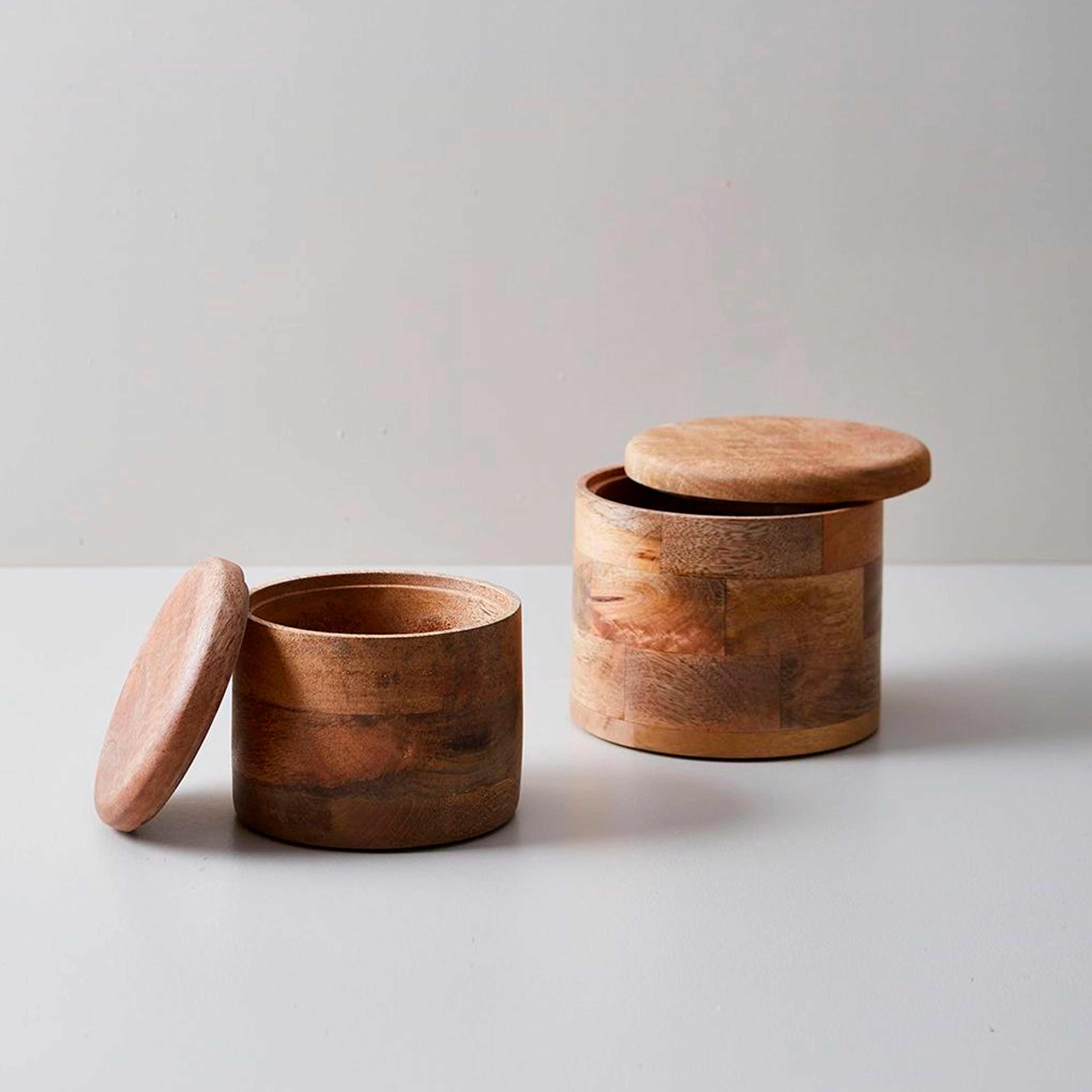 Set de dos cajas decorativas fabricadas en madera con acabado natural. Cuentan con un práctico y estético mango circular, lo que las hace funcionales y visualmente atractivas. Perfectas para organizar, almacenar o simplemente decorar estanterías, escritorios o cualquier rincón del hogar.