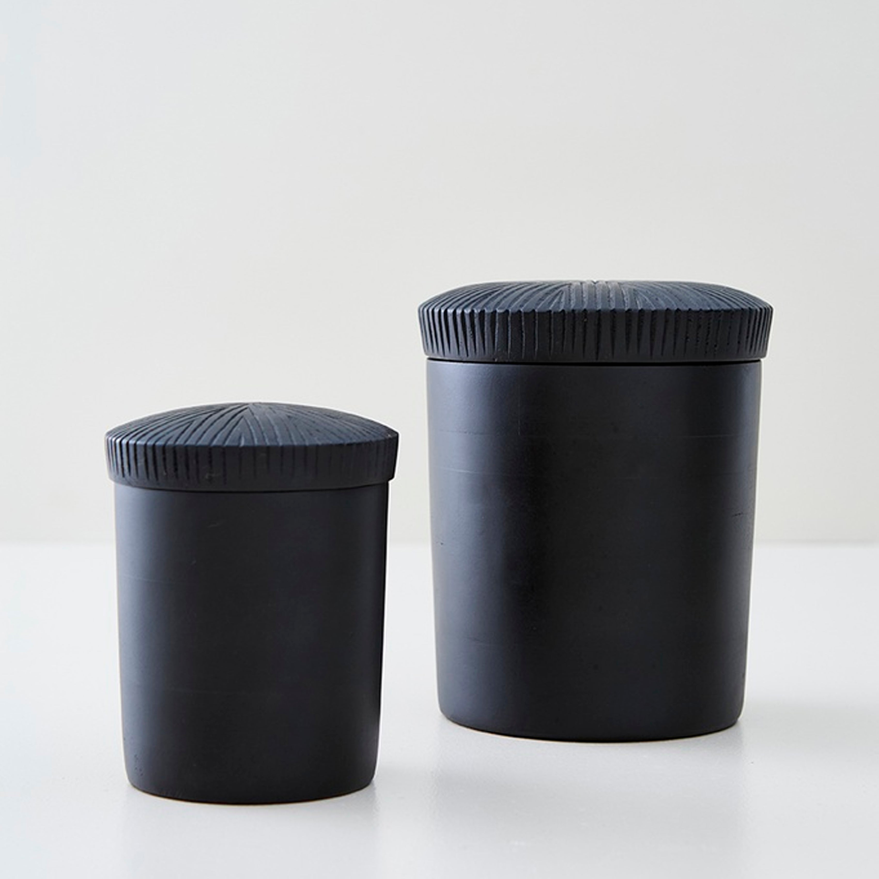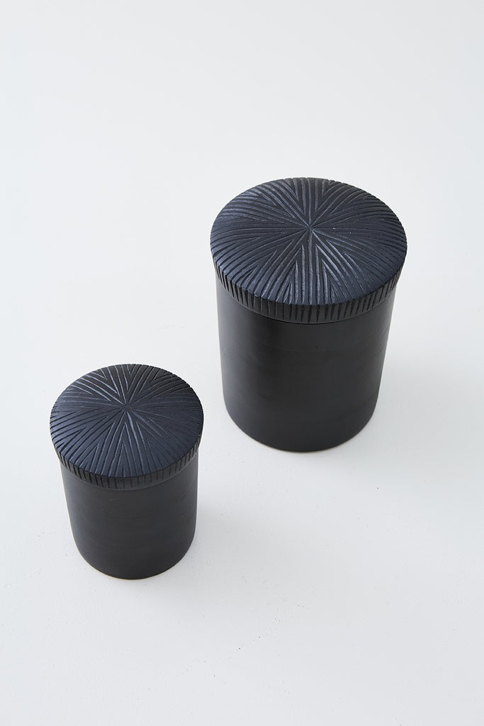 Elegante set de dos cajas de madera con tapa tallada y mango integrado. De color negro y con un diseño artesanal y sofisticado, estas cajas son ideales para guardar objetos pequeños y decorar espacios con un toque distintivo y moderno.