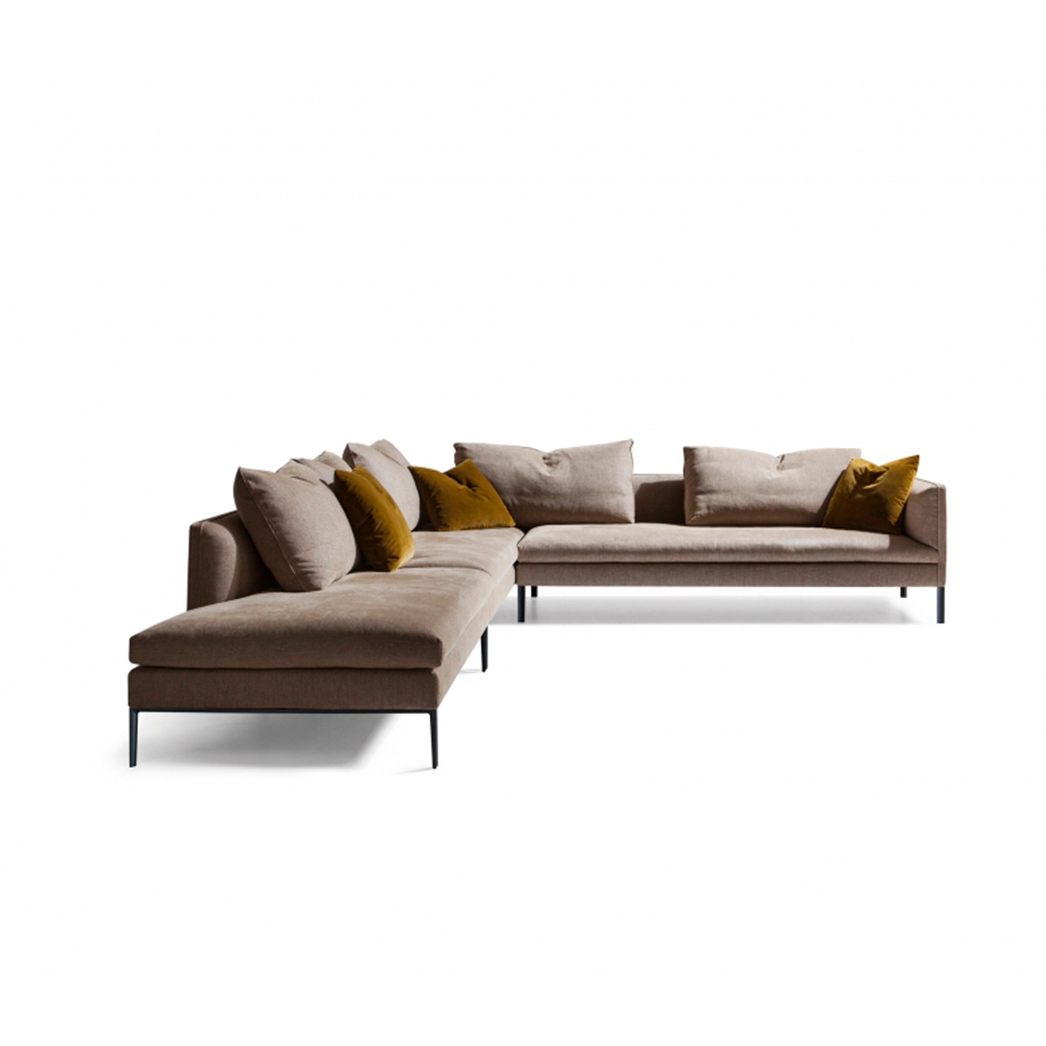 Construcción: estructura en maderas estacionadas, cinchas y resortes, placa de supersoft de densidad variable a confort personal, almohadones en vellón siliconado envueltos en guata con funda y cierres. Patas en hierro negro micro texturado.