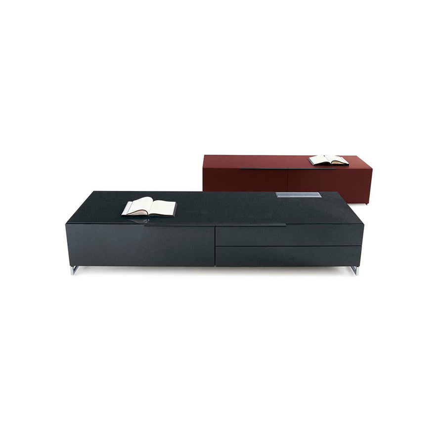 Presenta un diseño inteligente con puertas correderas que se abren para revelar una unidad de estanterías. Marco metálico en forma de "V" con perfiles en cromo brillante, cromo negro o níquel bronceado. Tablero grueso con bordes redondeados, logrados mediante un complejo proceso de fresado que mantiene la veta de la madera uniforme. Patas bajas de barra cromada que complementan su perfil bajo y silueta adaptable.