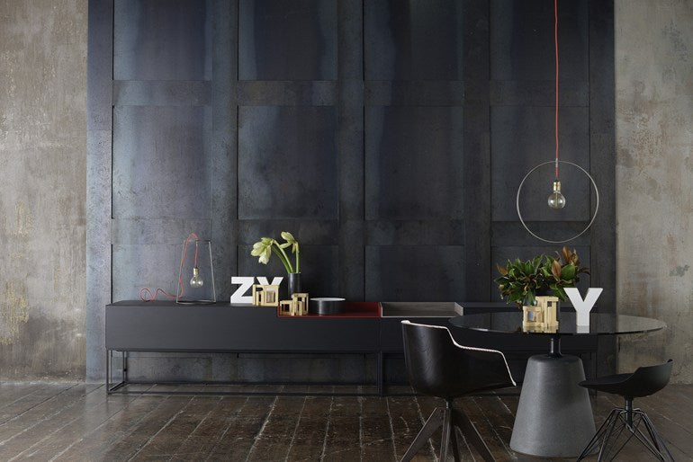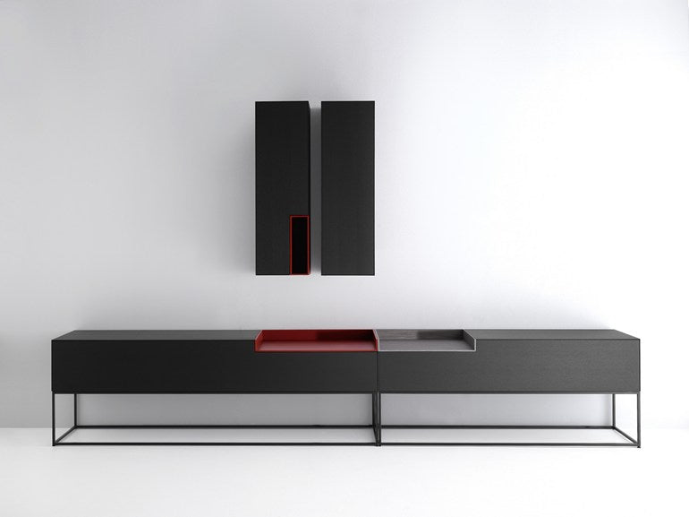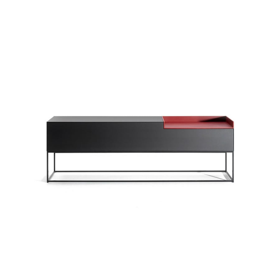 El vajillero Credi es un mueble de diseño elegante y funcional, con una estructura en hierro negro epoxi y una puerta volcable que permite el acceso a un amplio espacio de almacenamiento interior. Además, cuenta con una bandeja desmontable que puede utilizarse como superficie de apoyo. El acabado de la madera es en poliuretano mate, lo que le da un aspecto natural y cálido, mientras que la base de hierro negro le aporta un toque industrial y moderno.