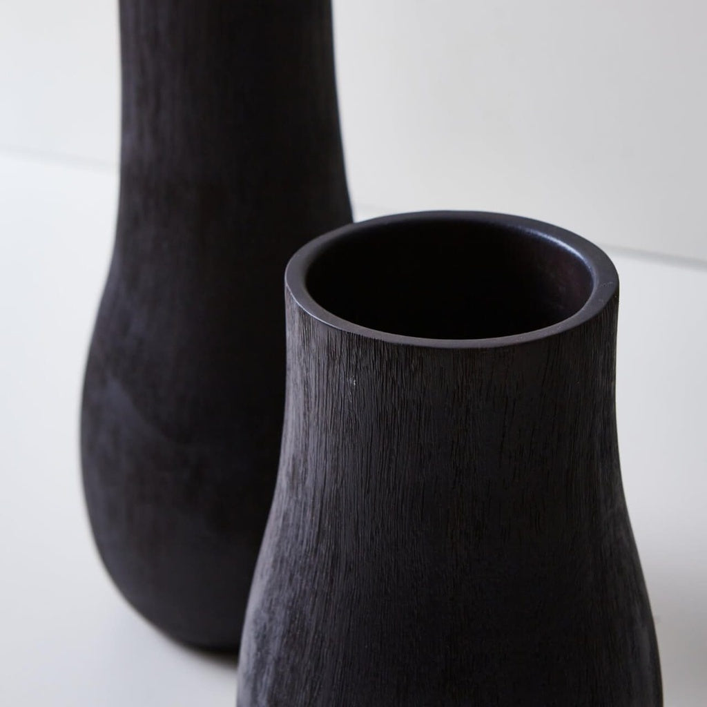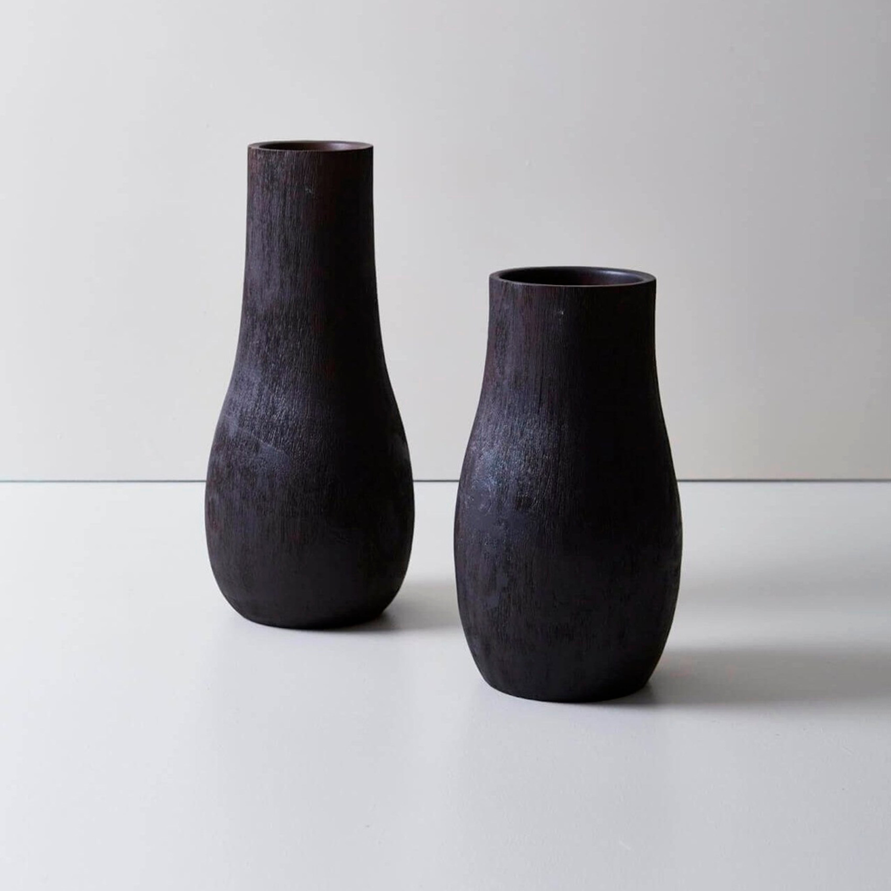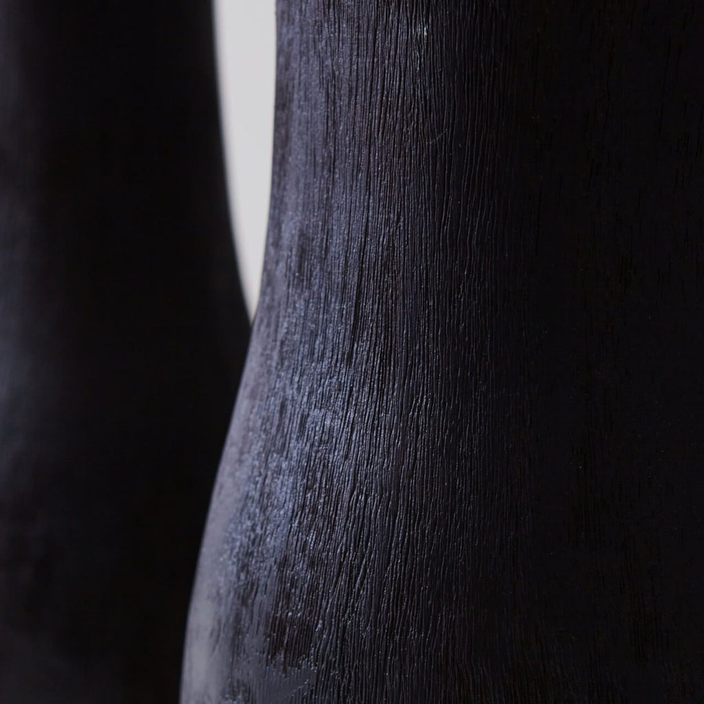 Set de dos cuencos decorativos elaborados en madera con un elegante acabado negro. Cada pieza presenta un mango texturado que realza su carácter artesanal. De diseño alargado y estilizado, son ideales como objetos decorativos para espacios modernos, industriales o rústicos.