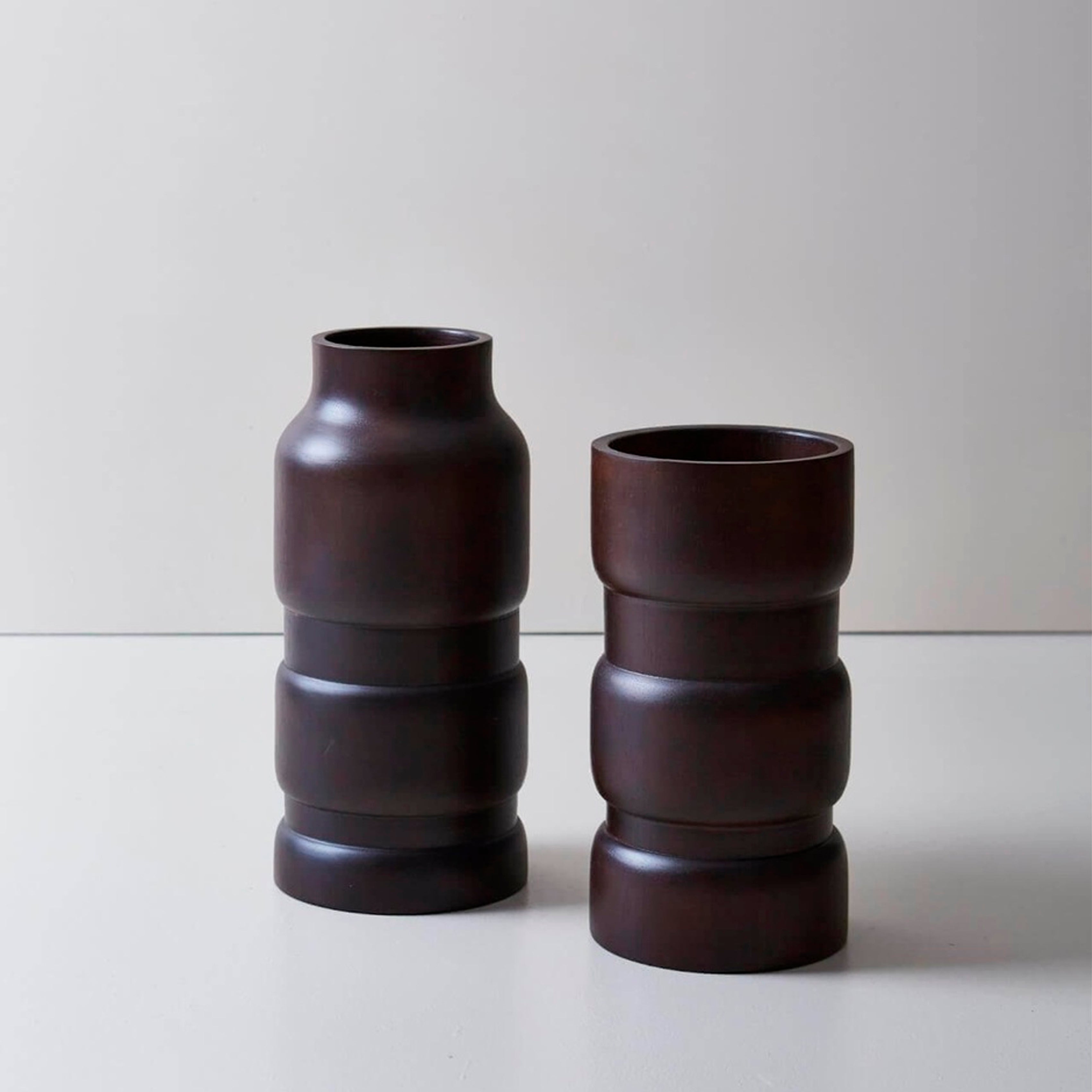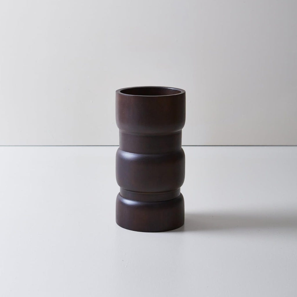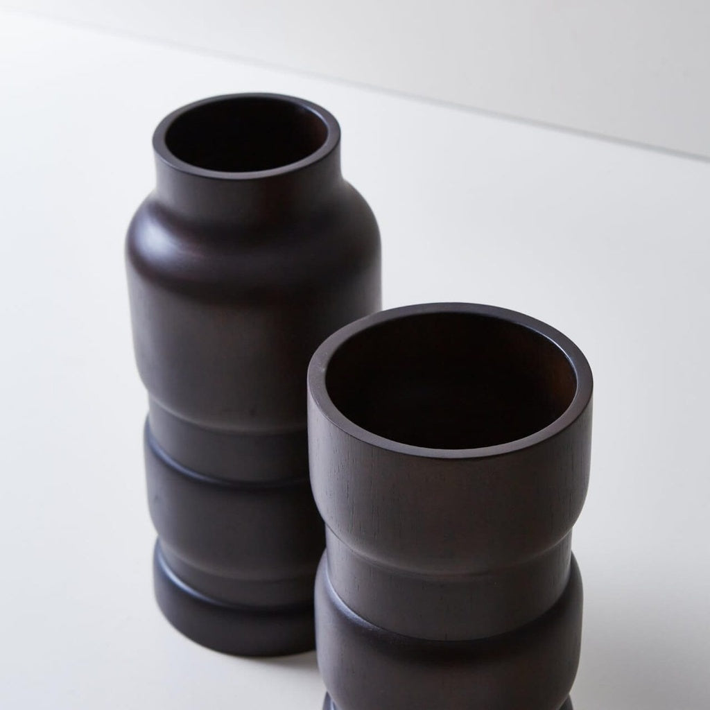 Set de dos cuencos altos elaborados en madera con acabado en marrón oscuro. Cada pieza cuenta con un mango integrado, aportando un toque rústico y elegante. Son ideales como elementos decorativos, para exhibir objetos o como acento visual en mesas, repisas o estanterías.