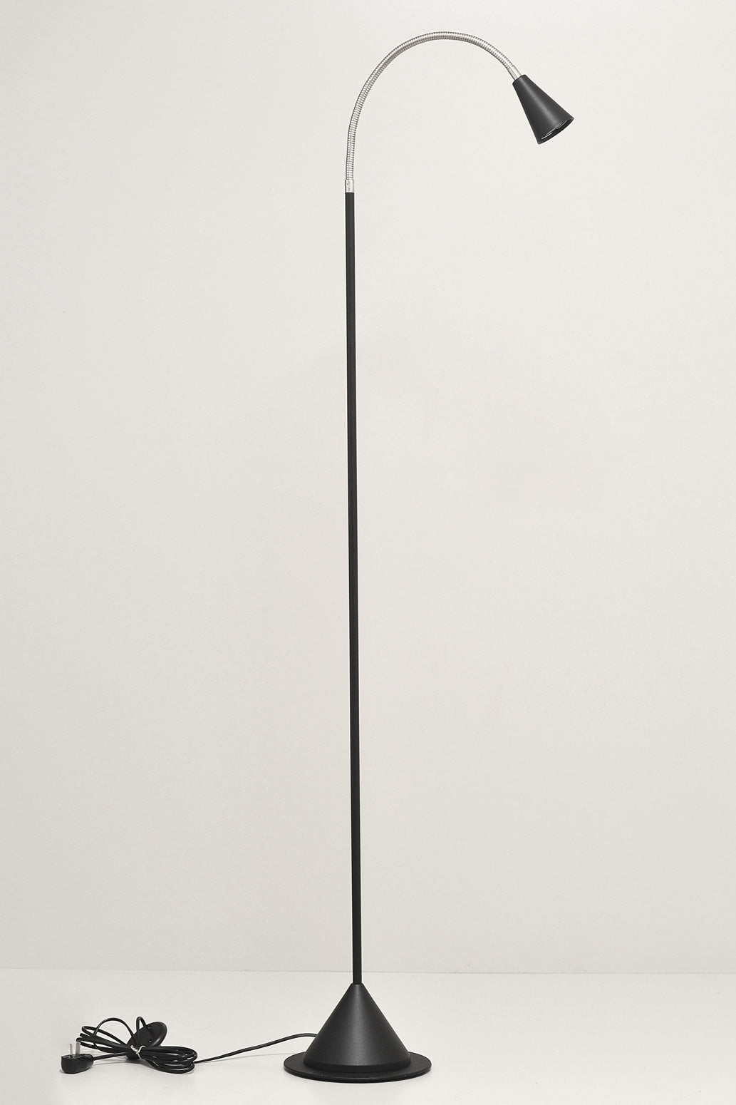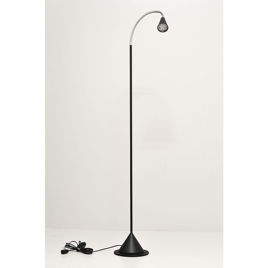 Cabezal torneado y soldado a mano en pedestal flexible y base cónica torneada a mano. Cable inyectado con pulsador de piso ON/OFF.