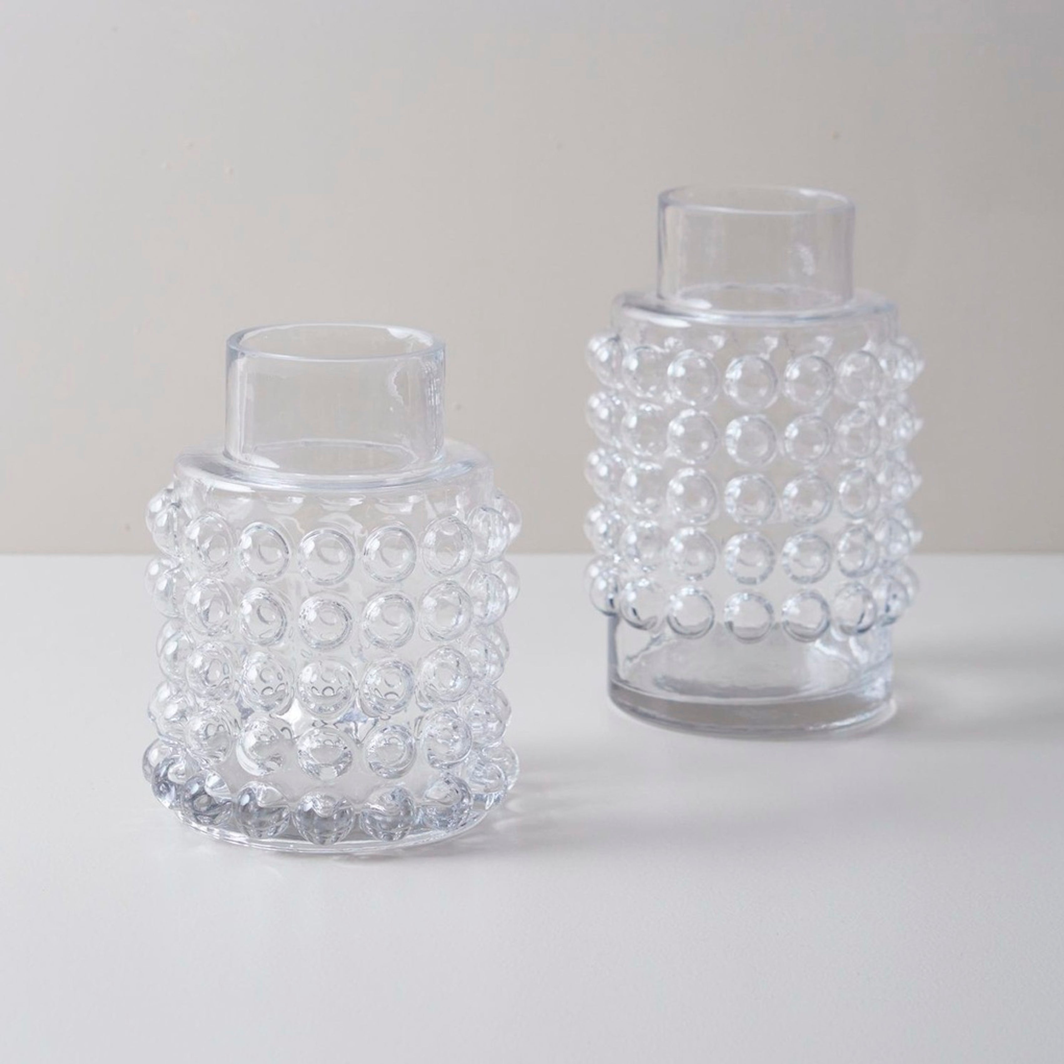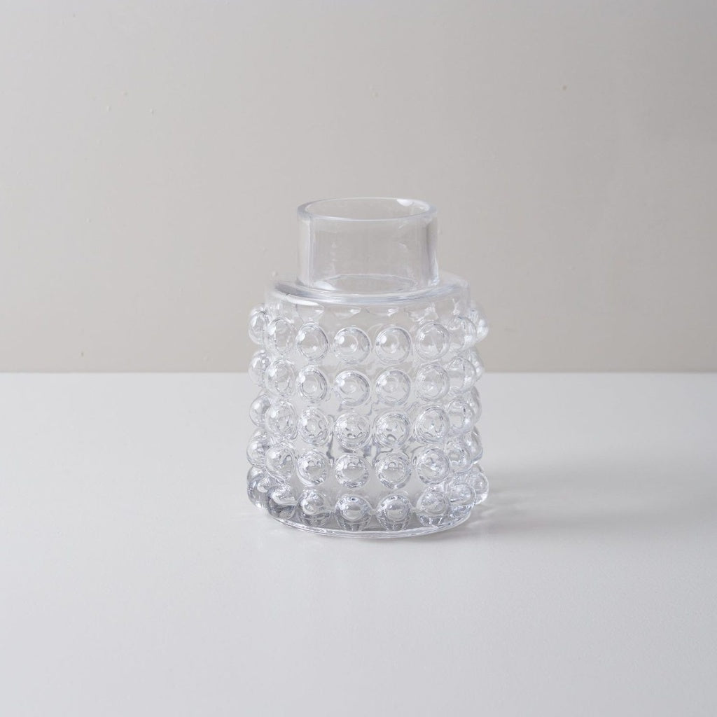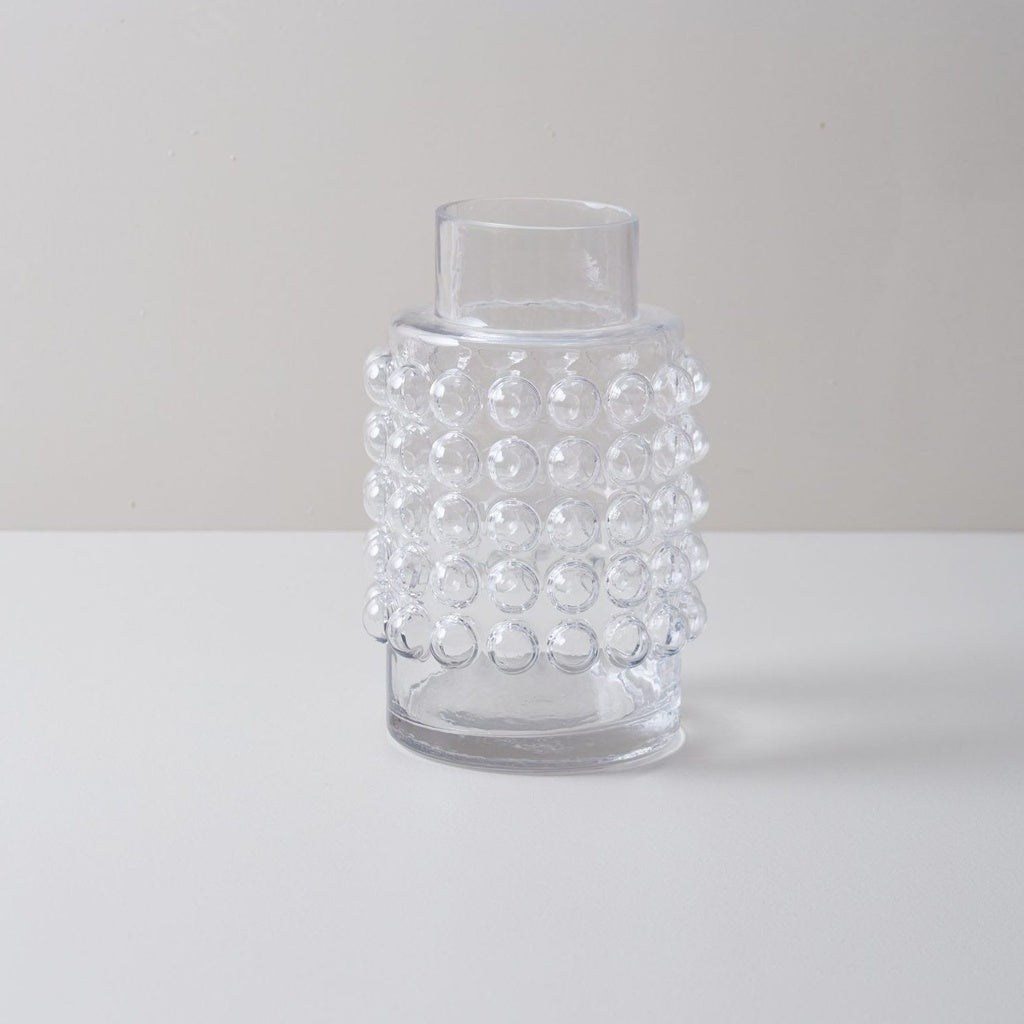 Elegantes jarrones decorativos fabricados en vidrio transparente, con un distintivo detalle de burbujas que aporta textura y un toque artesanal. Su diseño refinado y atemporal los convierte en piezas versátiles para decorar con flores o como elementos escultóricos.
