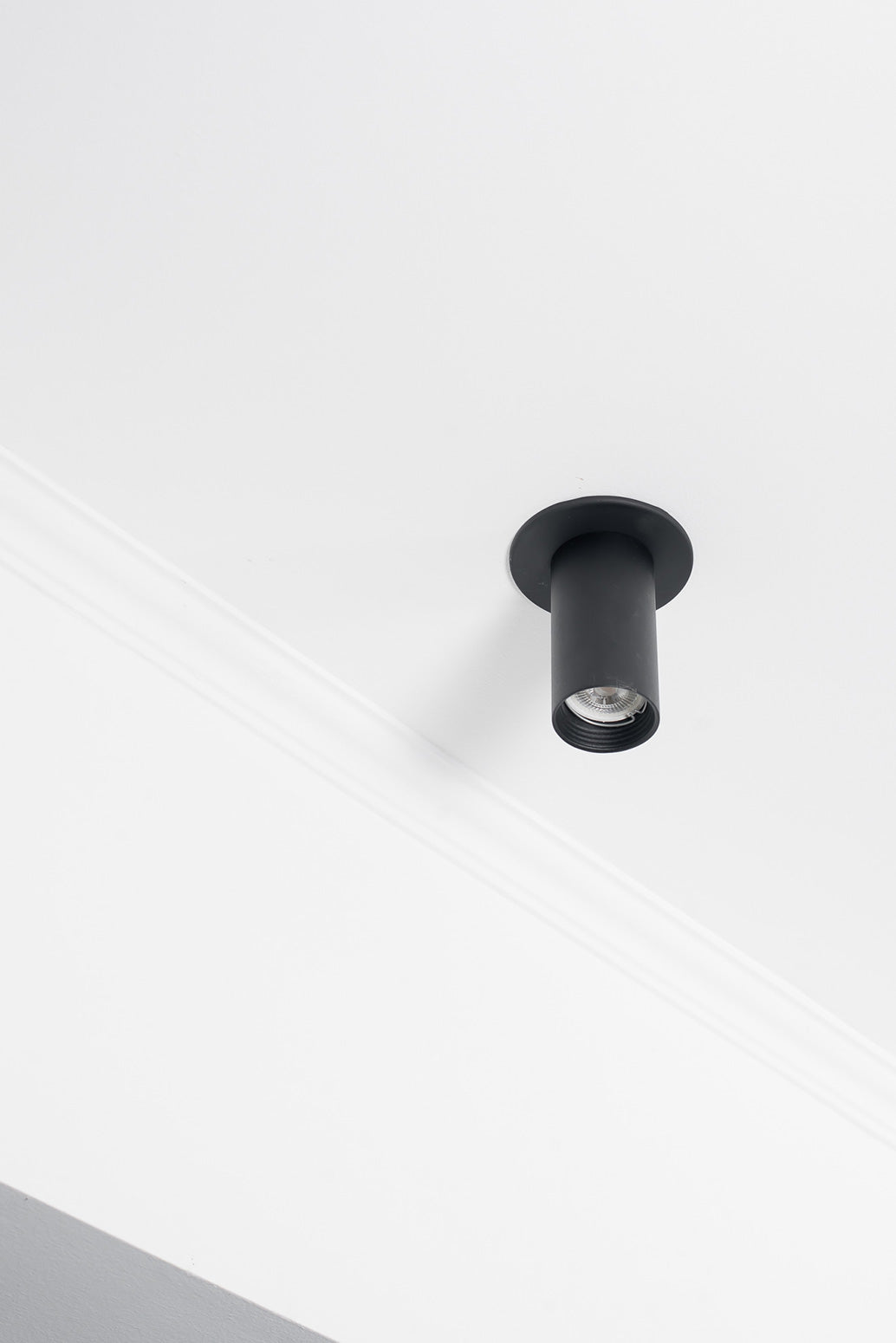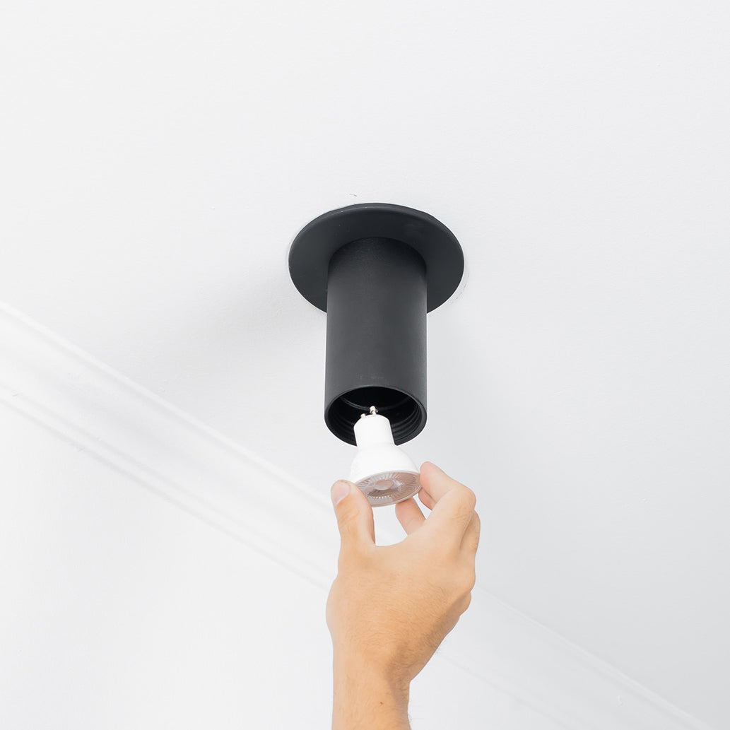 Cuerpo de hierro soldado a mano, con interior antideslumbrante torneado artesanalmente. Agarre al techo por resortes.