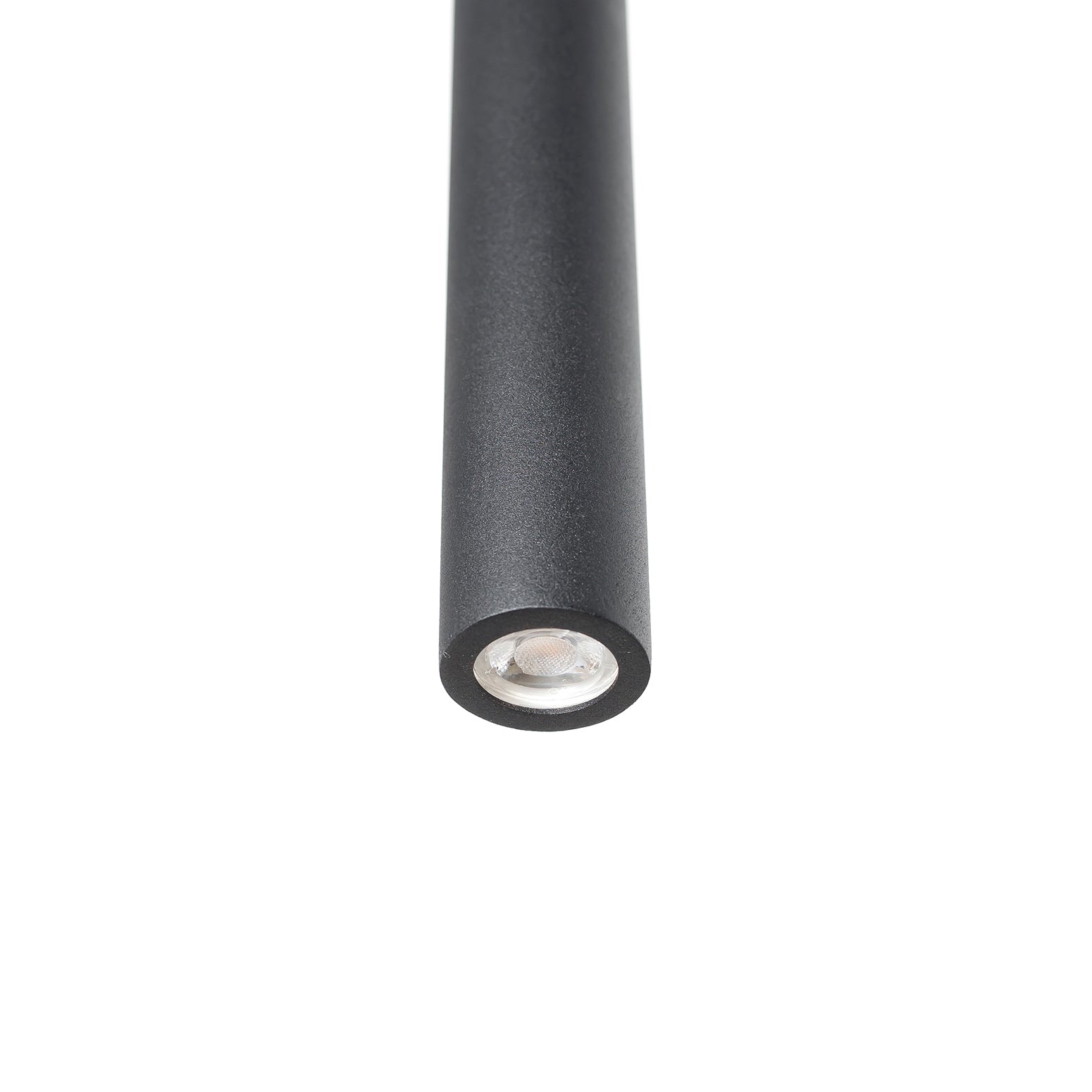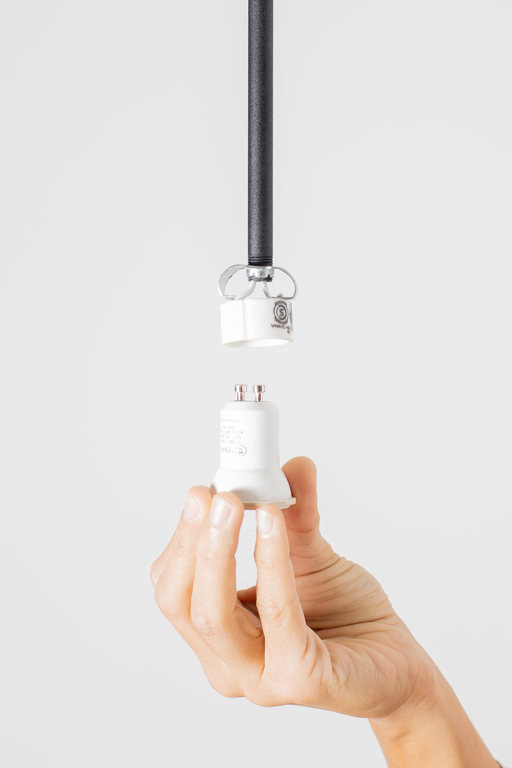Cuerpo en hierro soldado a mano desmontable por prisionero. Interior soporte de GU10 pintado. Cable envainado y base de una luz torneada por balancín con sistema de ajuste fácil.