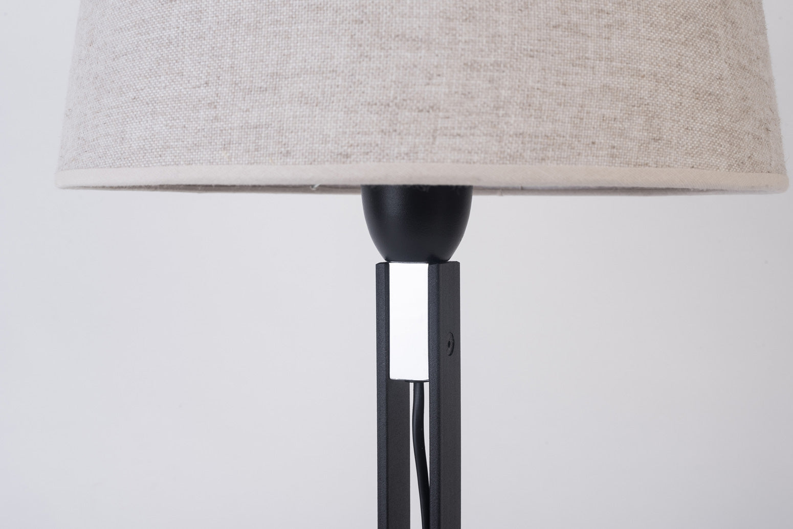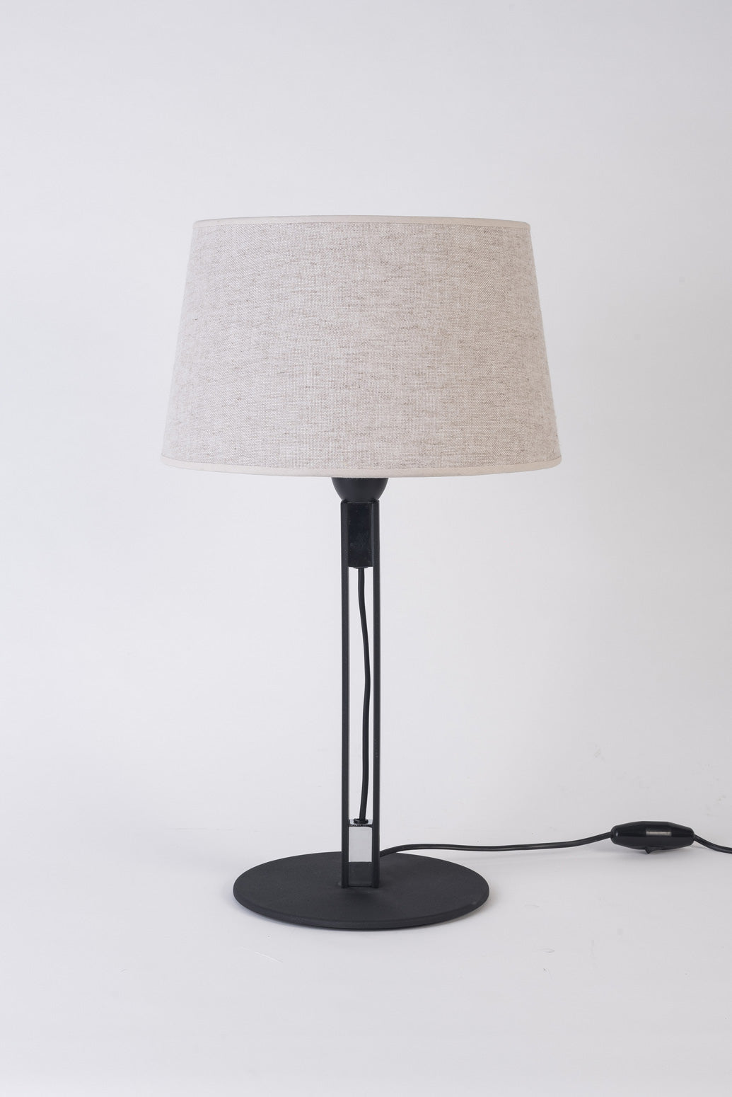 Planchuela doble unida por un macizo de hierro, base en hierro cortado en láser. Pantalla hecha de forma artesanal combinable en Lino o Madraz.