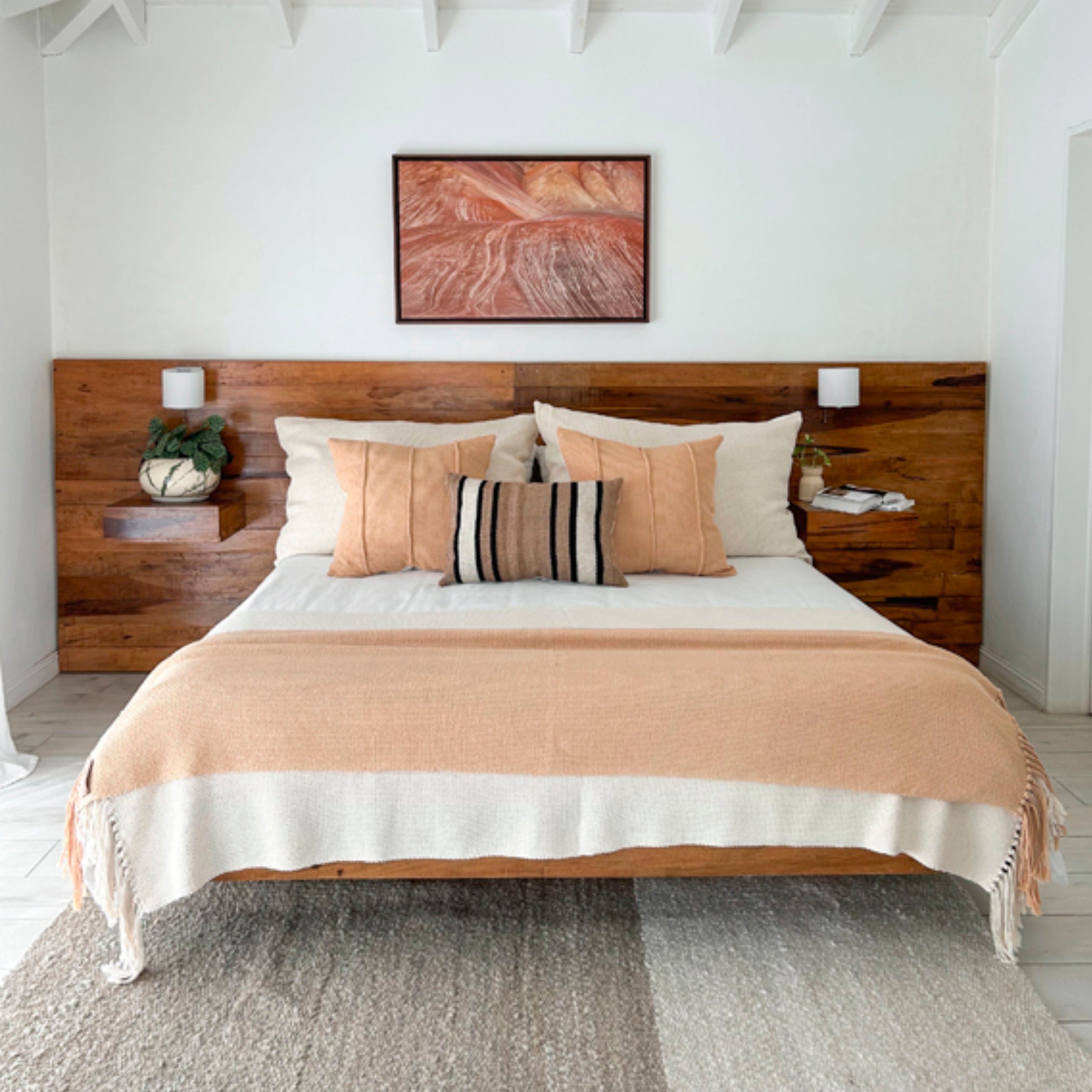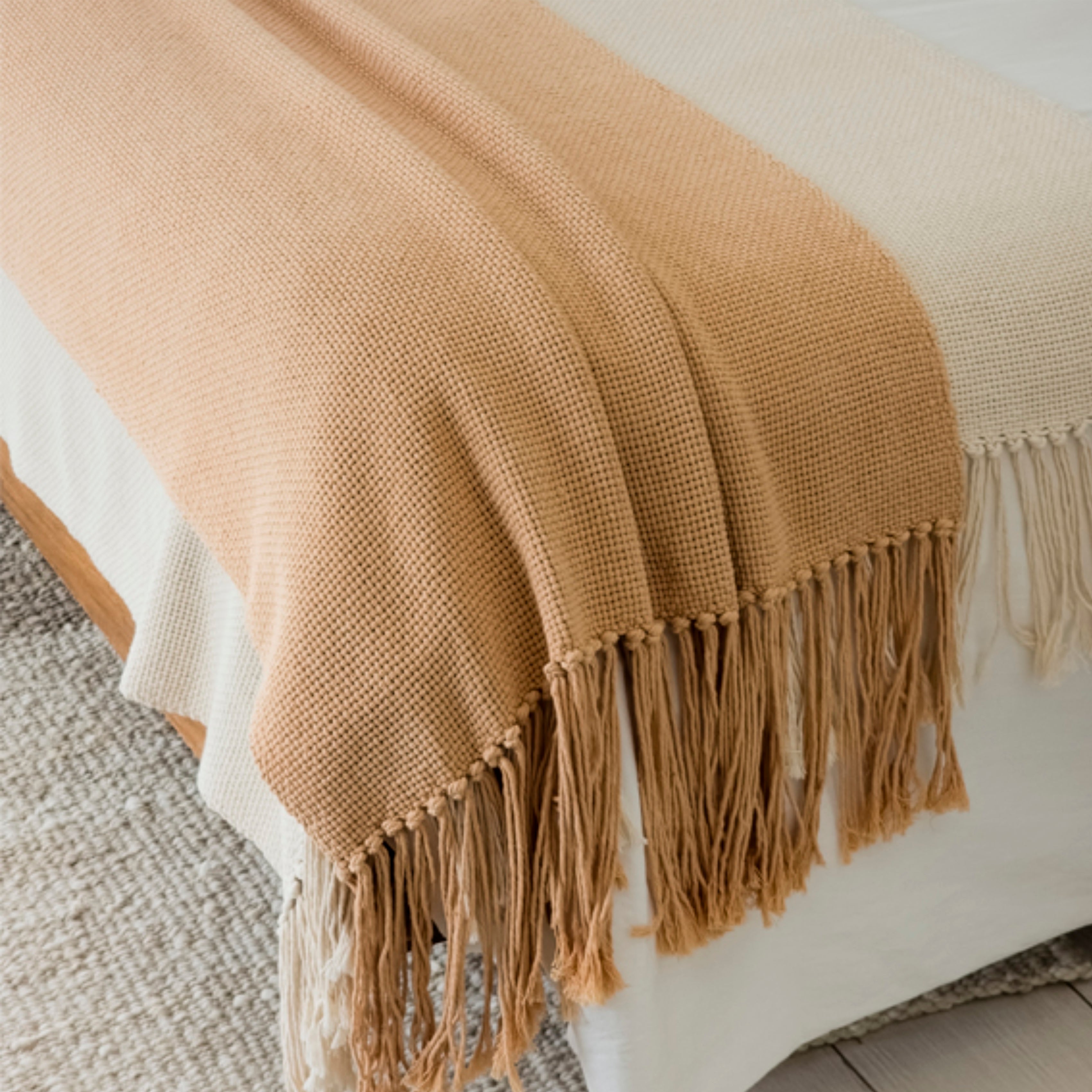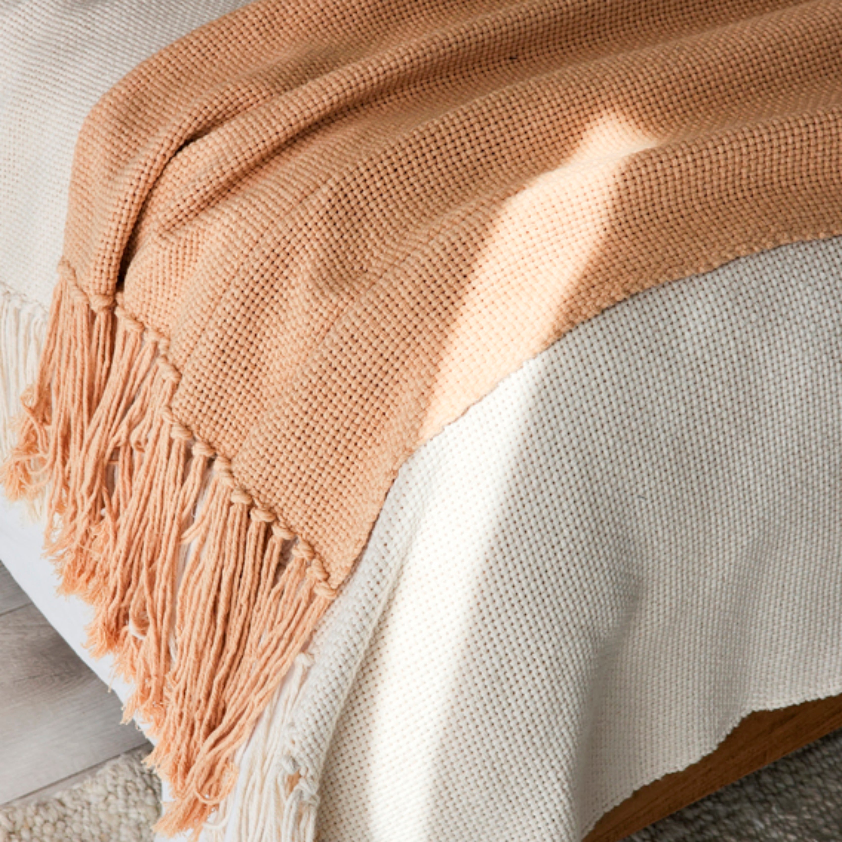 Dale un toque de calidez y elegancia a tu hogar con esta manta artesanal tejida en telar con algodón 100% natural en un hermoso tono durazno. Su textura suave y caída ligera la hacen perfecta para decorar tu cama, sofá o cualquier espacio especial, aportando comodidad y estilo a tu ambiente.