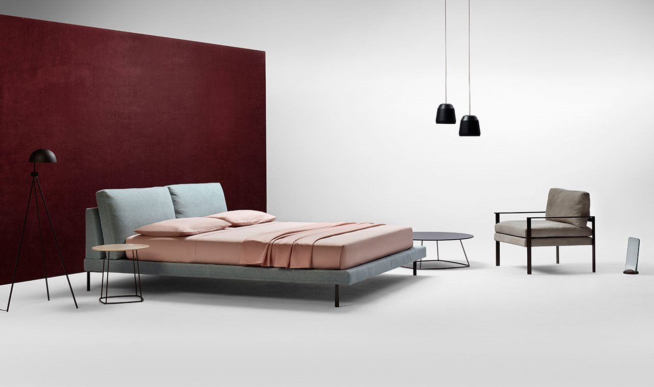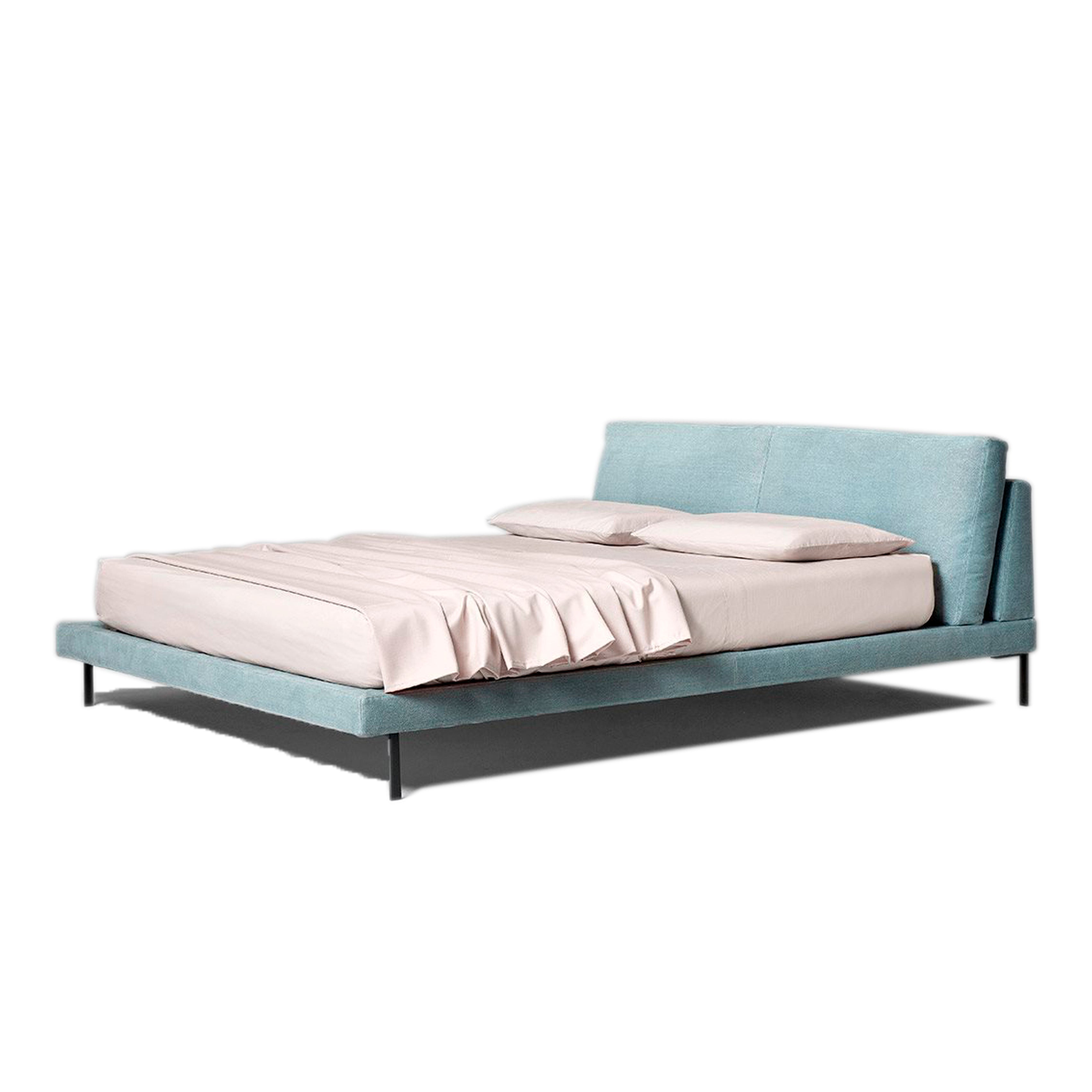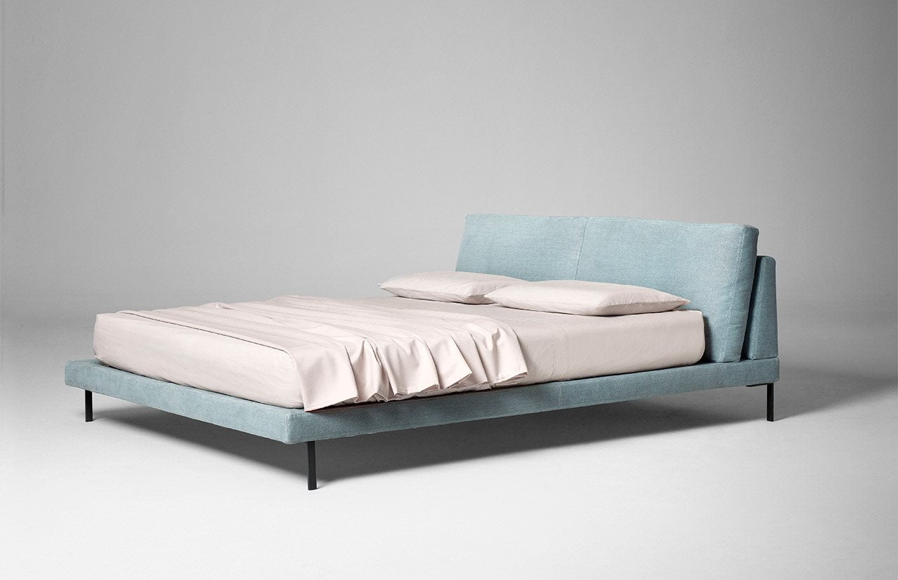 La cama está disponible en pana de microfibra, lino entramado o cuero ecológico en un color a elección del cliente.