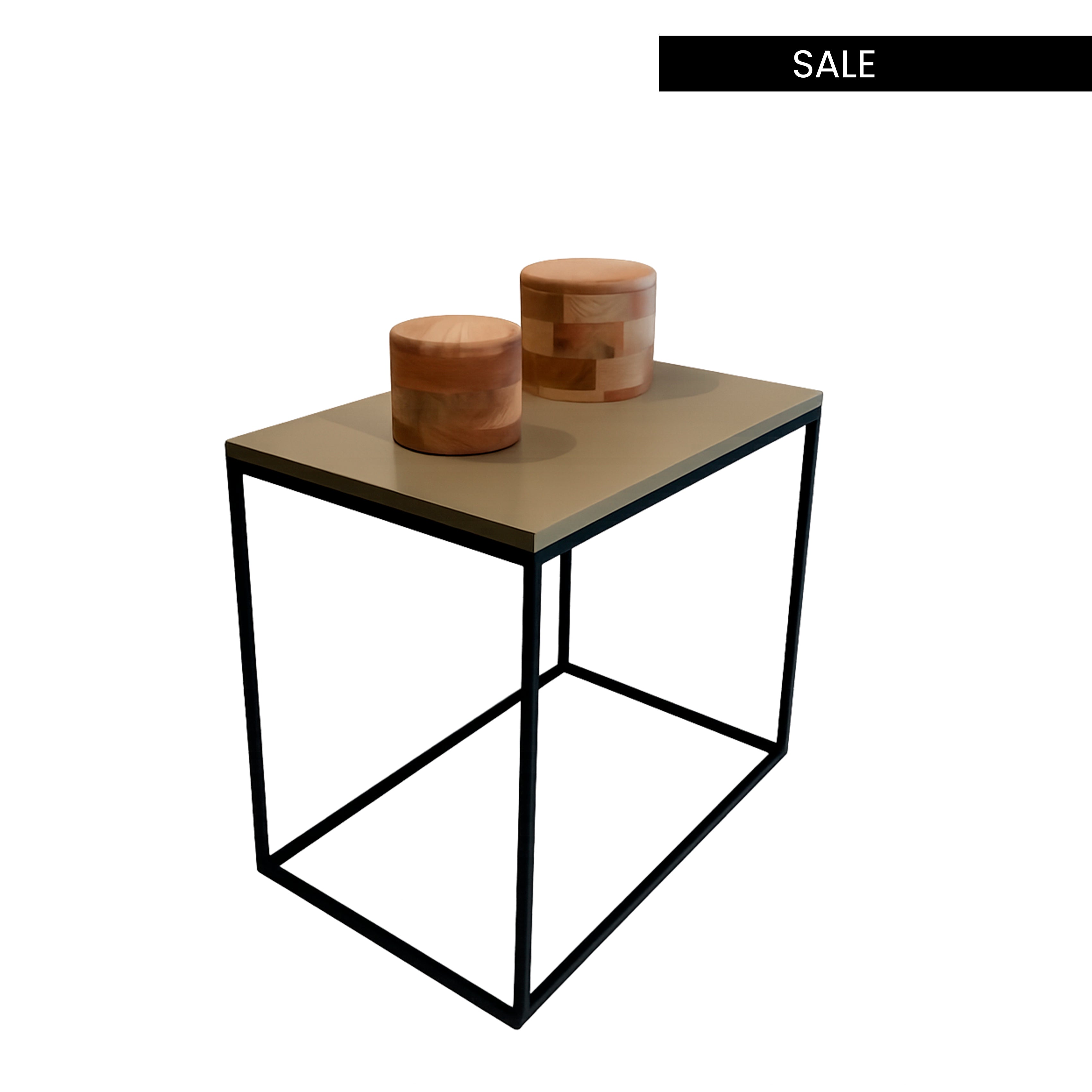 Mesa de Arrime Balen con base en hierro microtexturado negro y tapa en madera laqueada tono mostaza claro semi brillo.