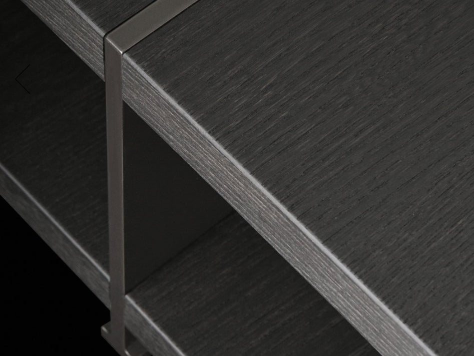 Caracterizadas por dos tableros superpuestos. Los soportes de madera se incrustan en la tapa superior y se cruzan con el piso inferior, convirtiéndose en la firma estilística de toda la colección. La tapa inferior está disponible en lacado o madera.