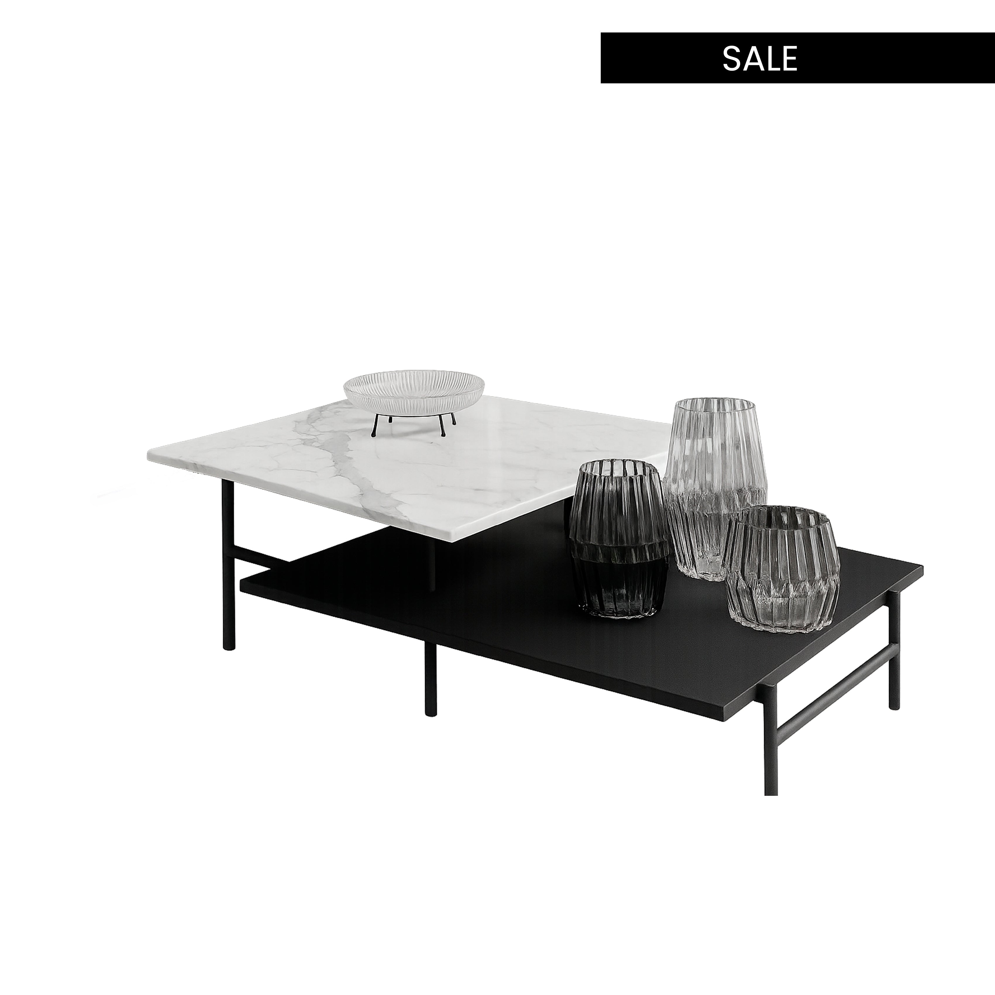 Mesa de centro Lelong con base en estructura de hierro negro con acabado epoxi y tapa inferior en madera paraíso poro abierto negro semibrillo y tapa superior en mármol Carrara.