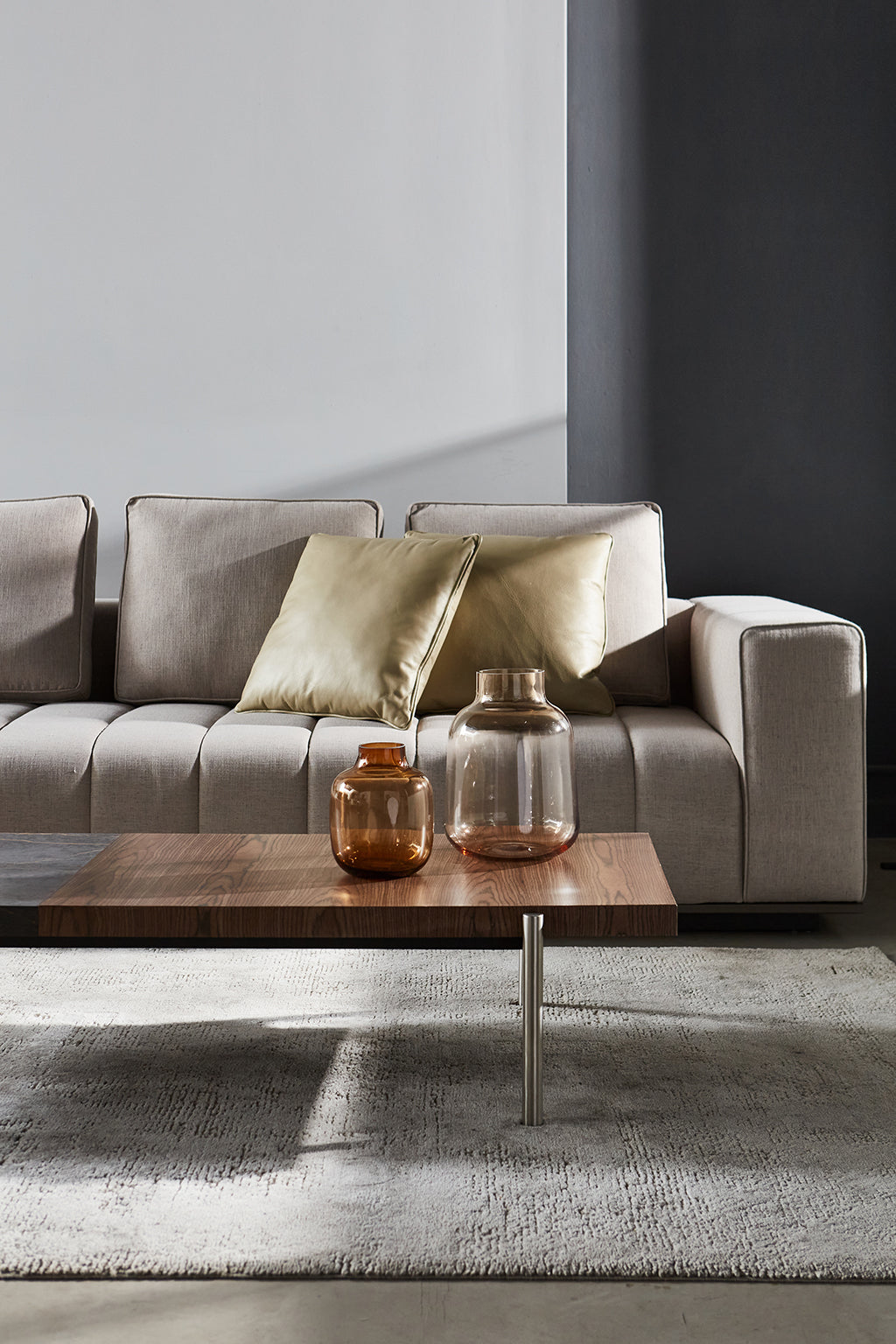 La colección Spezia se caracteriza por líneas esenciales y volúmenes cuadrados, con una estética sobria y una marcada materialidad.