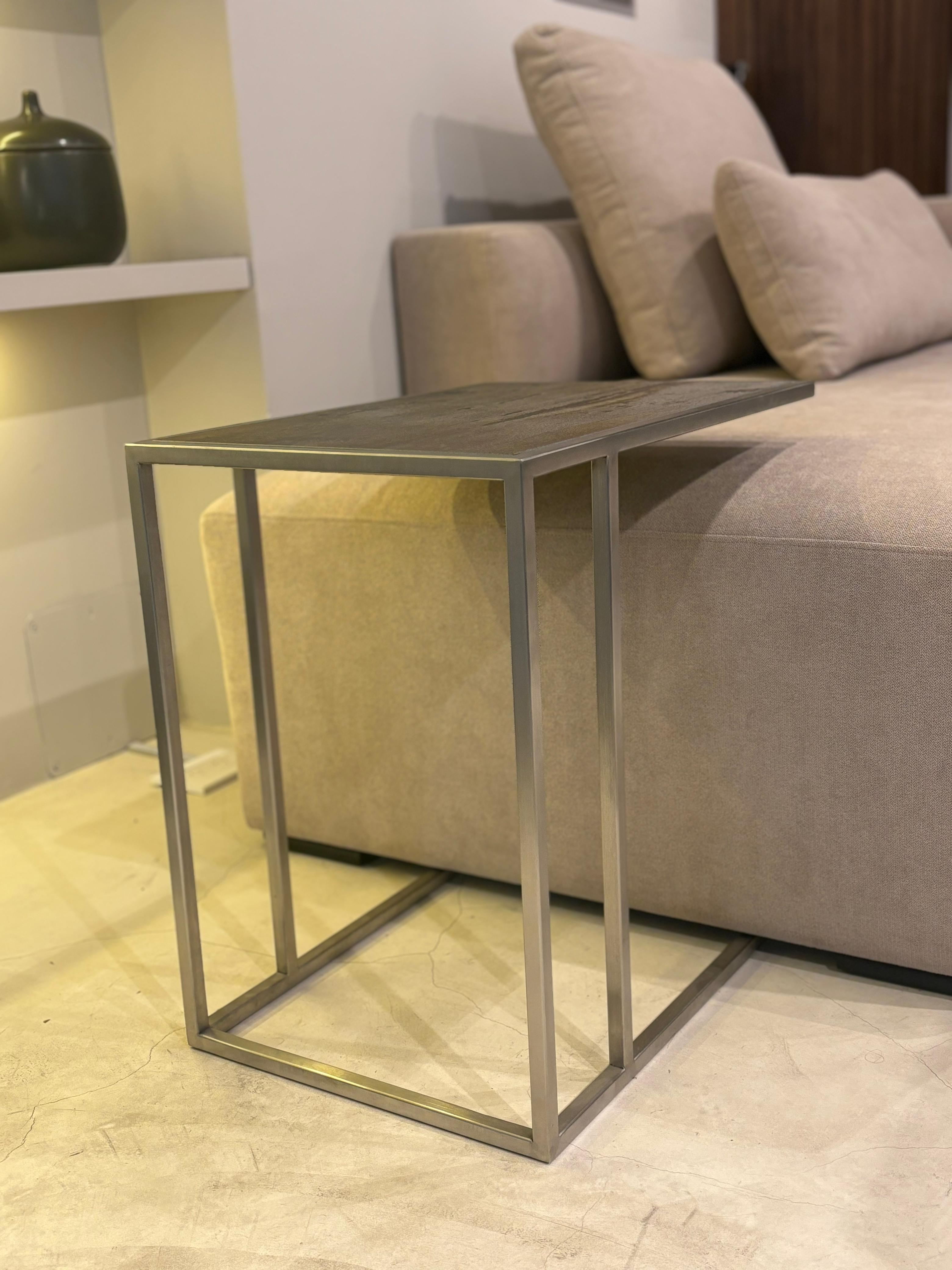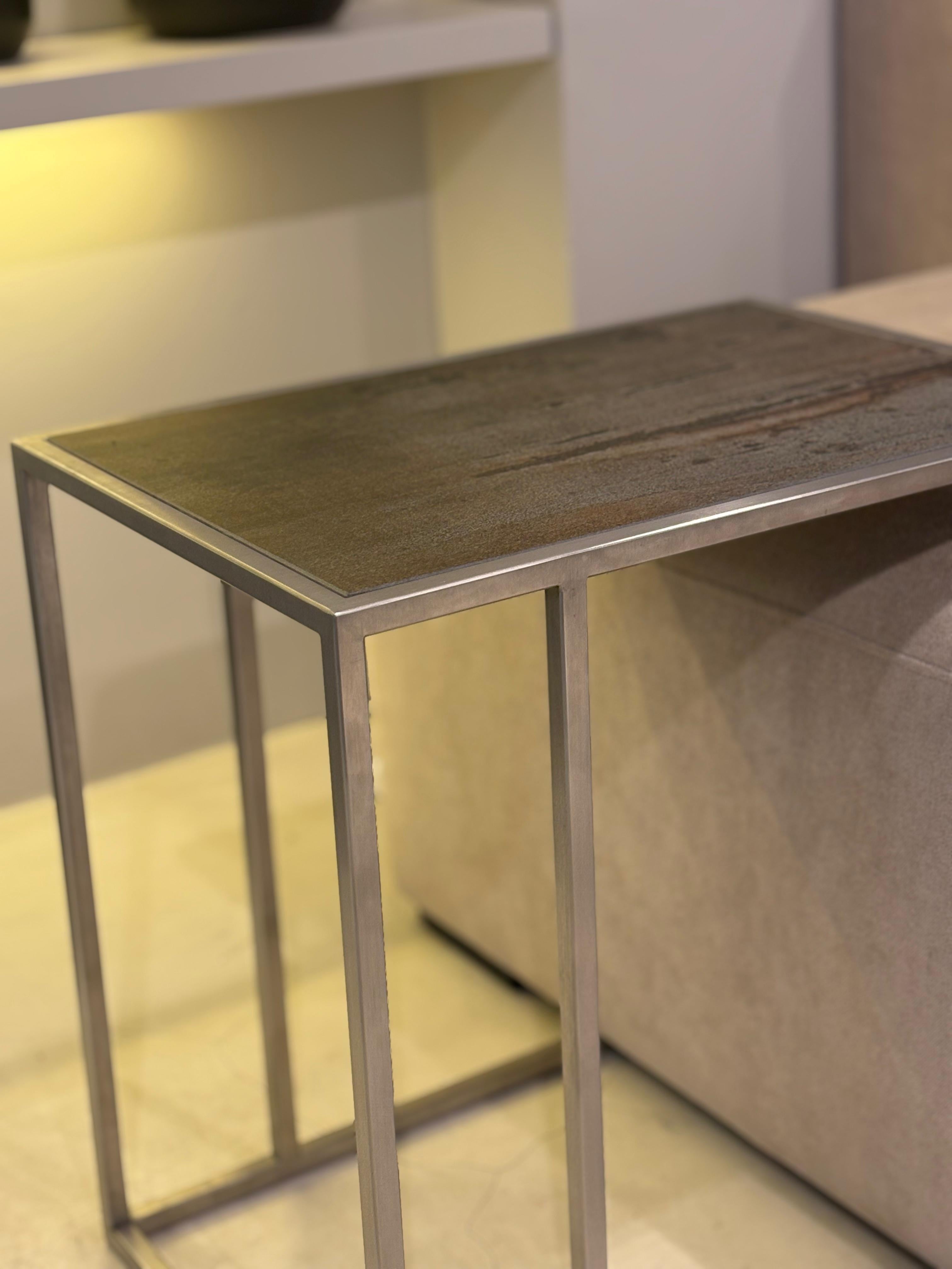 Mesa de Arrime Balen con base en acero satinado y tapa en dekton trilium.