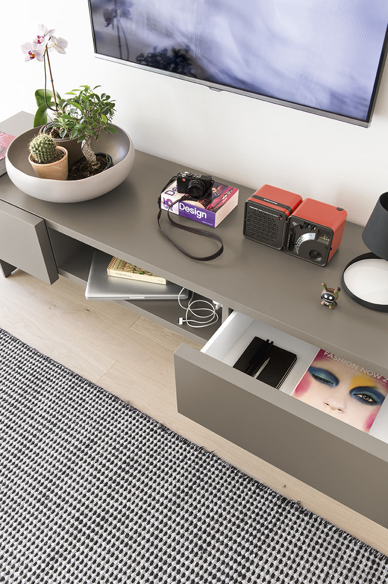 El compartimento central abierto está diseñado con un orificio pasacables para facilitar la conexión de dispositivos multimedia.