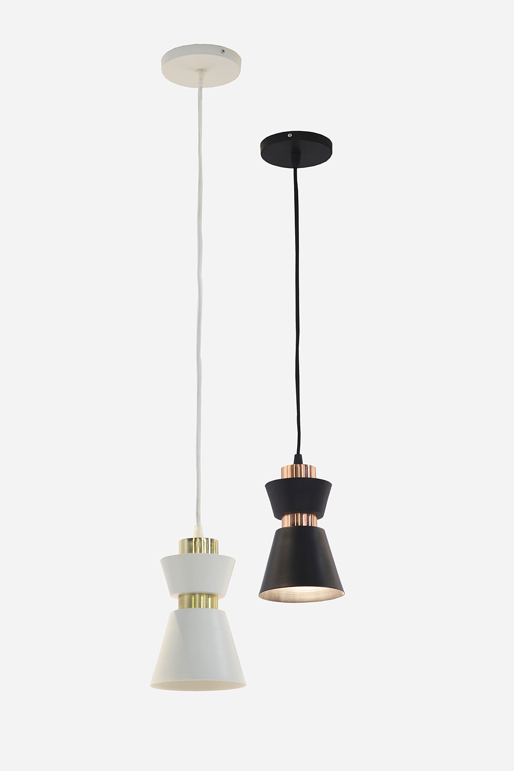 Doble copa de hierro torneado a mano con vaso y aro en combinación. Cable textil y base de una luz torneada por balancín con sistema de ajuste fácil.