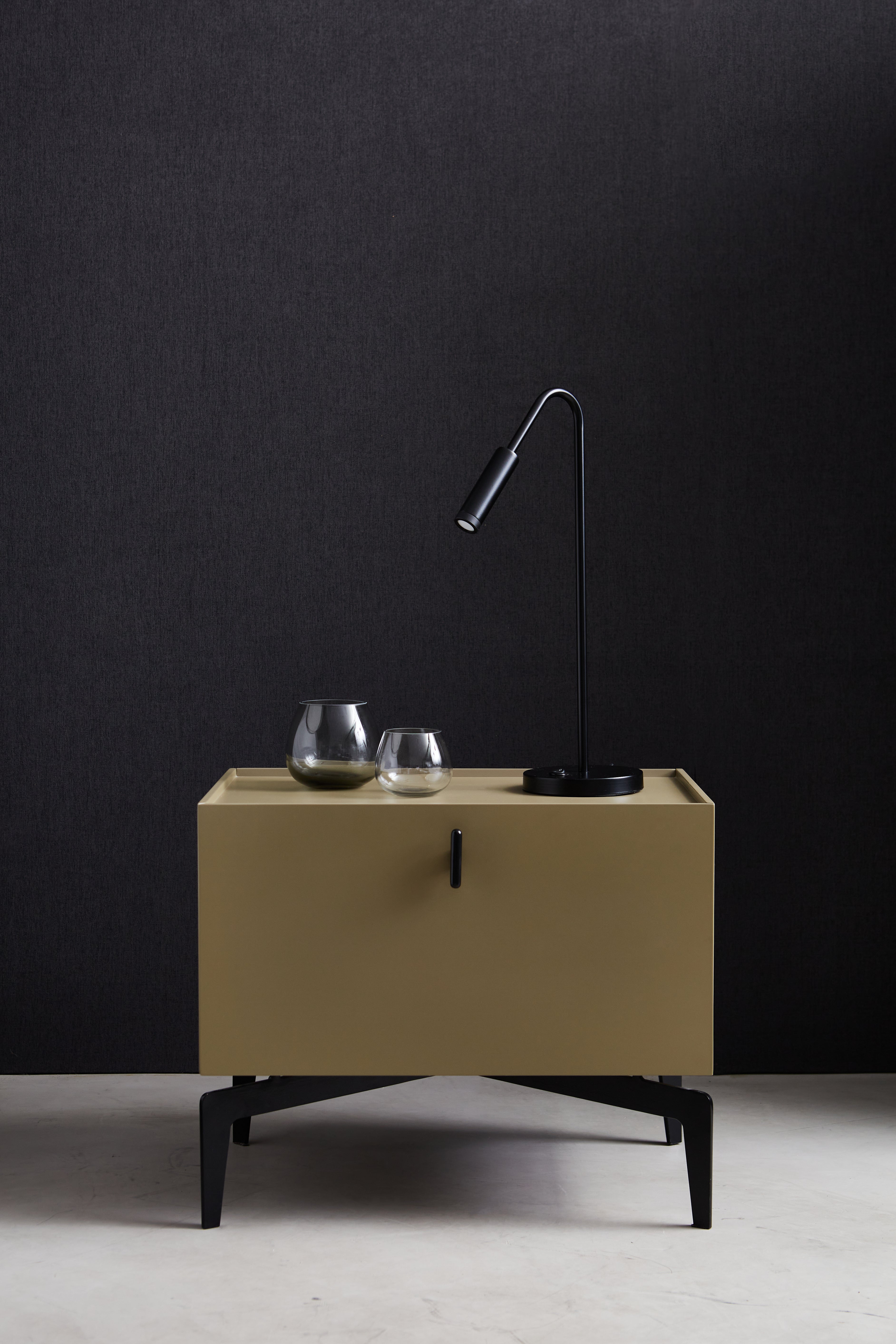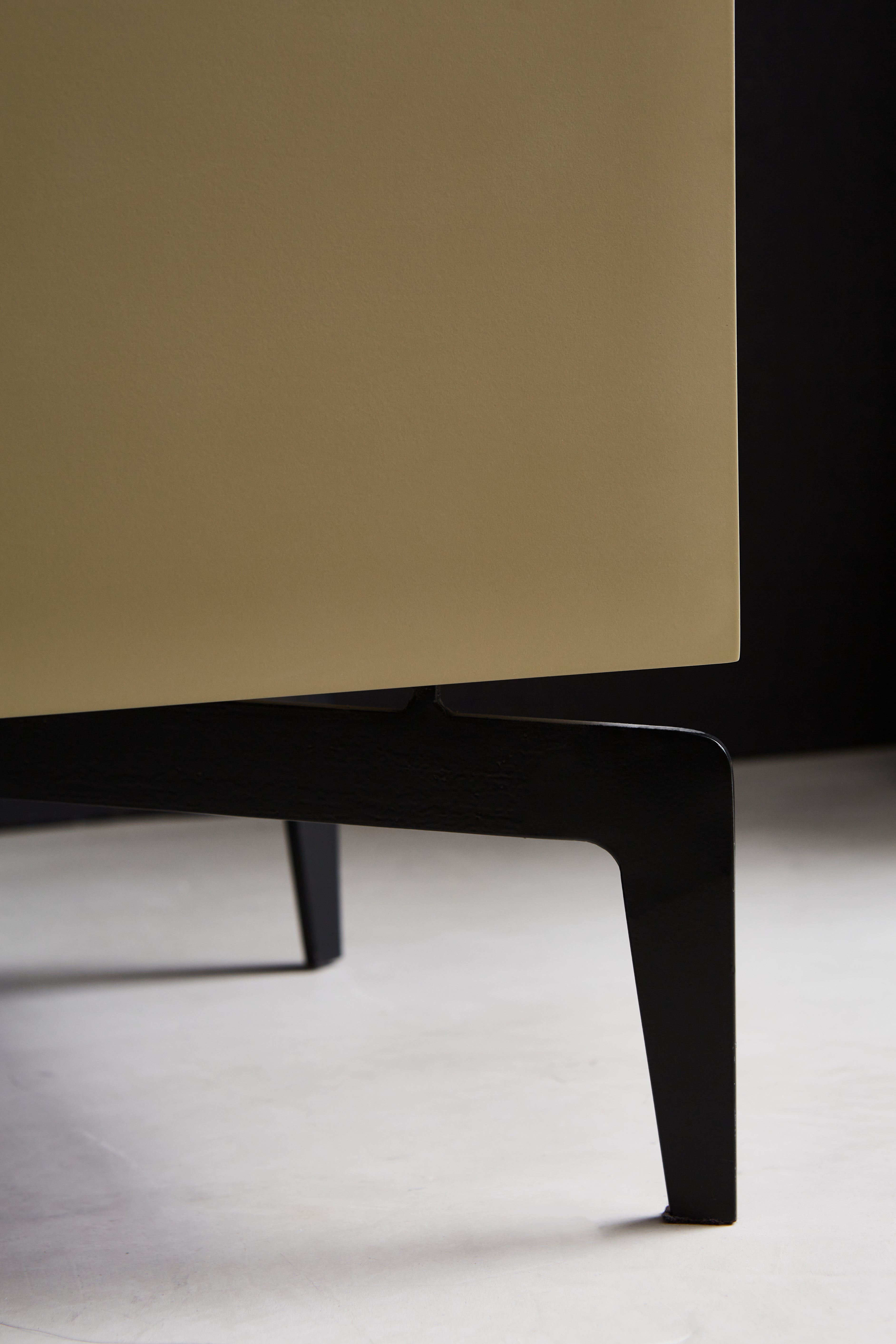 La mesa de noche Rizzo está construida con una cajonera de madera lustrada al poliuretano mate y cierre suave, lo que le da una apariencia moderna y sofisticada. La base de la mesa de noche está hecha de hierro con acabado epoxi en el tono que elijas, lo que proporciona estabilidad y resistencia.