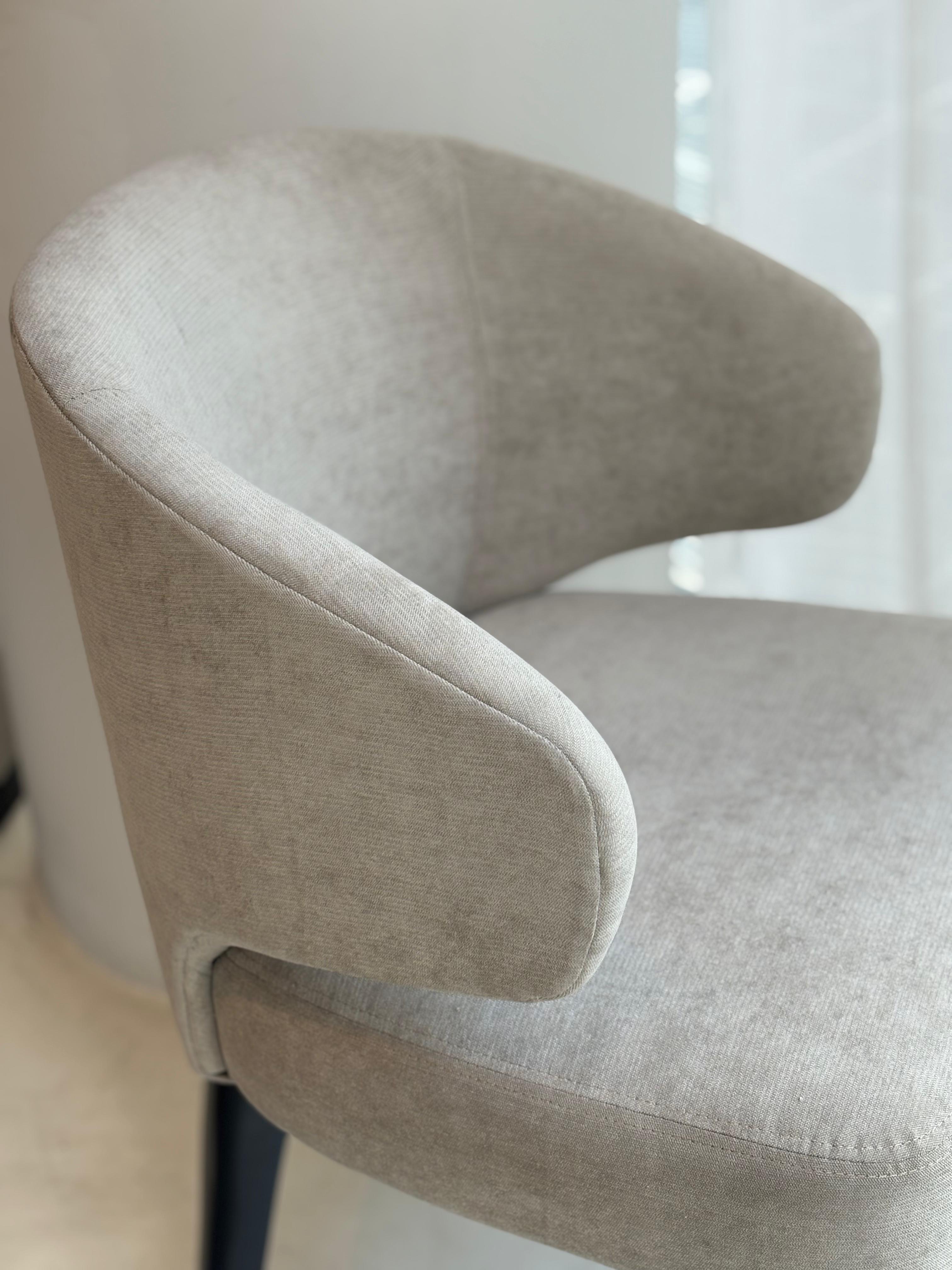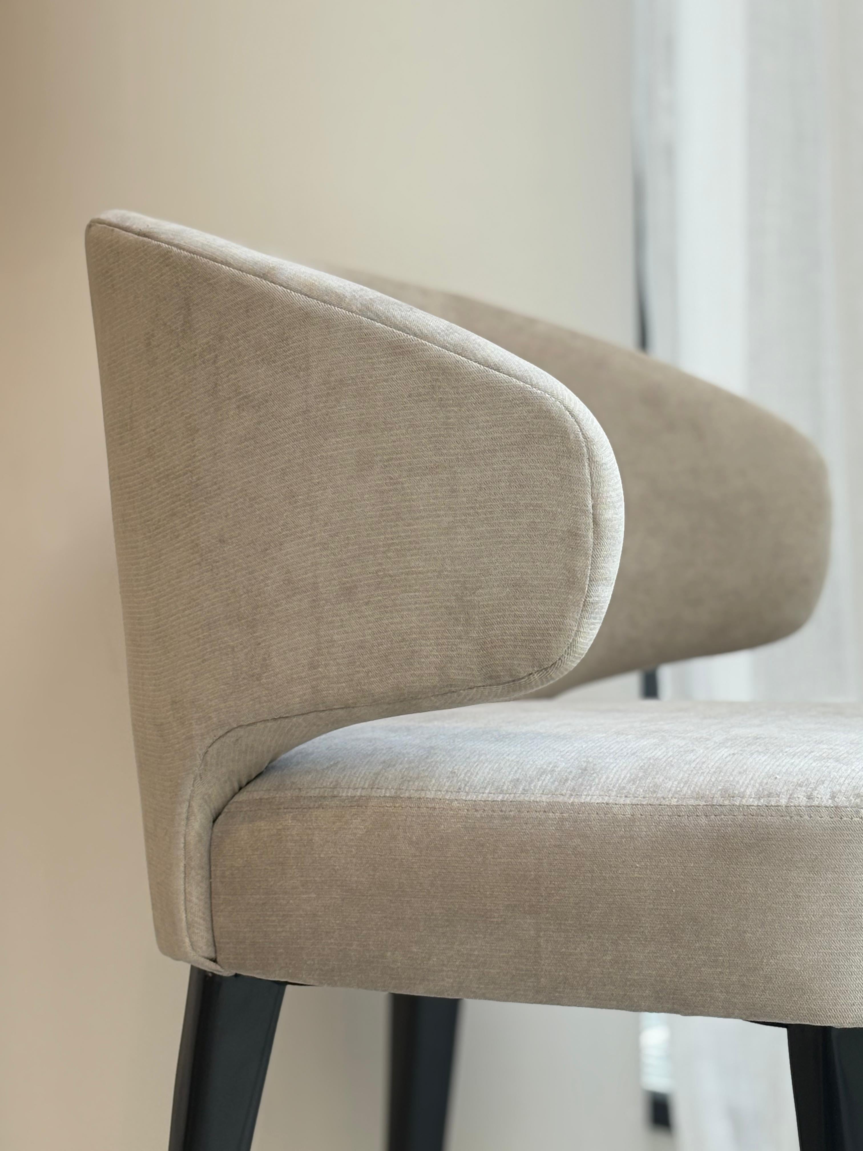 La Silla Luna combina elegancia contemporánea y comodidad envolvente en una pieza versátil y sofisticada. Su respaldo curvo brinda un excelente soporte lumbar y envuelve suavemente la silueta, generando una sensación acogedora al sentarse. Tapizada en una suave tela beige de textura aterciopelada, transmite calidez y refinamiento, mientras que sus patas cónicas en negro aportan contraste y estabilidad.