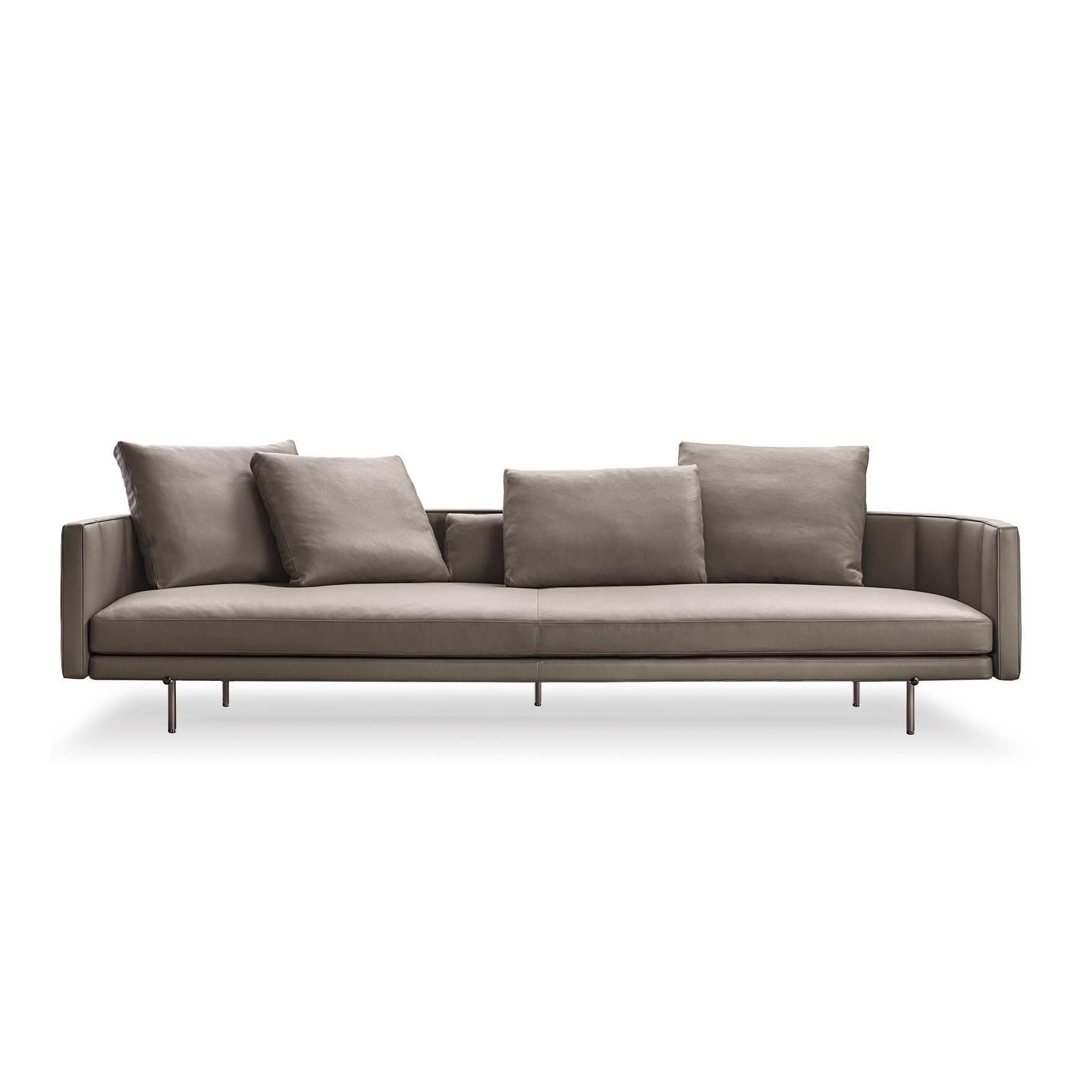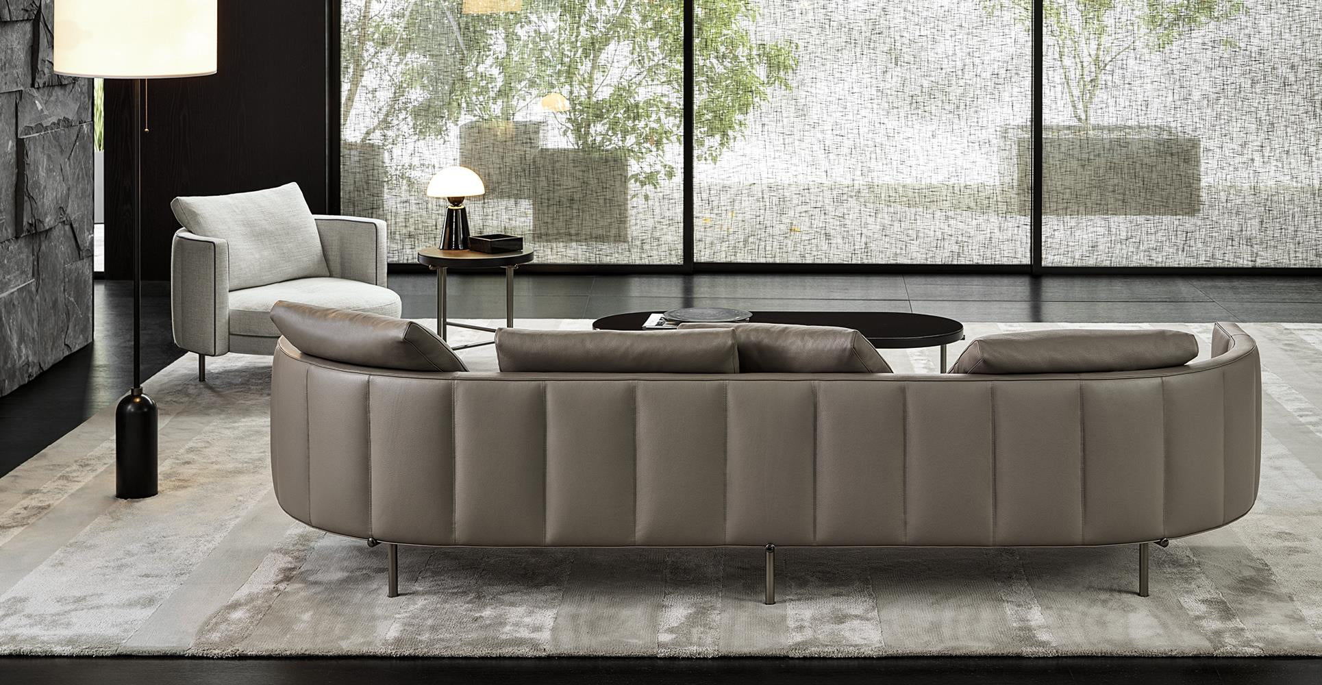 El respaldo, de espesor reducido, está recorrido por un pespunteado de listones verticales y por un ribeteado perimétrico que resaltan el aspecto couture de su confección. Si se asocia con un revestimiento textil, el ribeteado de ecopiel y econobuk se realiza en un color ligeramente contrastante pero en la misma gradación que el tejido, mientras que en presencia de un revestimiento de piel el ribeteado también es de piel, en la misma tonalidad de color. Todos los elementos tapizados del sistema pueden personalizarse seleccionando el revestimiento: totalmente en tejido o en piel o en tejido con base de piel.