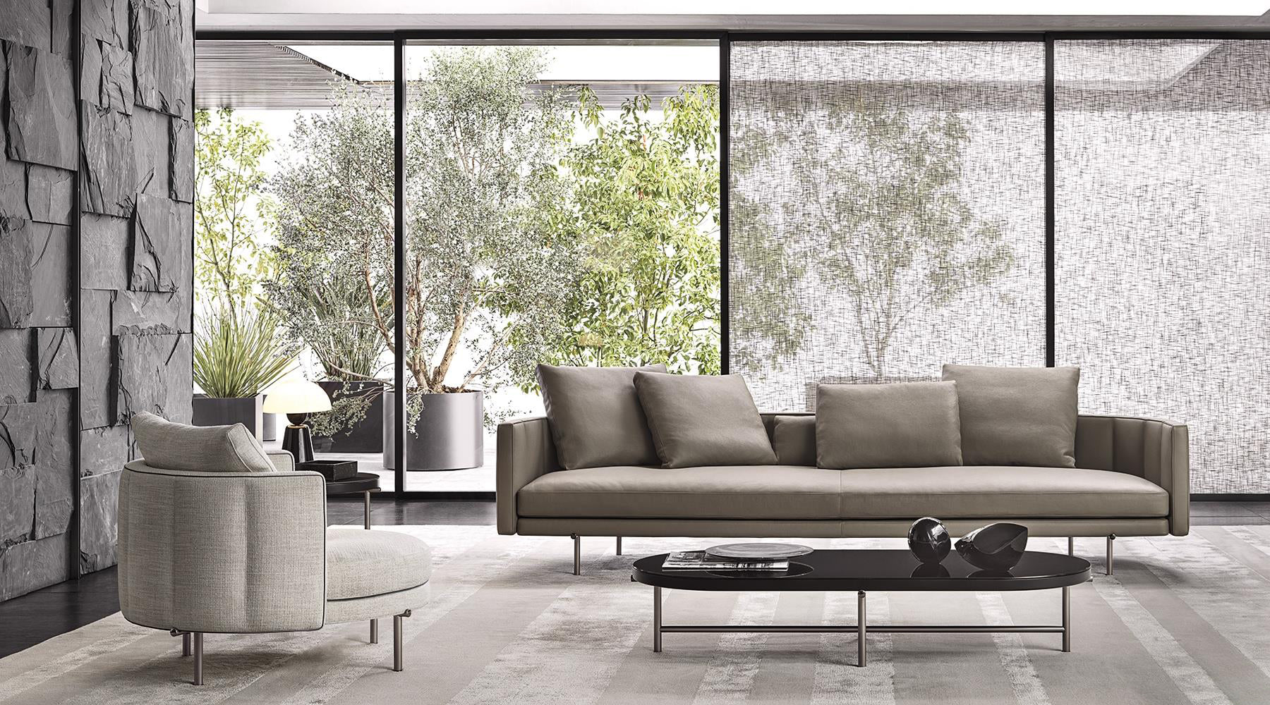 La familia Napoli incluye sofás con respaldo alto o bajo y líneas rectas o redondeadas a la altura de los brazos sofás inclinados con una combinación de dos profundidades diferentes, sillones y butacas para el salón y el comedor, pufs, mesitas bajas y una estilizada consola ovalada que puede colocarse libremente en el salón.