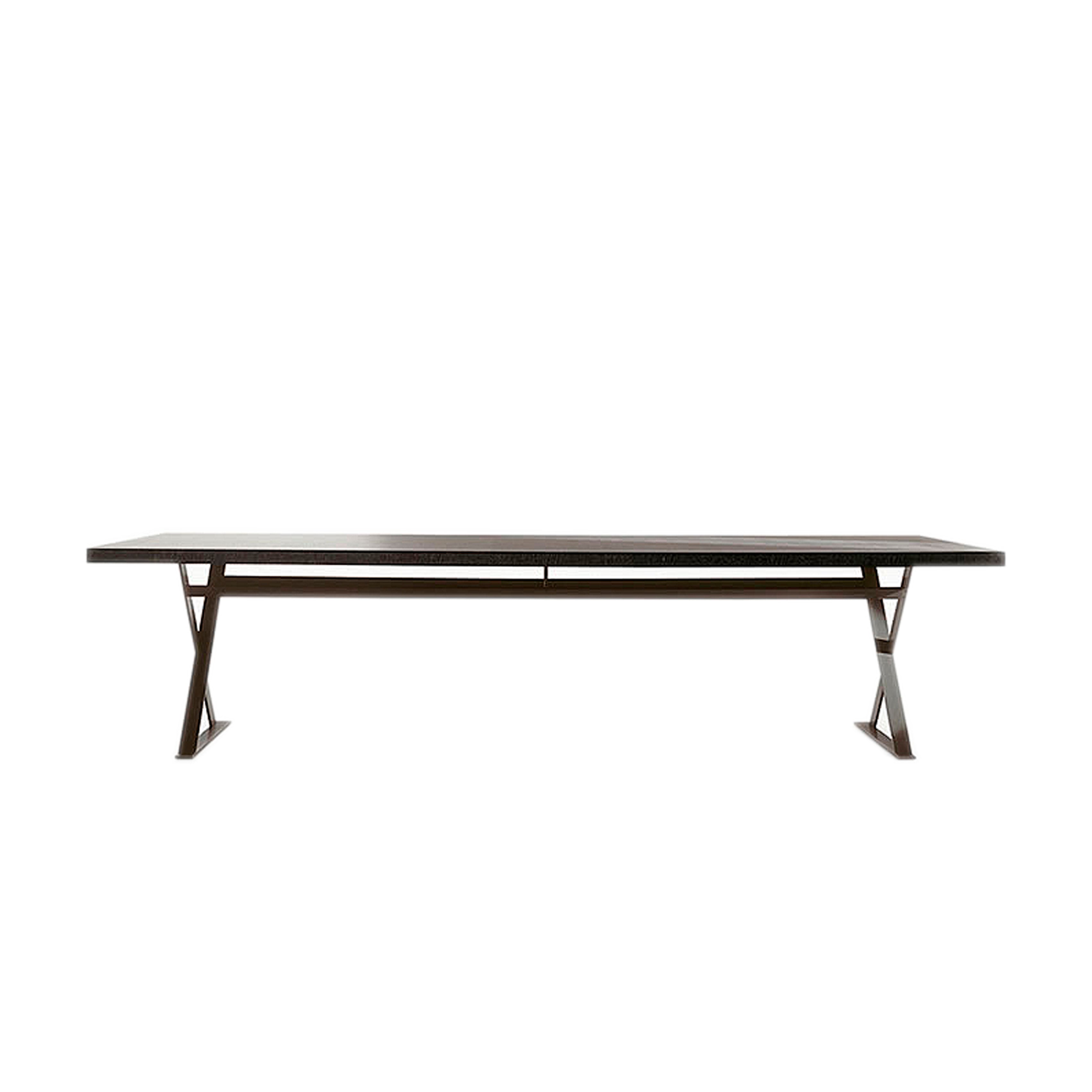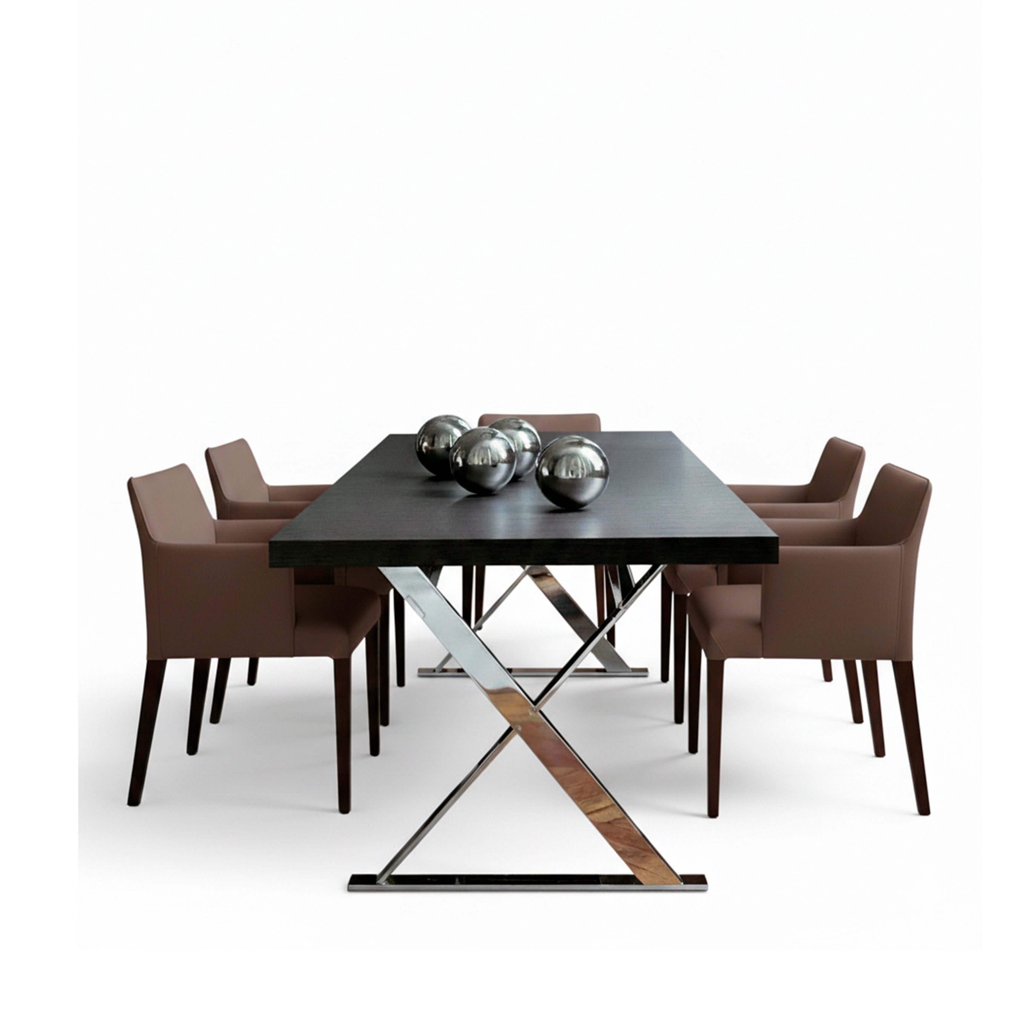 Una mesa de diseño elegante y contrastante. La combinación de una base en acero brillante o satinado, con una tapa de madera lustrada mate crea un aspecto moderno y sofisticado. El contraste entre los acabados y las texturas añade interés visual a la mesa, convirtiéndola en un punto focal en cualquier espacio.
