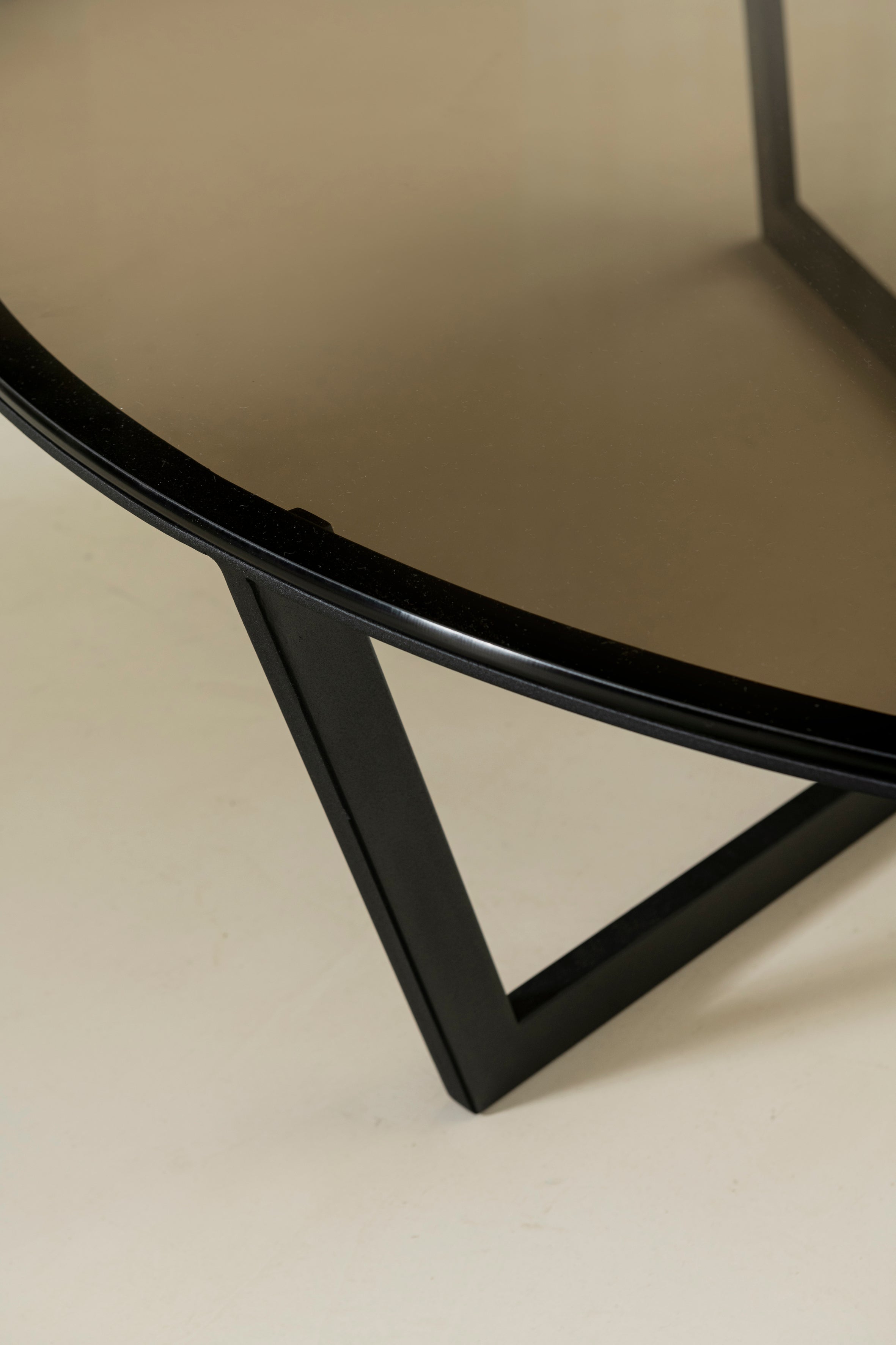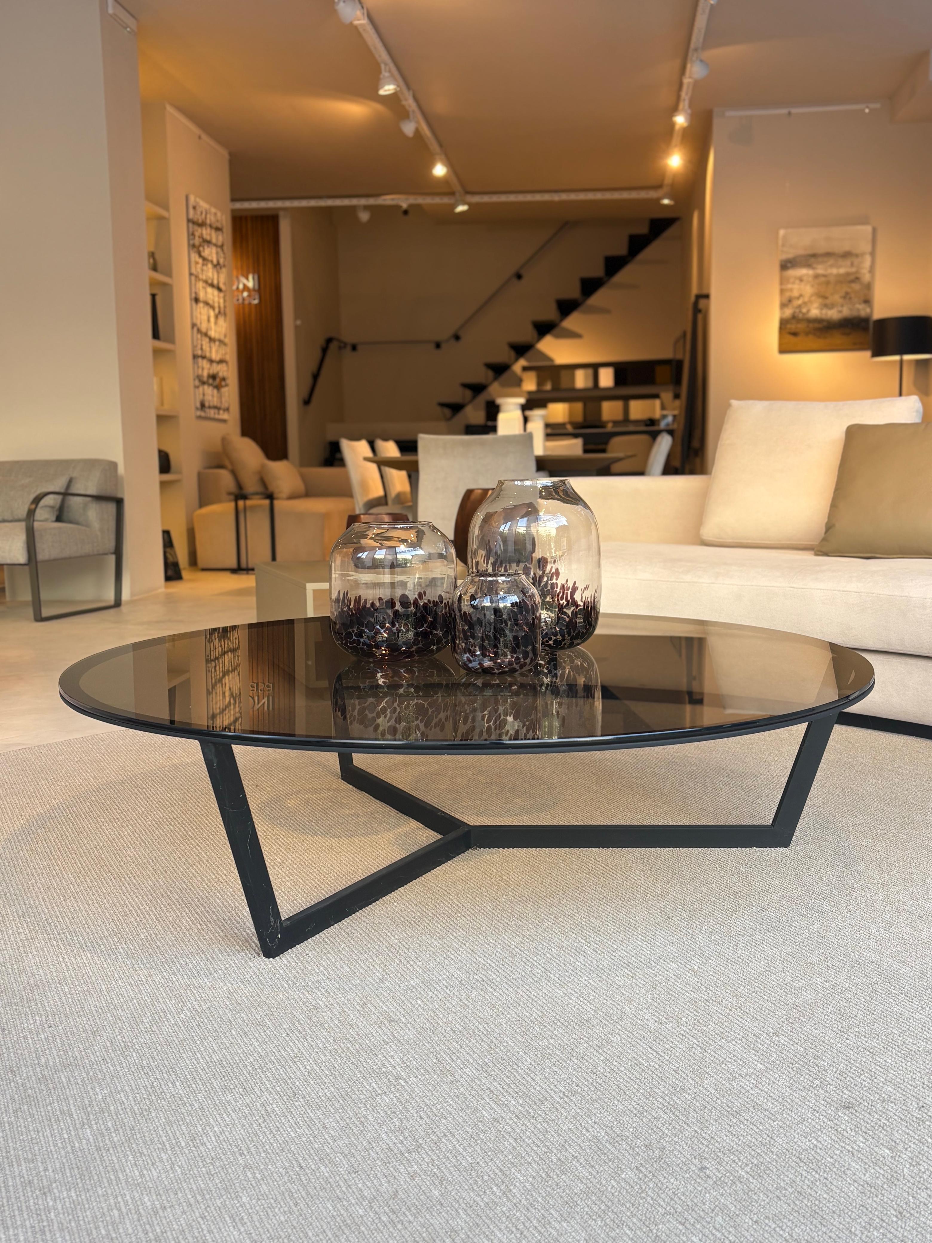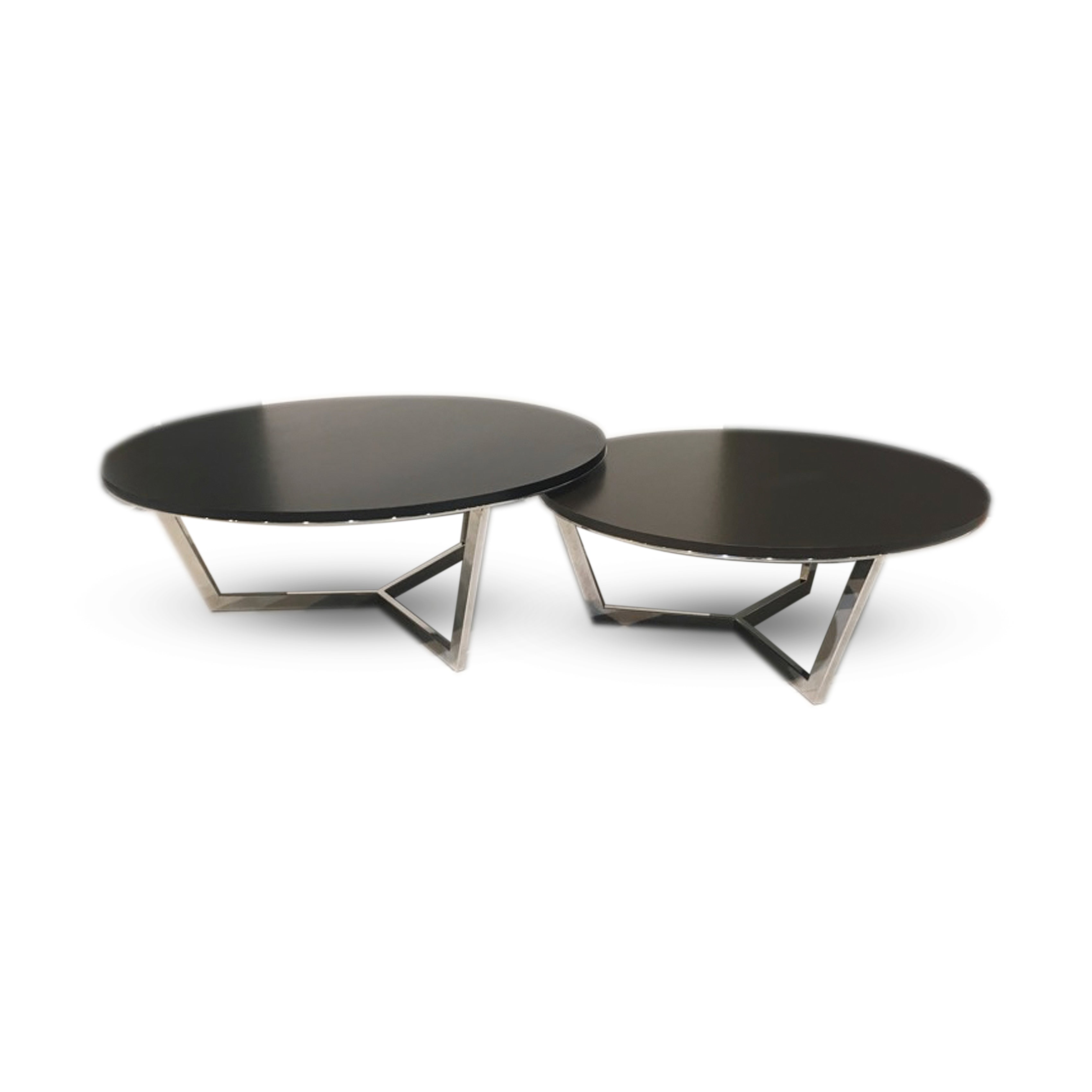 La base se forma por una simple intersección, lo que le confiere solidez y elegancia. La colección incluye mesas de centro redondas en diferentes tamaños y una mesa auxiliar a juego, con acabados que combinan con el resto del mobiliario contemporáneo.