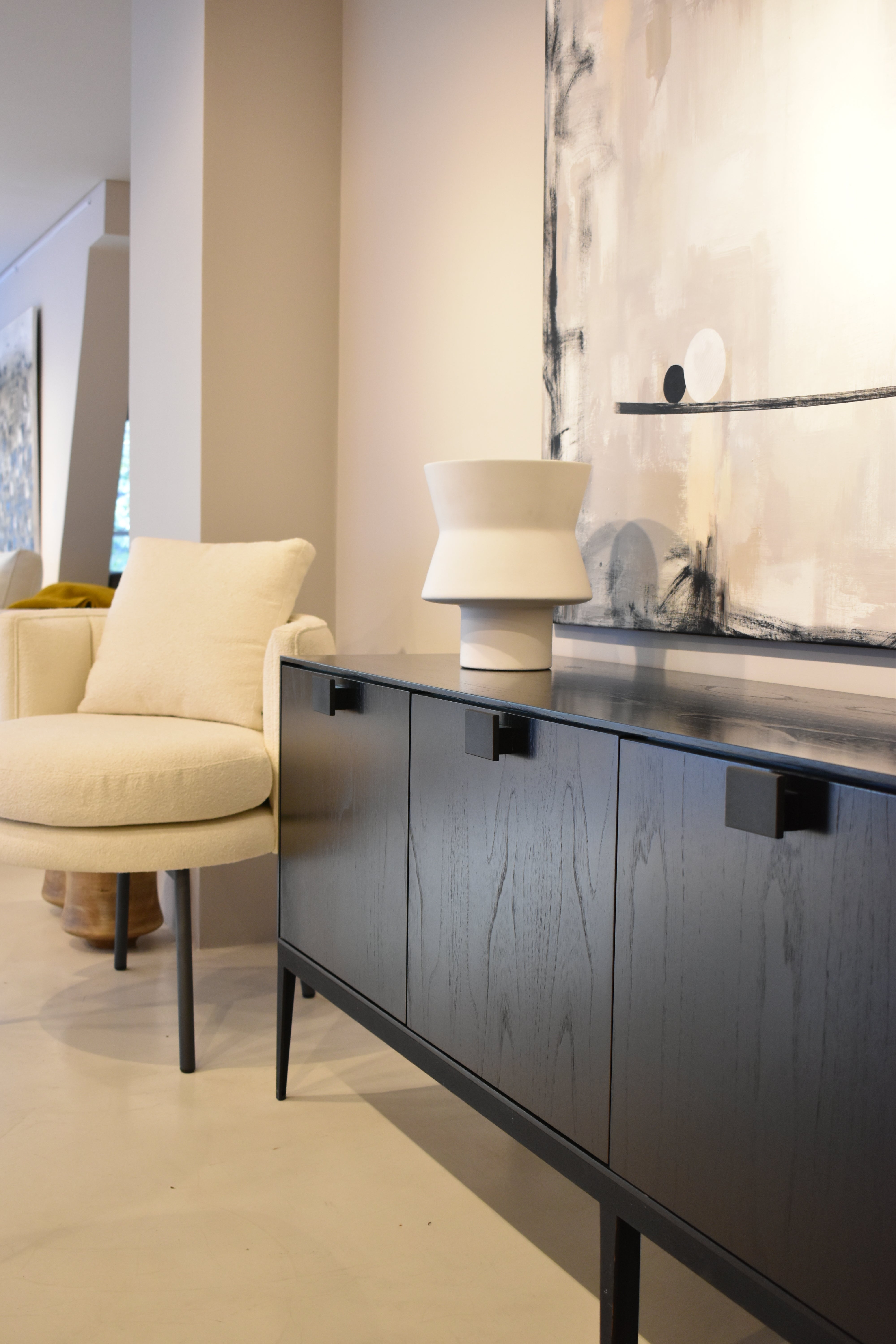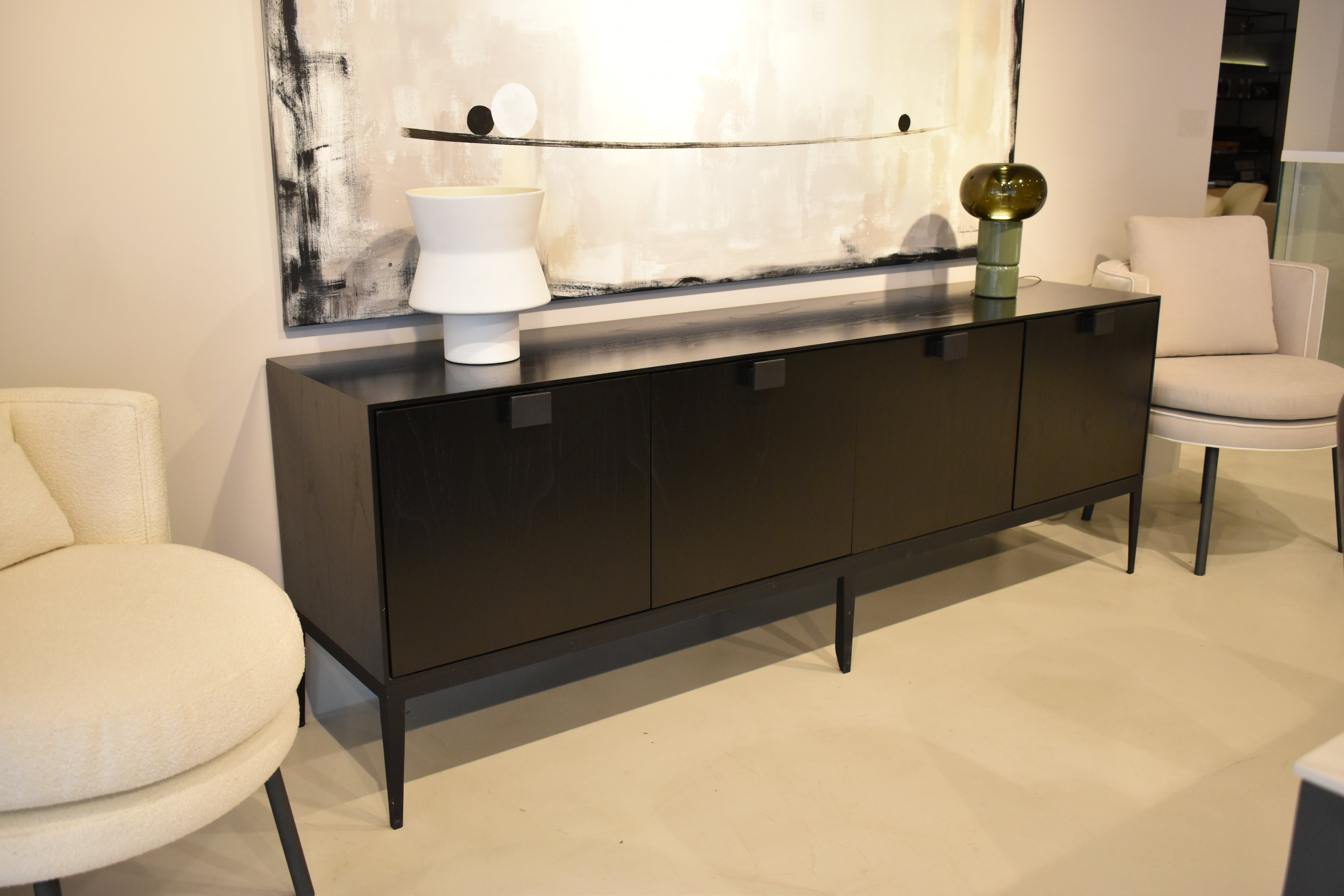 Vajillero Alem con base en hierro microtexturado negro, estructura en madera paraiso poro abierto negro brilloso y un interior en madera laqueada tono rojo.