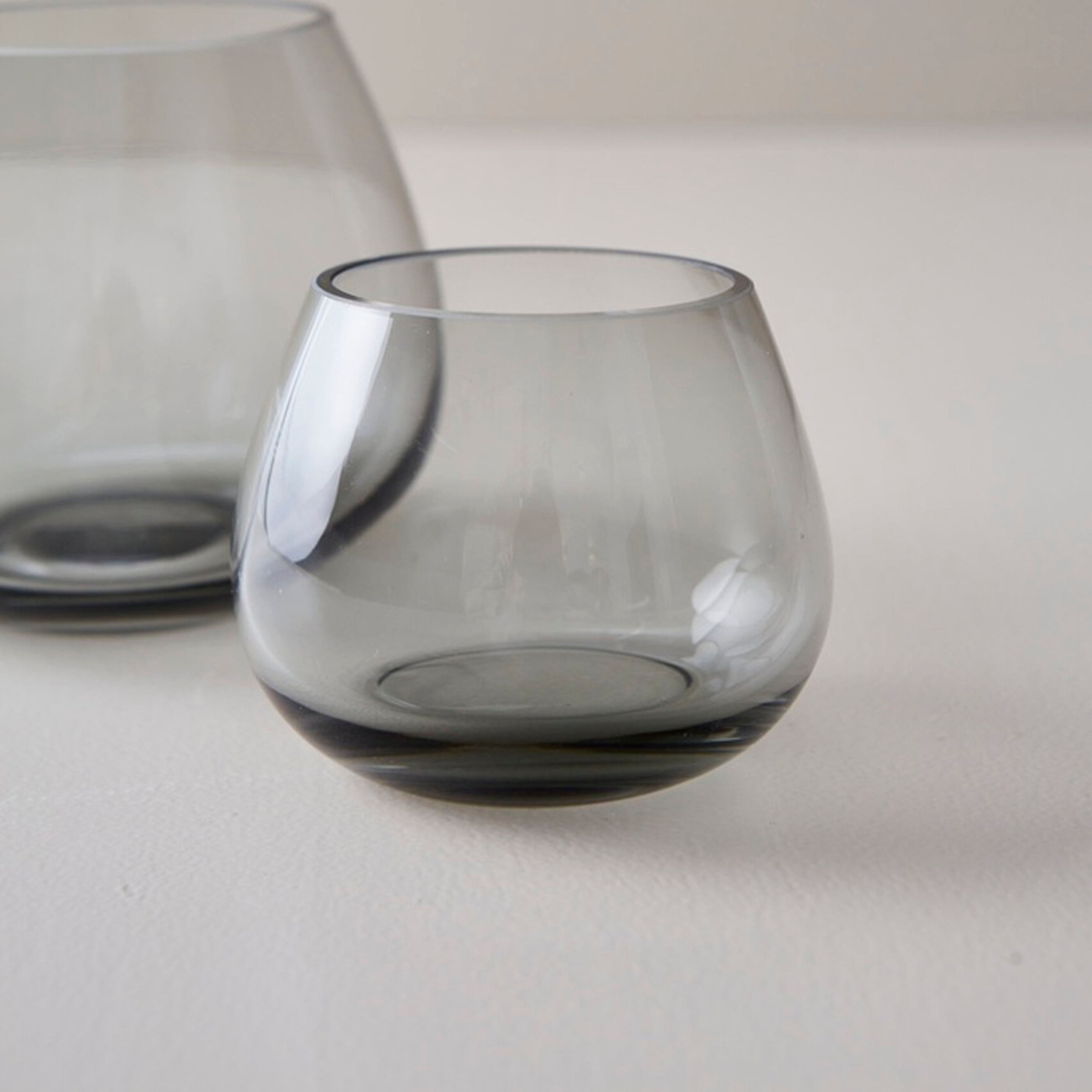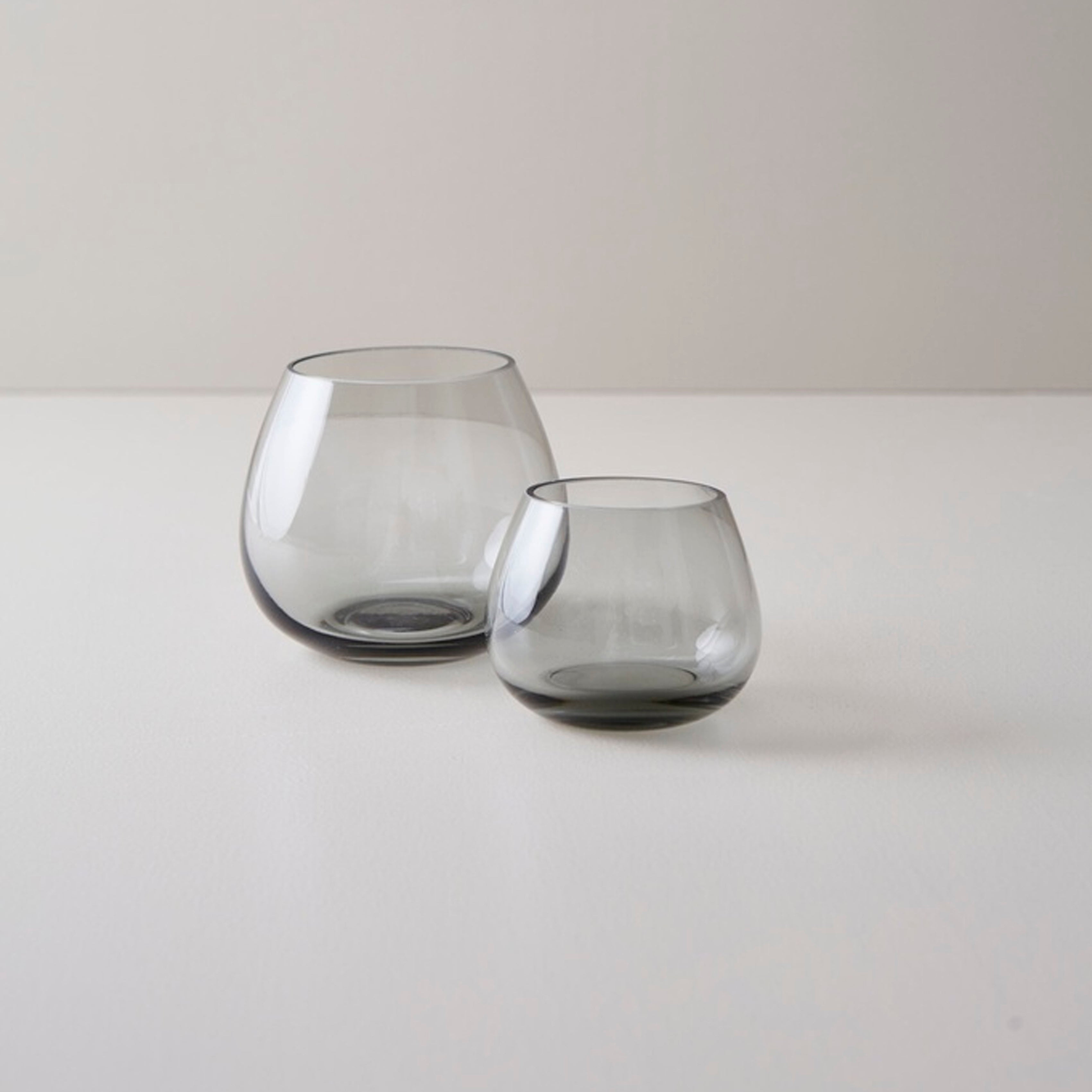 Elegantes jarrones fabricados en vidrio con un acabado en color gris translúcido, perfectos para decorar cualquier espacio con un toque moderno y minimalista. Disponibles en dos tamaños: